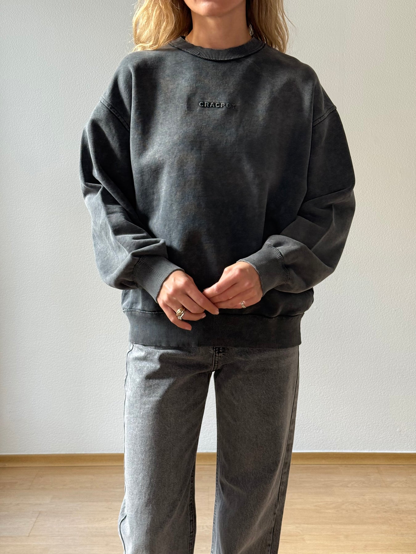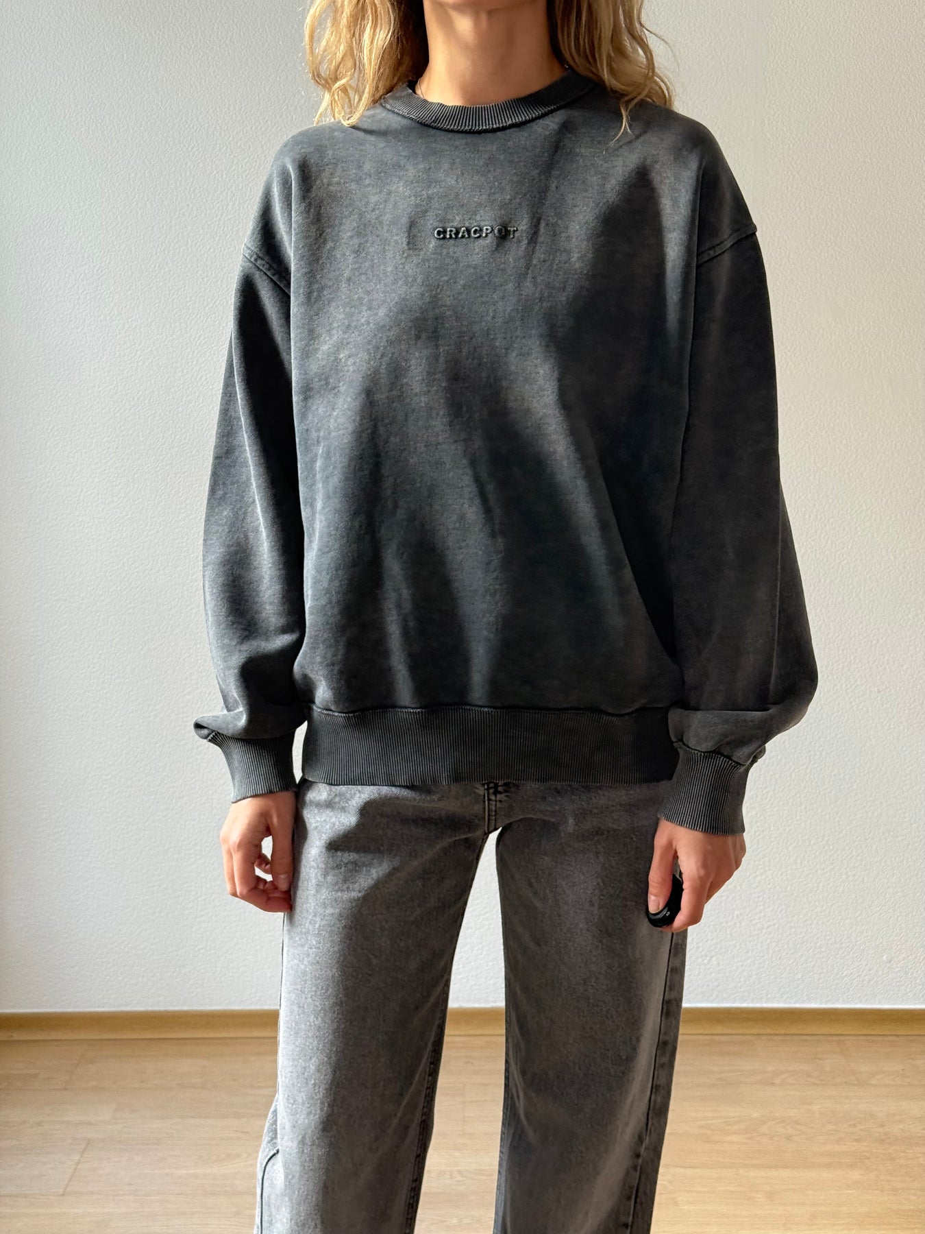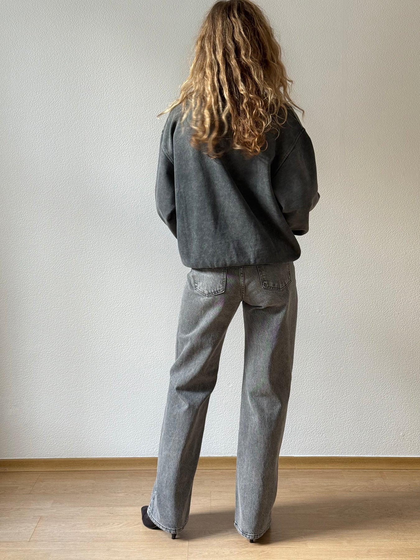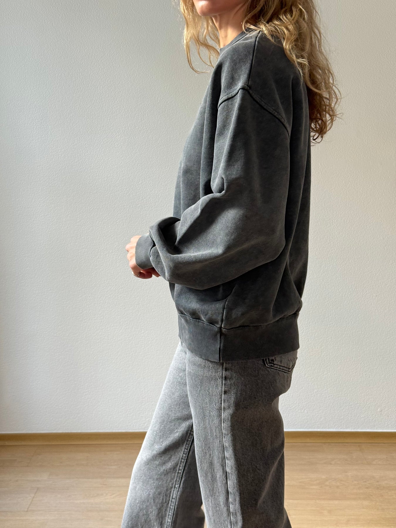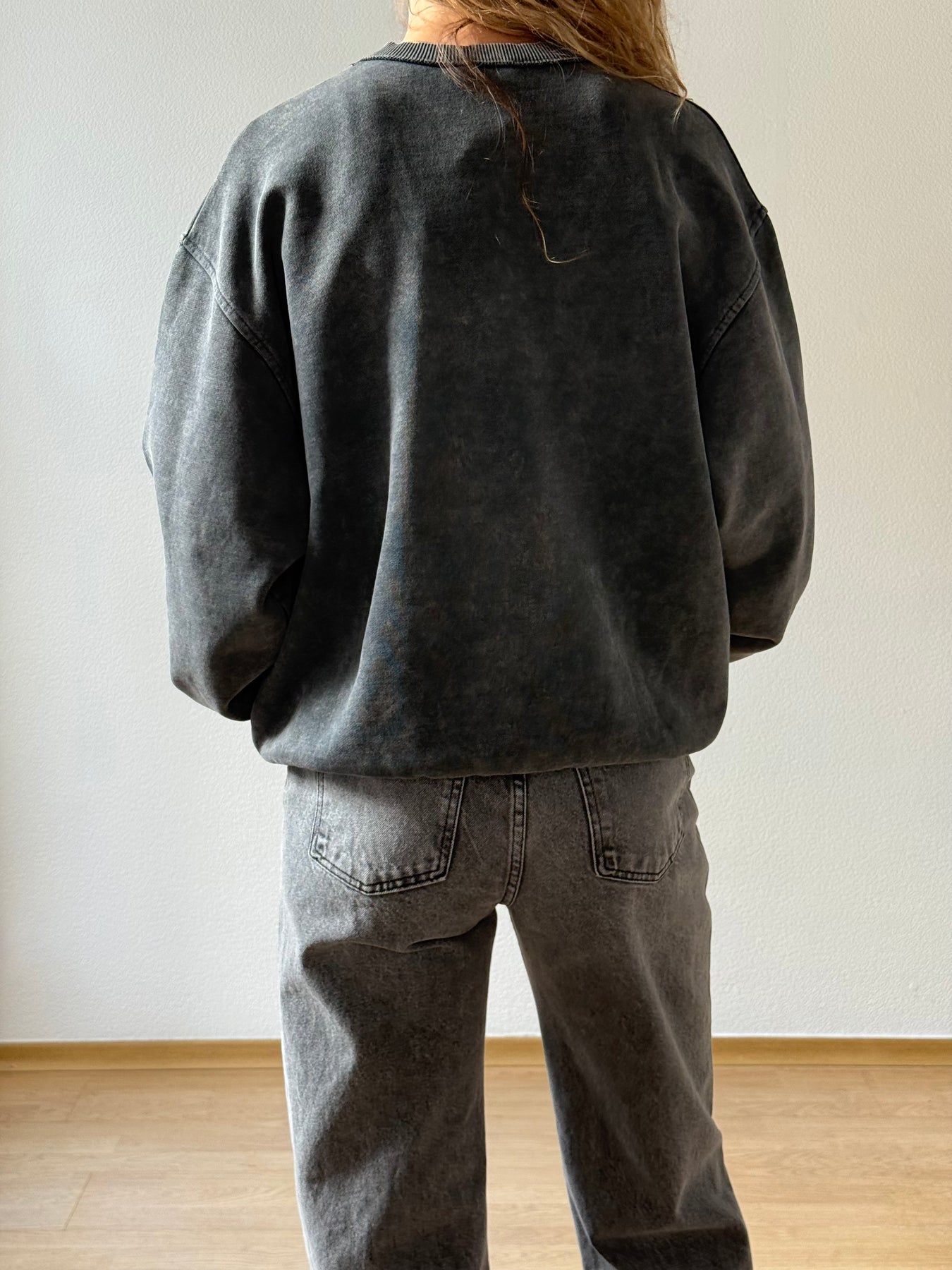 Kokvilnas džemperis ar uzrakstu un apaļu kakla izgriezumu. Garas piedurknes ar pazeminātu plecu daļu. Rievotas apmales. Džemperis ir pustaisna piegriezuma. Džemperis ir lielizmēra, iesakām izvēlēties par vienu izmēru mazāku.