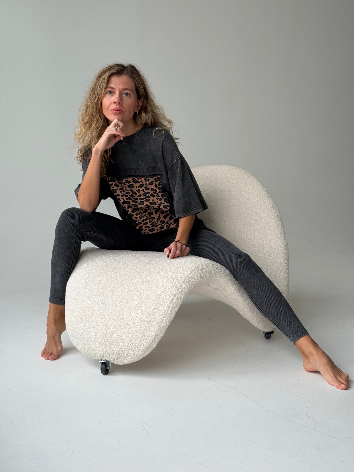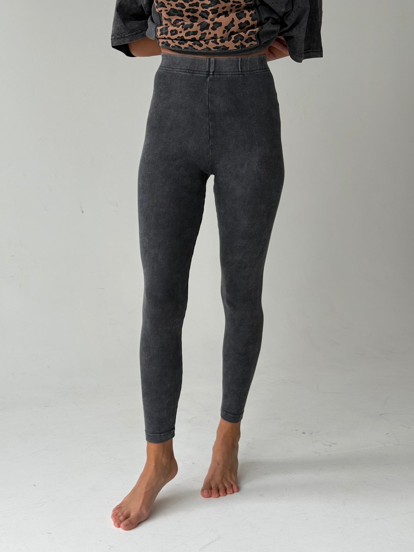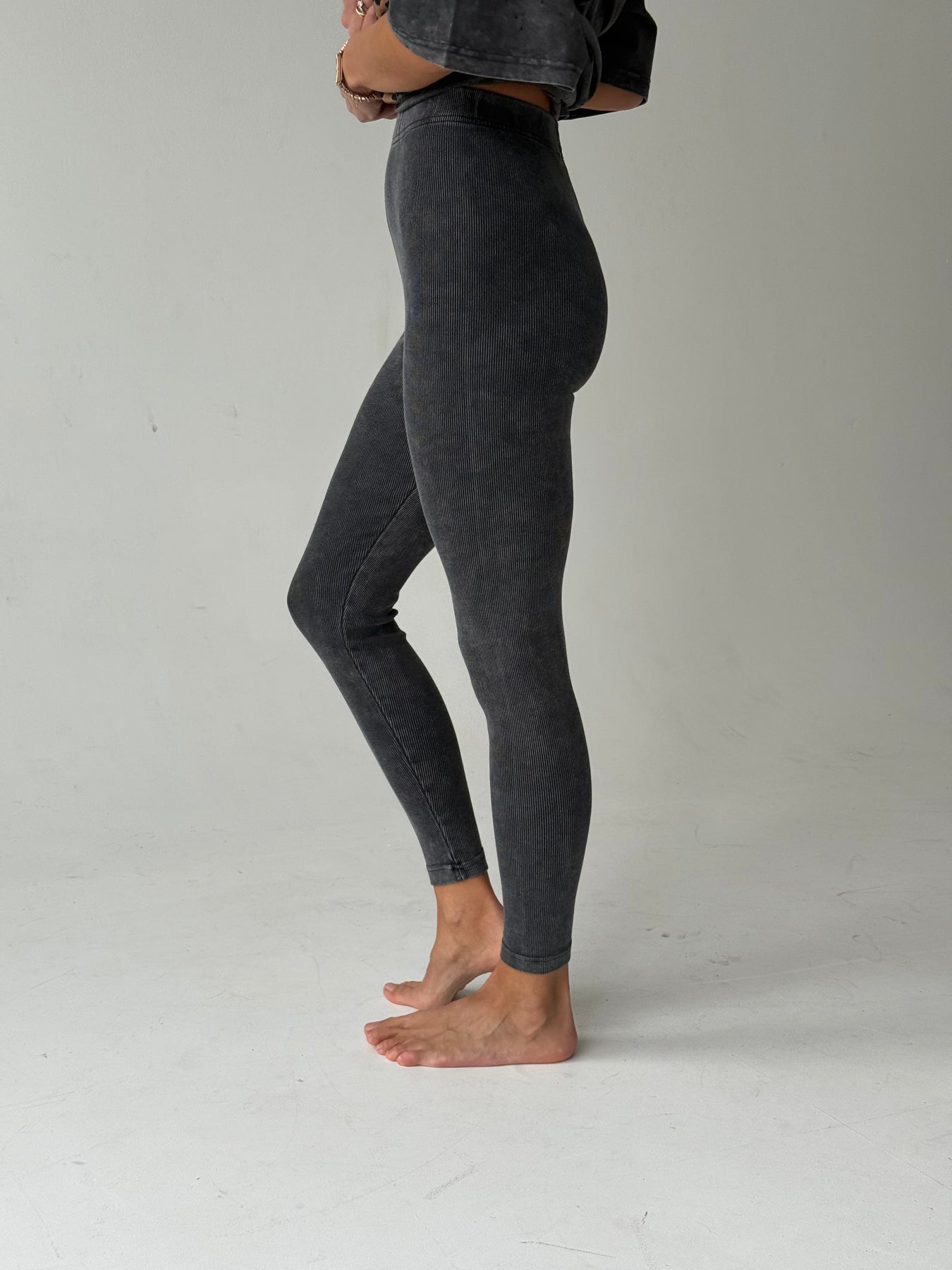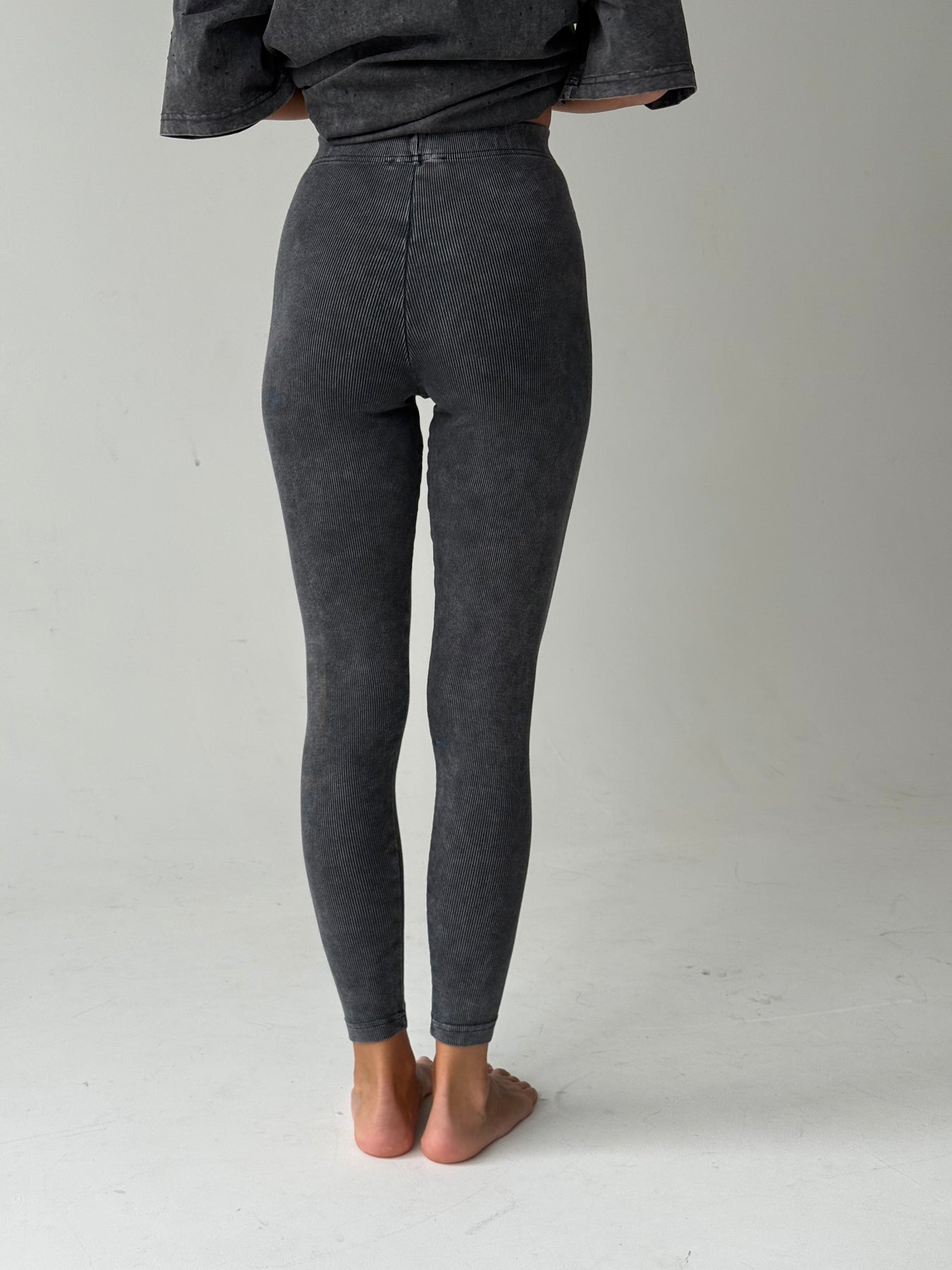 Kokvilnas rievoti legingi ar augstu jostasvietu un balinātu efektu. Legingi ir no elastīga un mīksta auduma. Legingi ir pieguļoša piegriezuma.