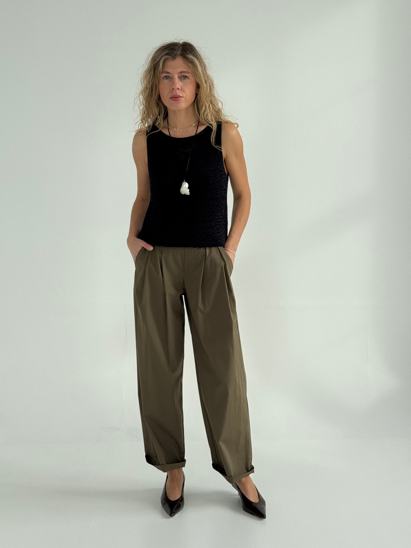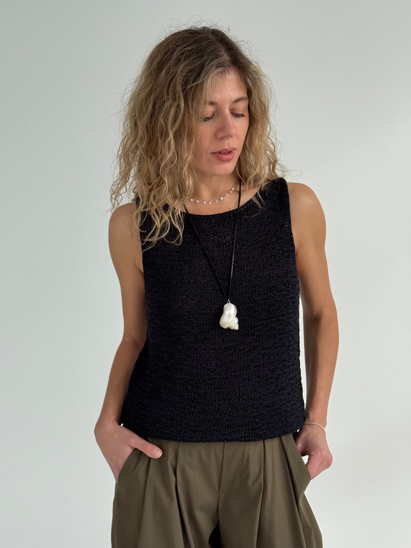 Adīts kokvilnas tops ar apaļu kakla izgriezumu. Tops ir no mīksta un elastīga auduma. Tops ir puspieguļoša piegriezuma.