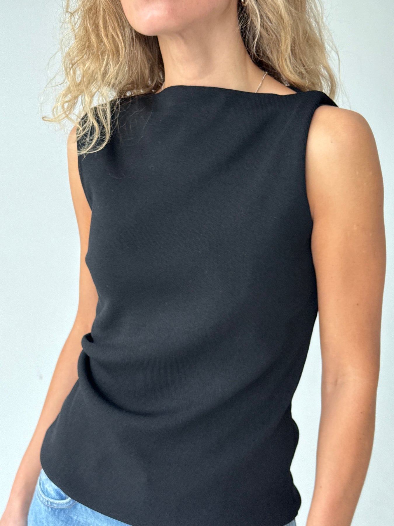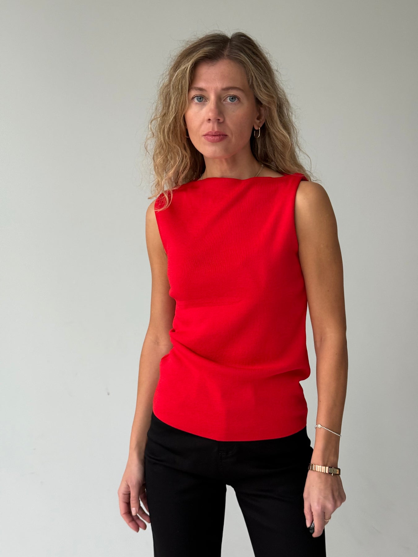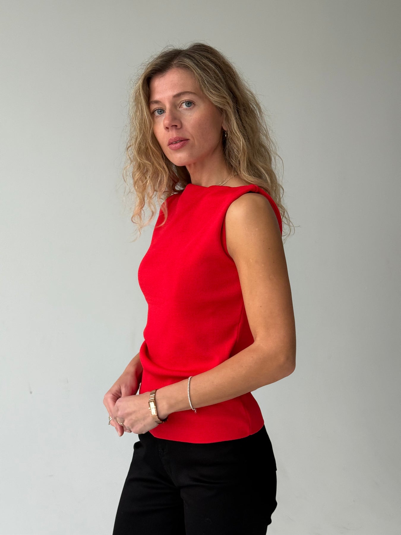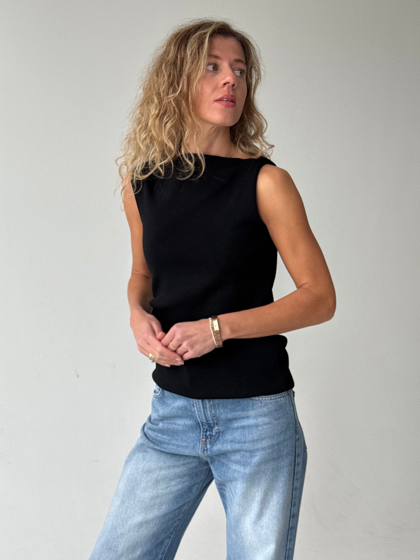 Adīts krokots viskozes tops ar laivas kakla izgriezumu. Tops ir pieguļoša piegriezuma. Tops ir no mīksta un elastīga auduma.