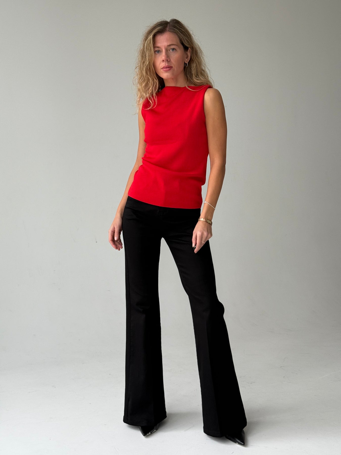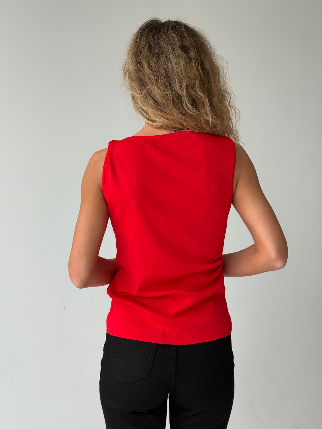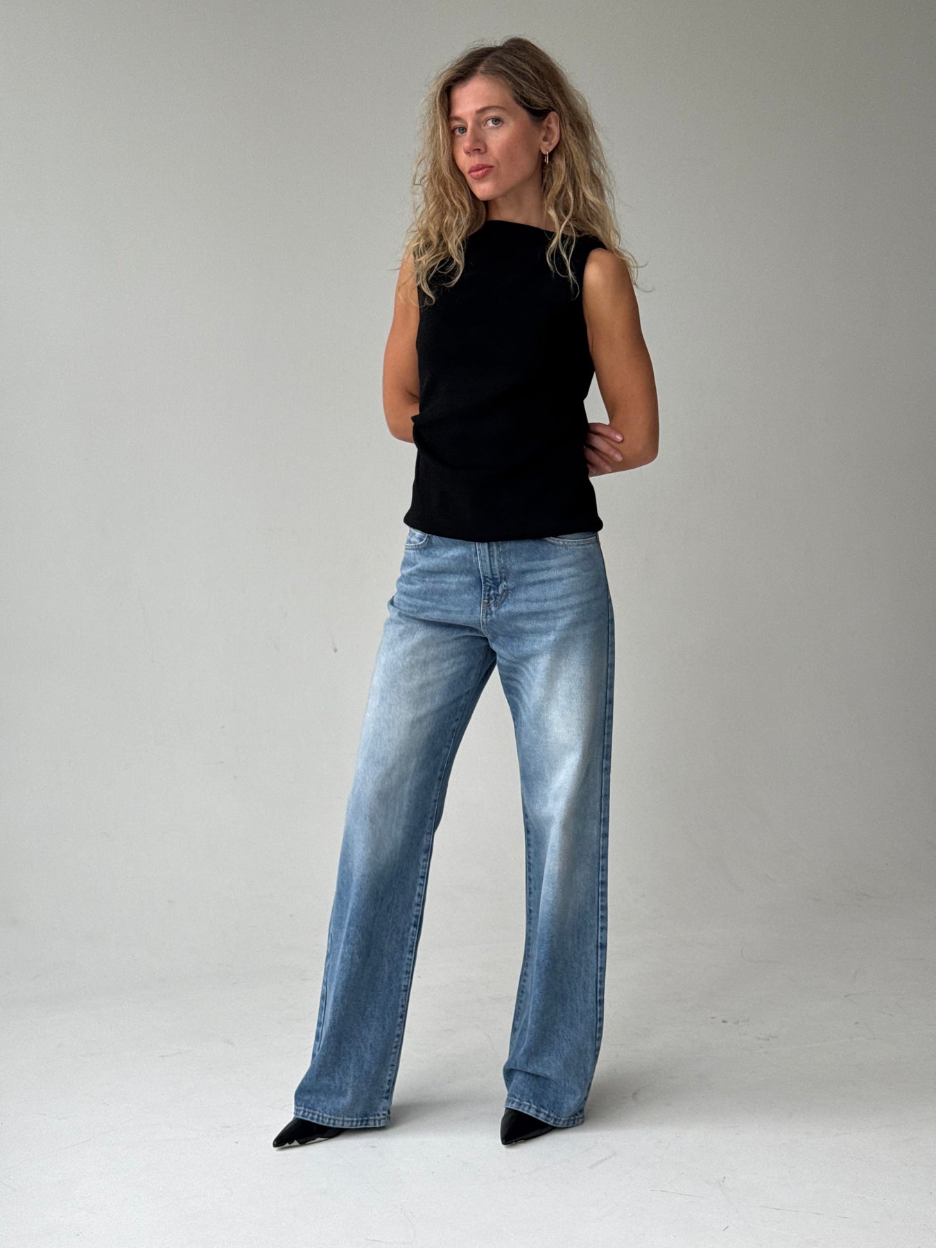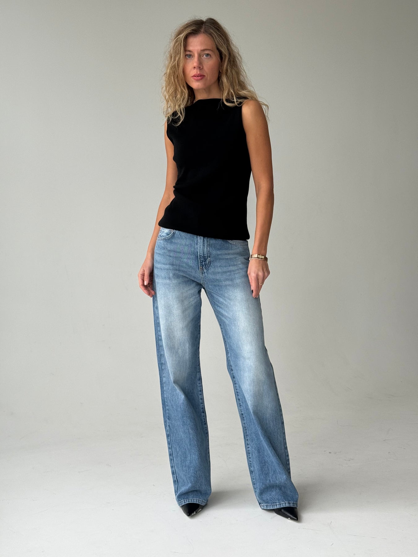 Adīts krokots viskozes tops ar laivas kakla izgriezumu. Tops ir pieguļoša piegriezuma. Tops ir no mīksta un elastīga auduma.