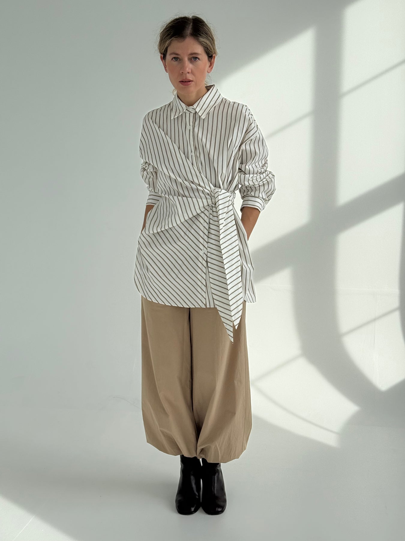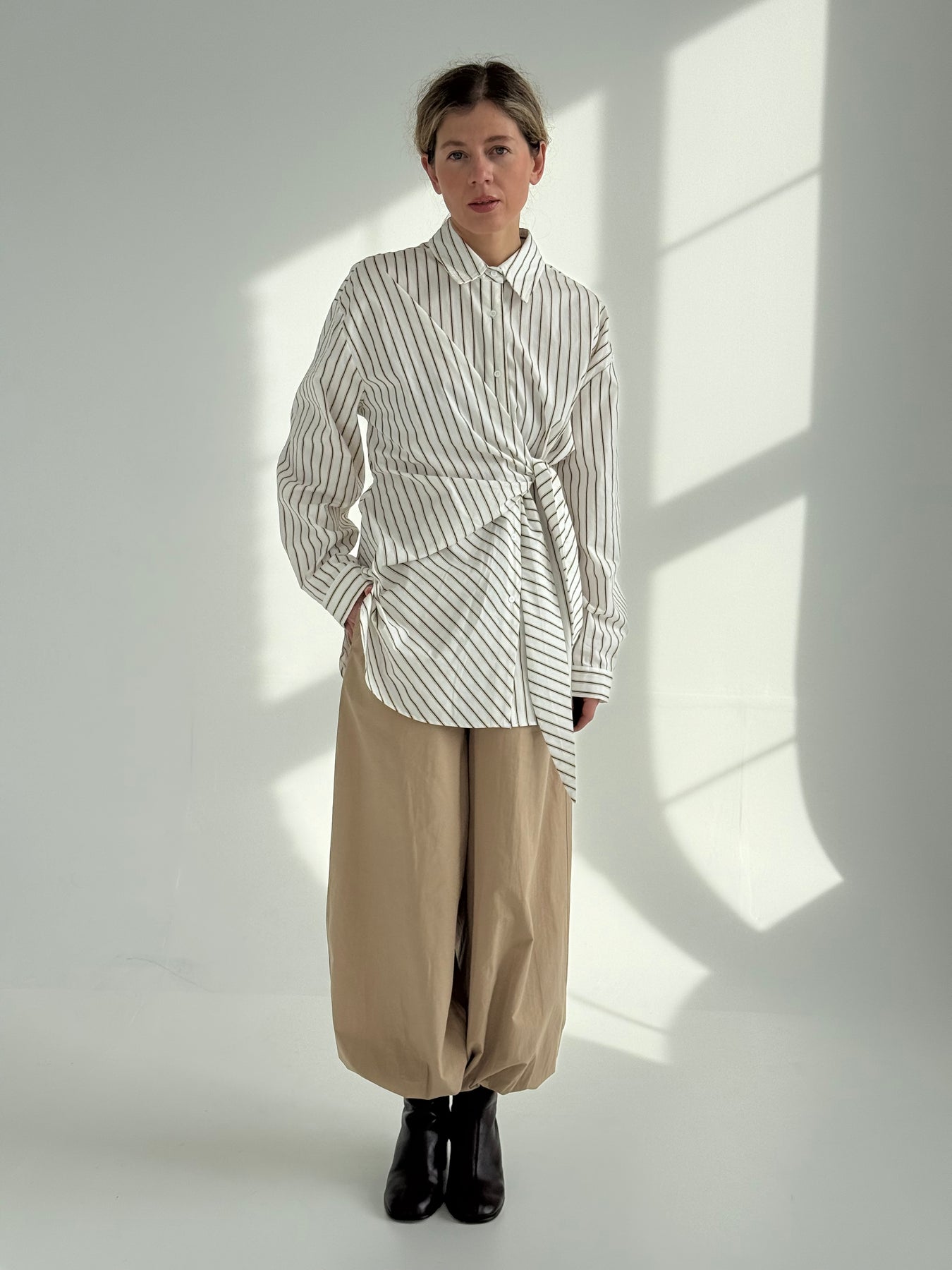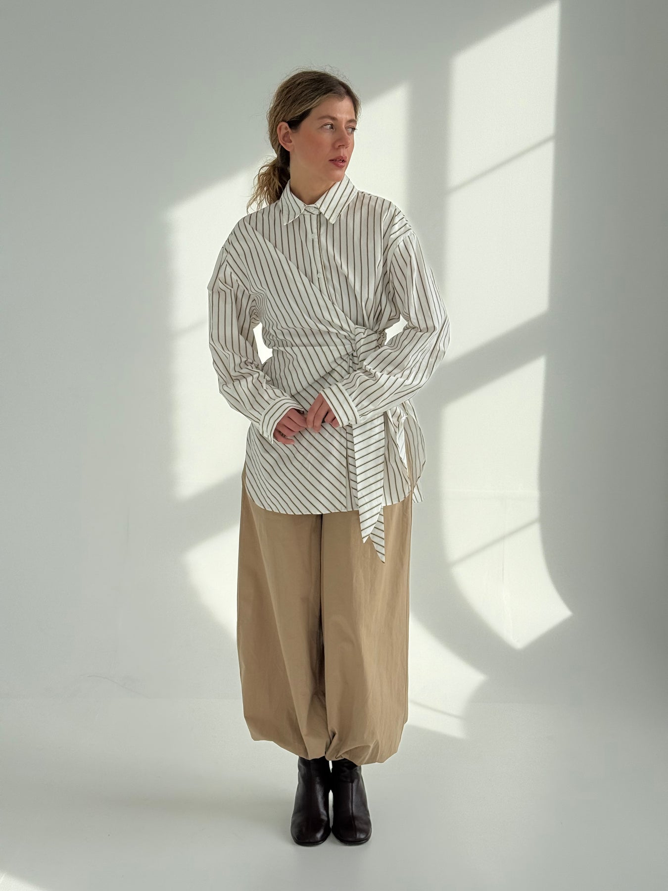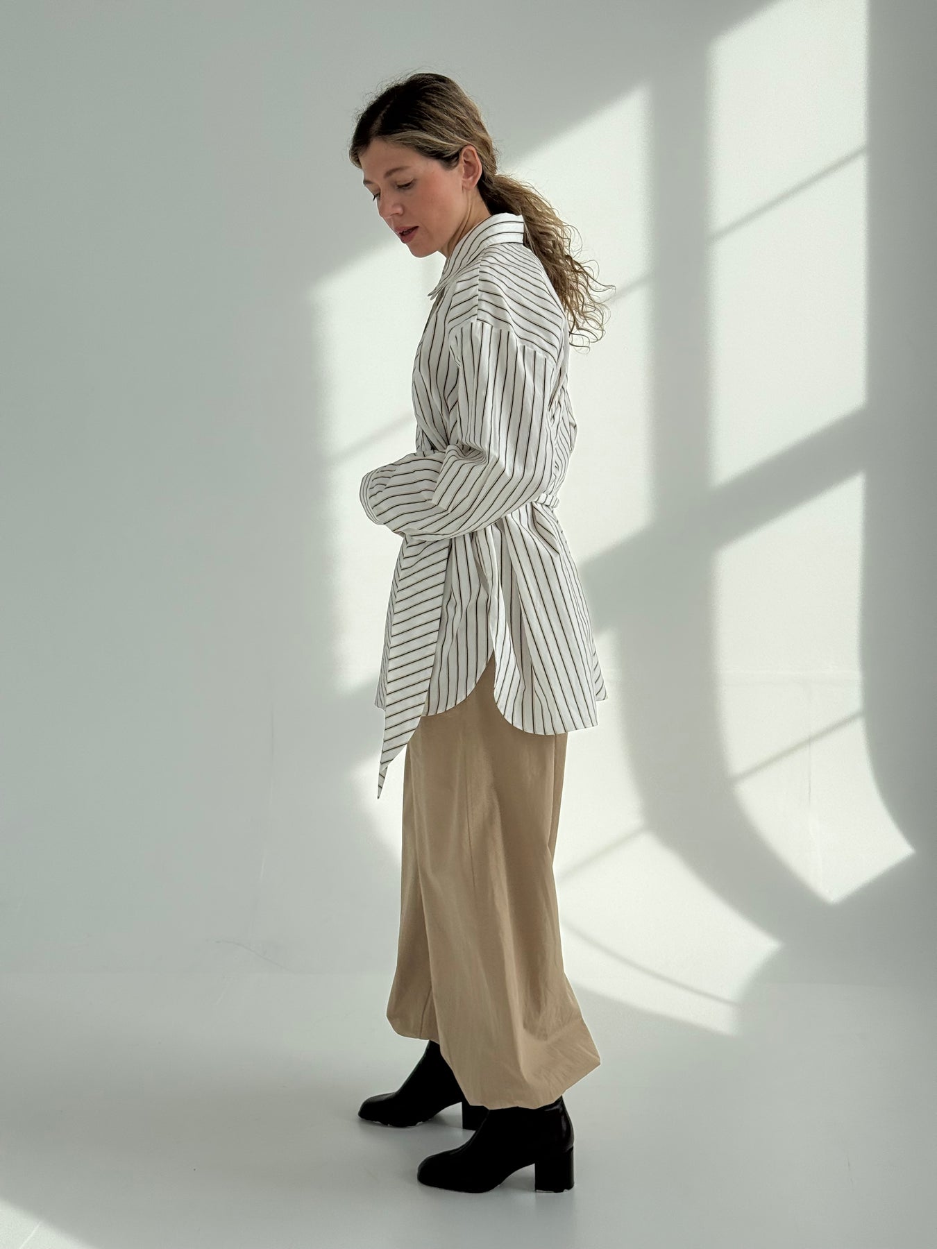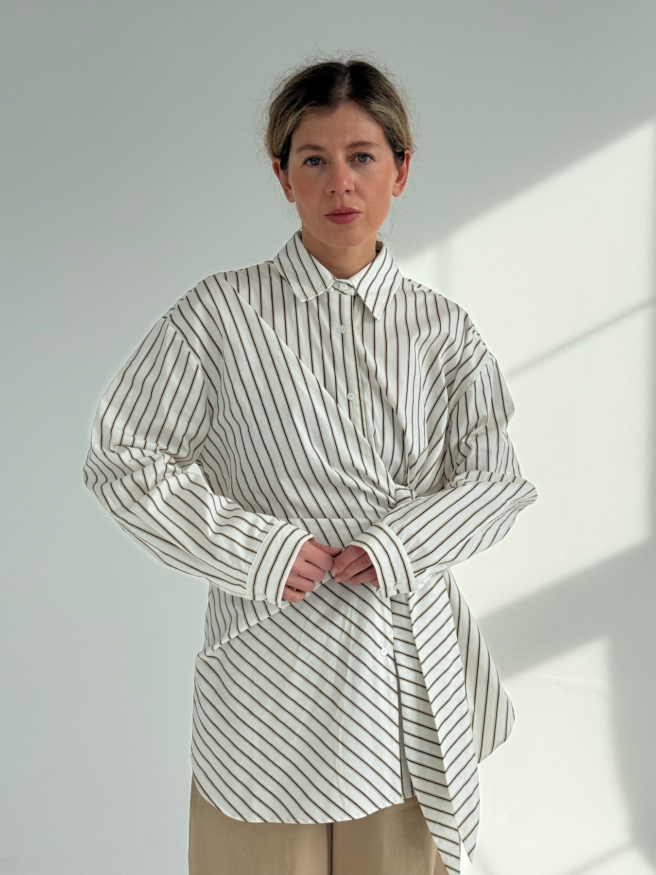 Pagarināts svītrains kokvilnas krekls ar atloku apkakli, garām piedurknēm un sasienamu elementu. Pogu aizdare priekšpusē. Asimetrisks garums. Krekls ir pustaisna piegriezuma.