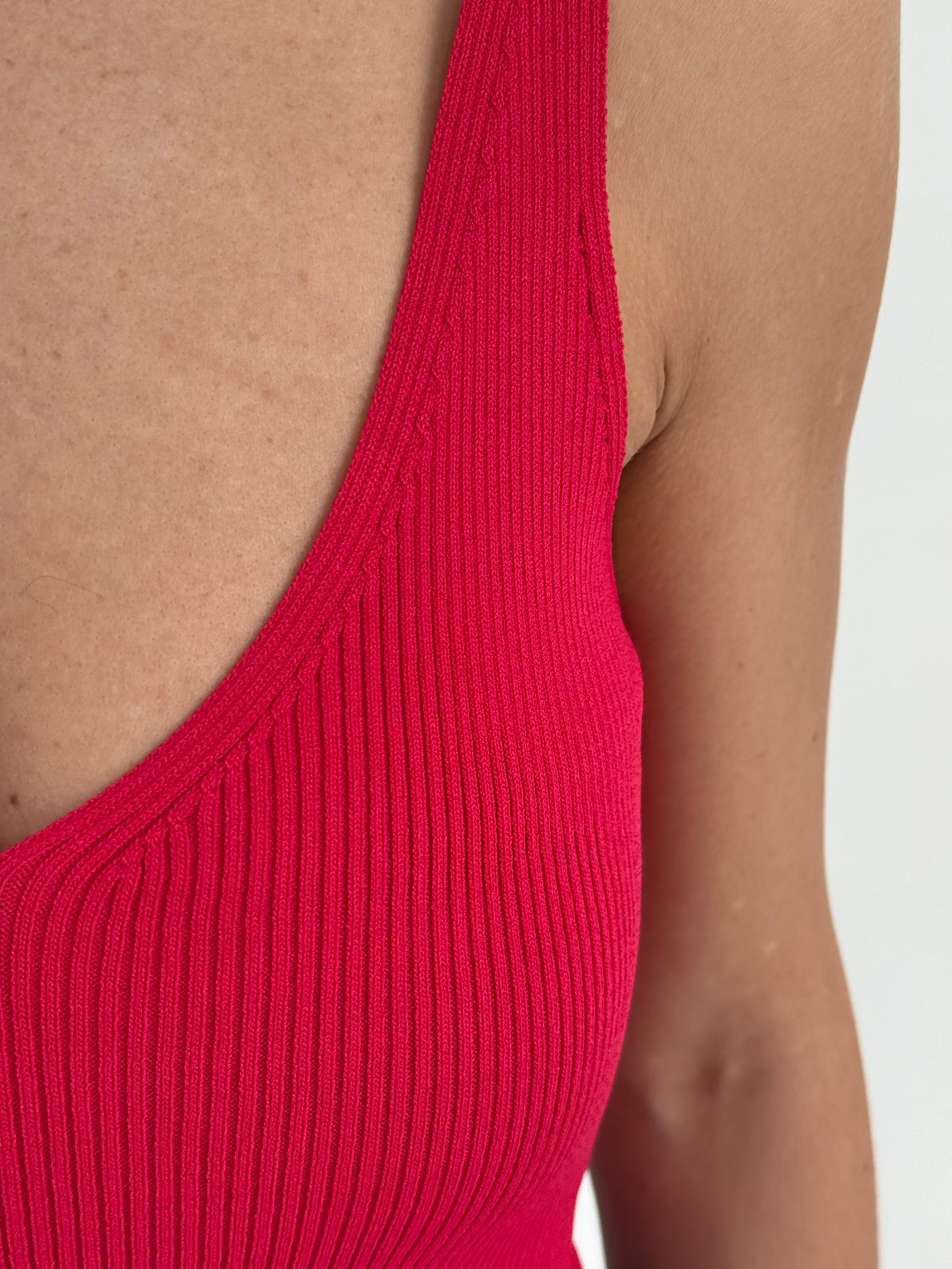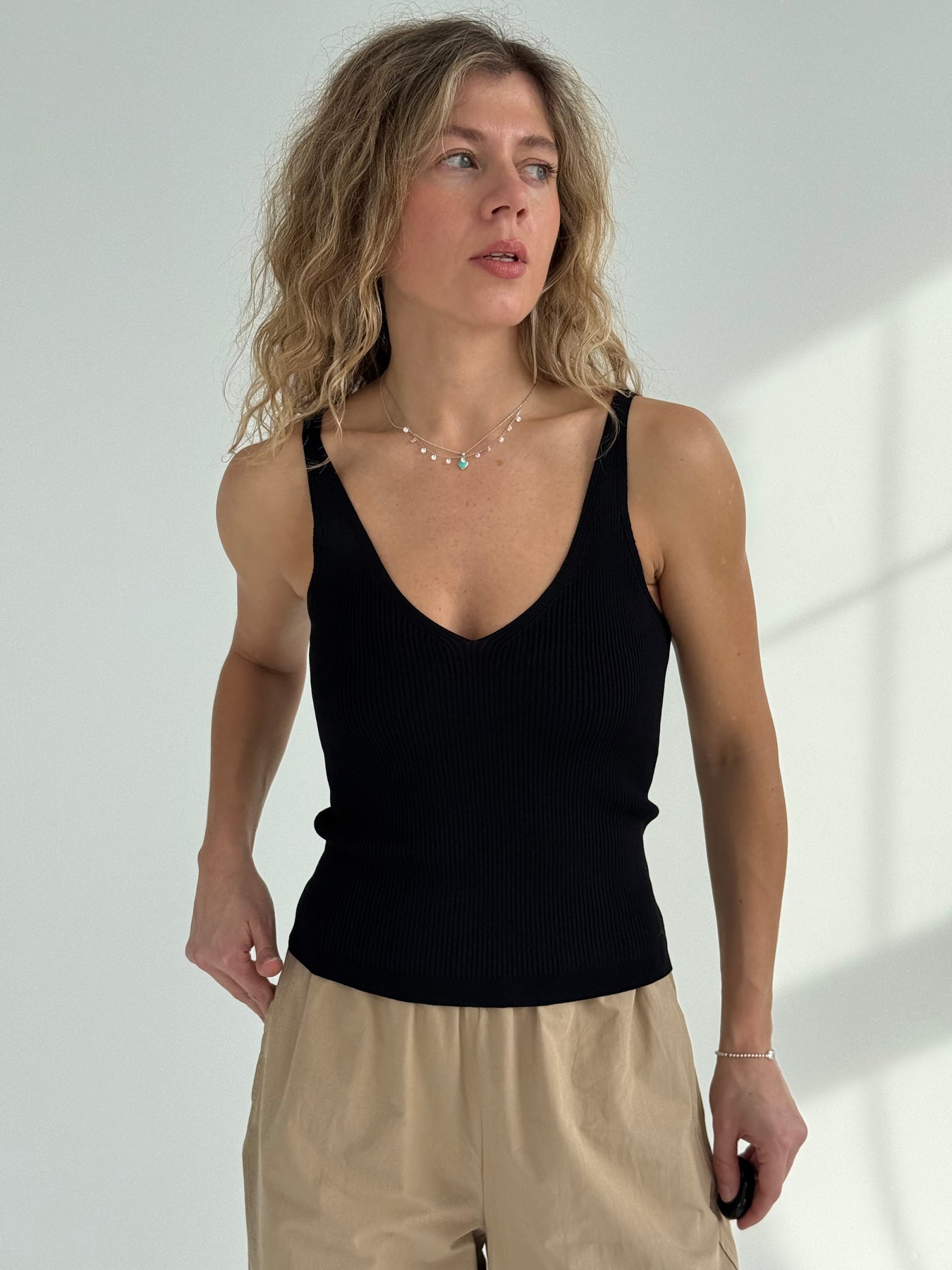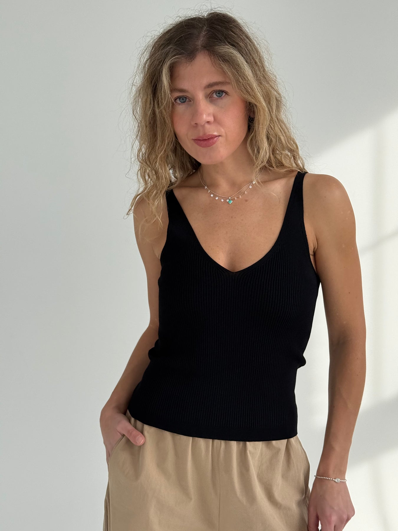 Rievots viskozes tops ar V-veida kakla izgriezumu. Tops ir no mīksta un elastīga auduma. Tops ir pieguļoša piegriezuma.