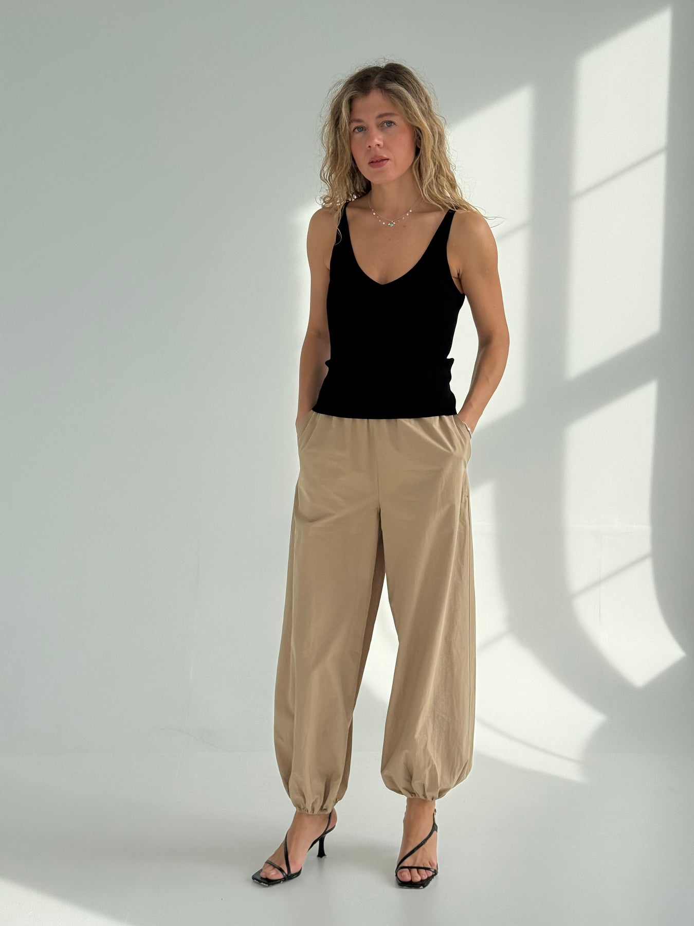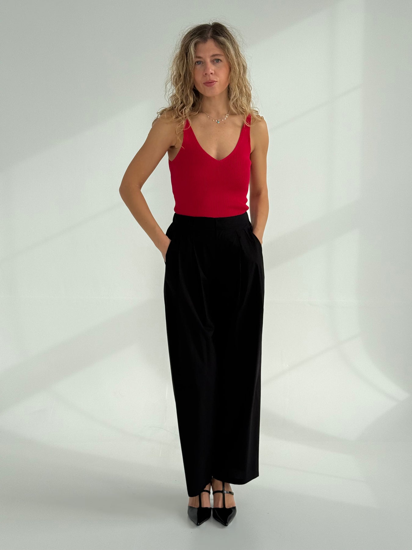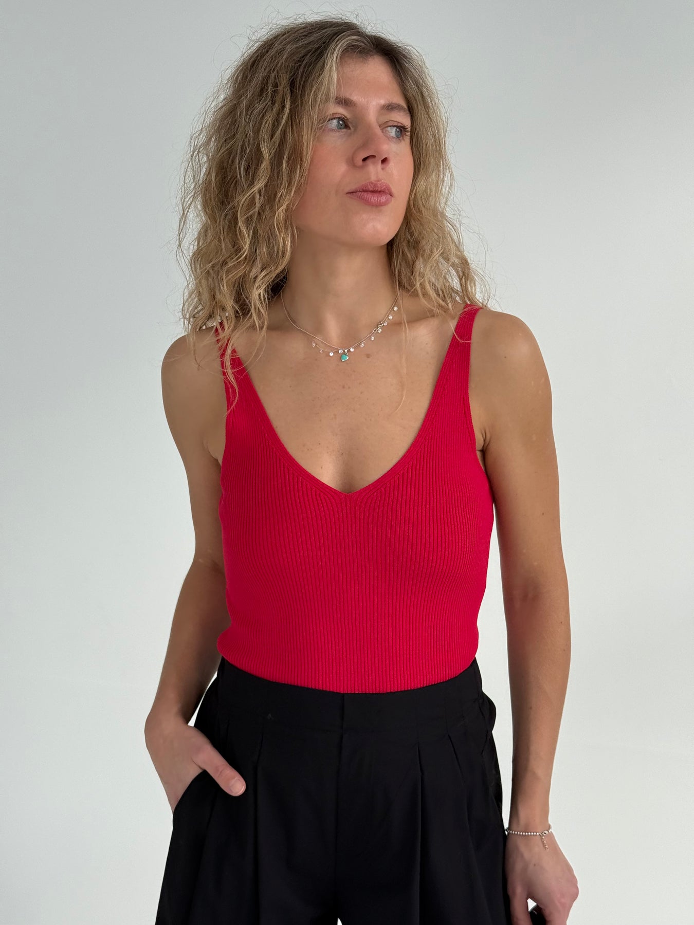 Rievots viskozes tops ar V-veida kakla izgriezumu. Tops ir no mīksta un elastīga auduma. Tops ir pieguļoša piegriezuma.