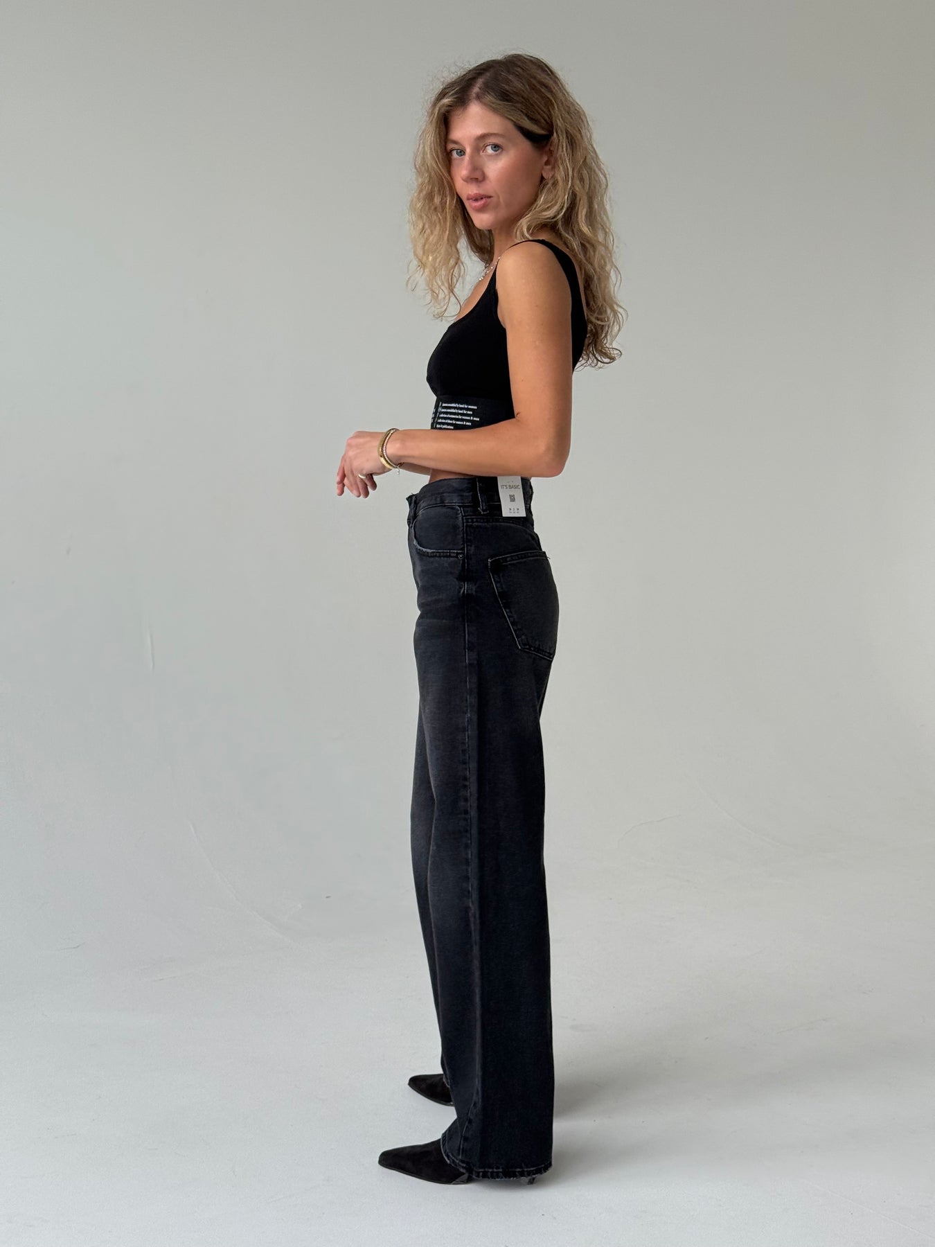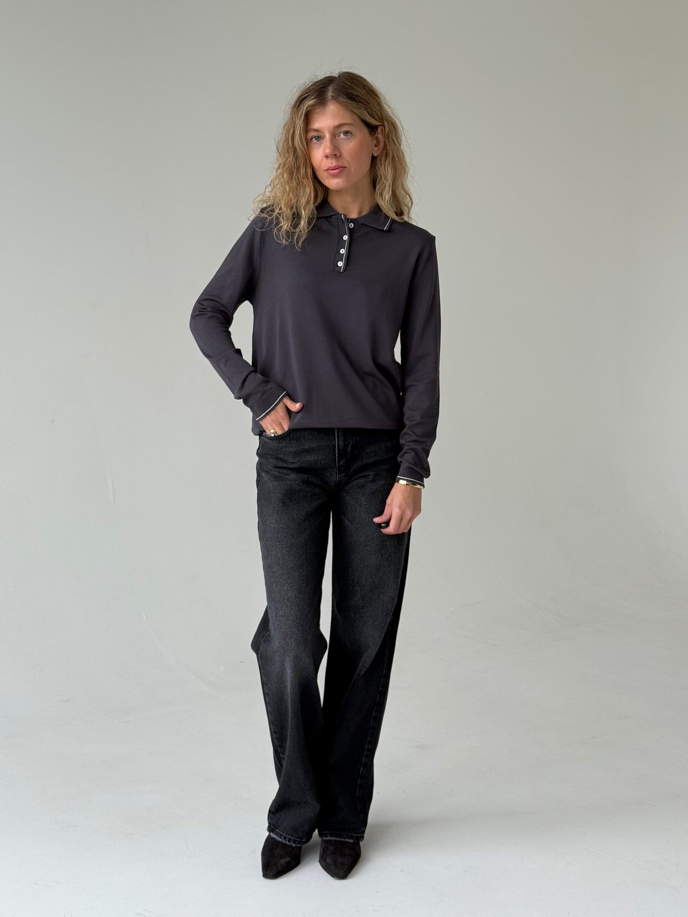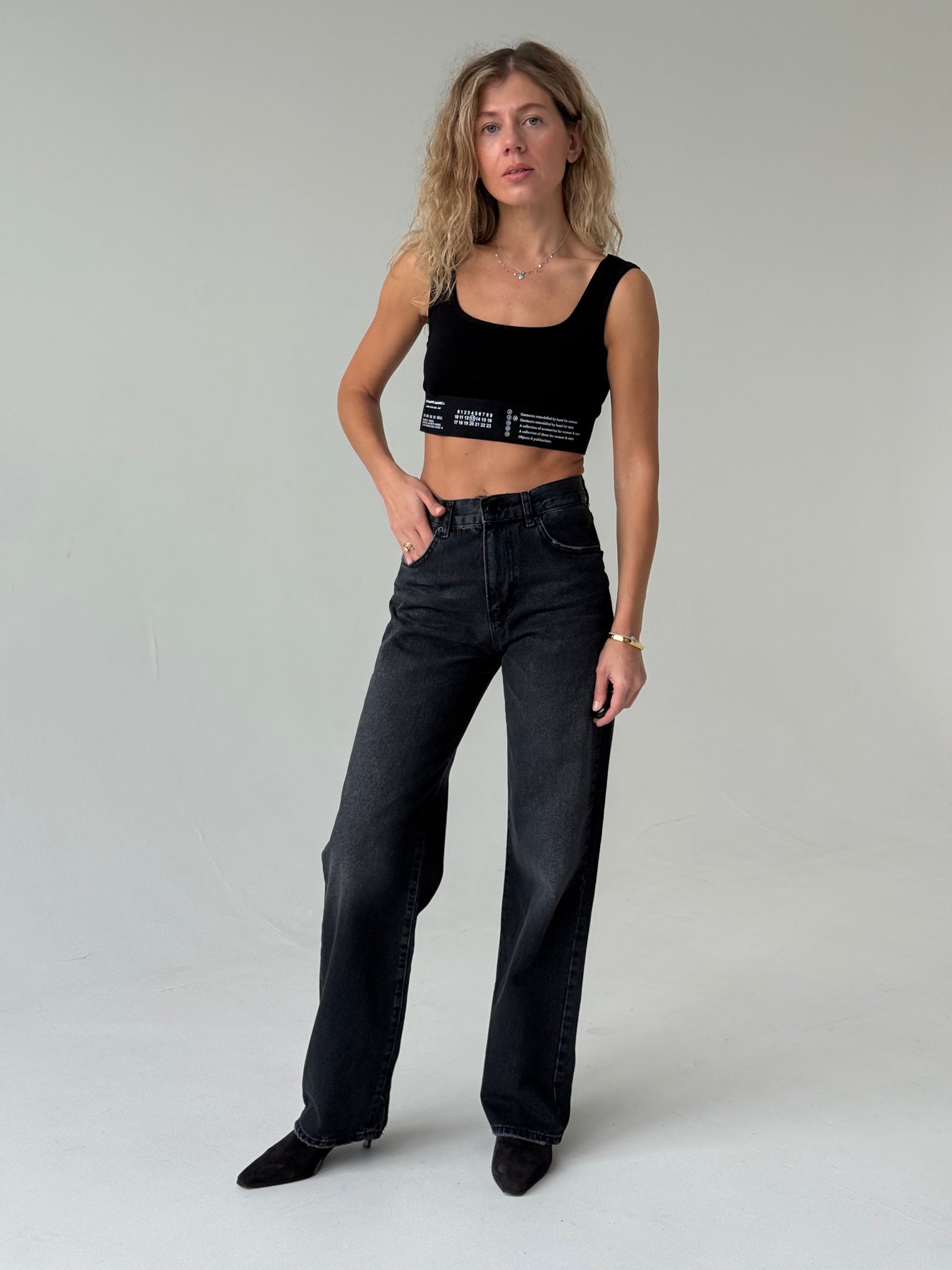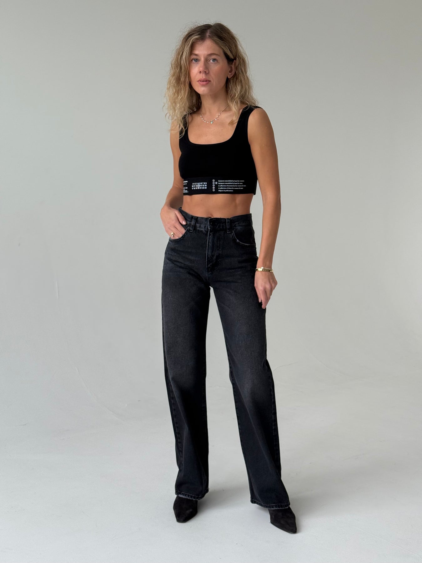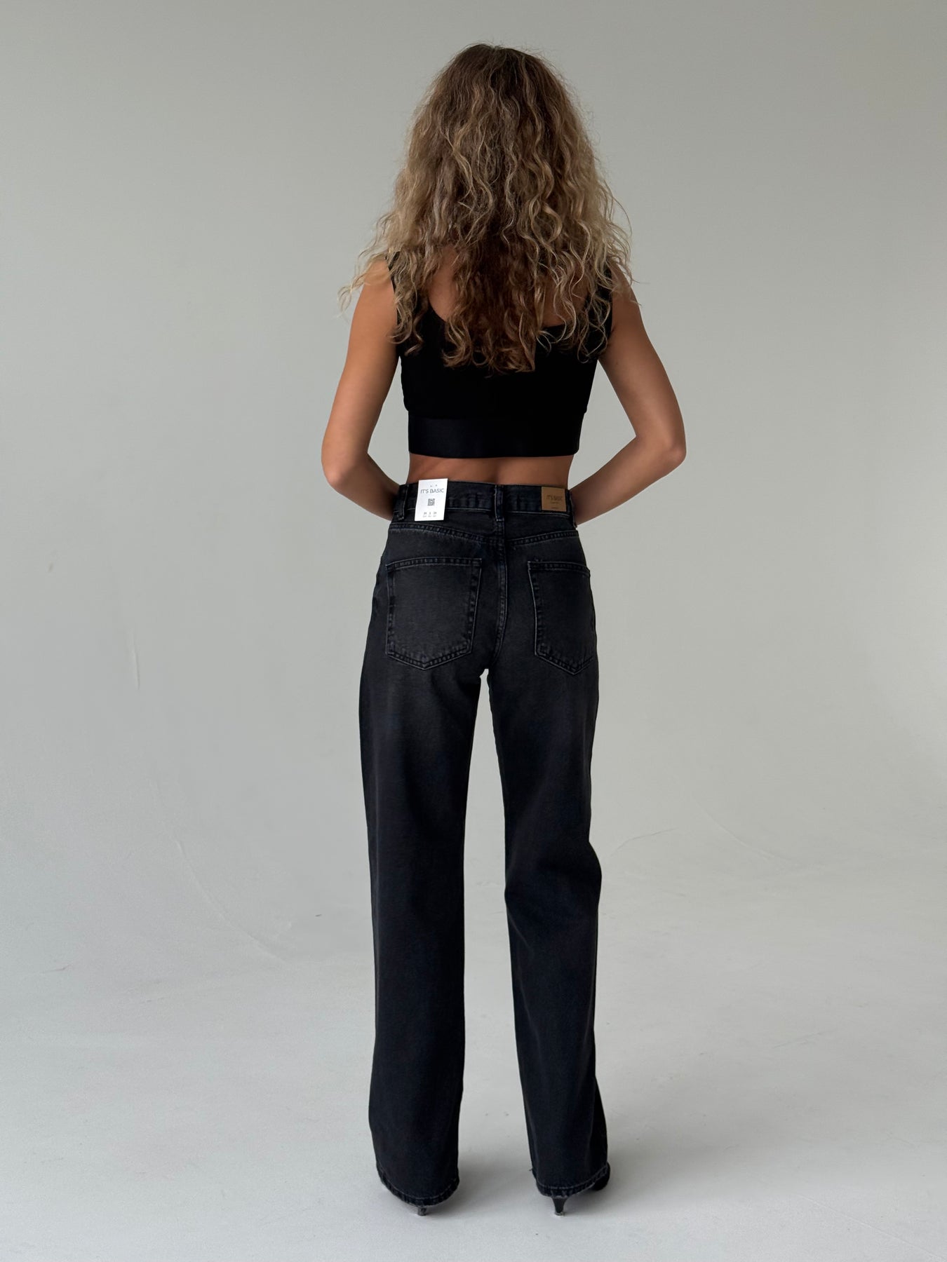 Taisnas džinsa bikses ar augstu jostasvietu. Bikses ir no mīksta auduma. Aiztaisās ar rāvējslēdzēju un metāla pogu. Priekšpusē un mugurpusē ir kabatas.