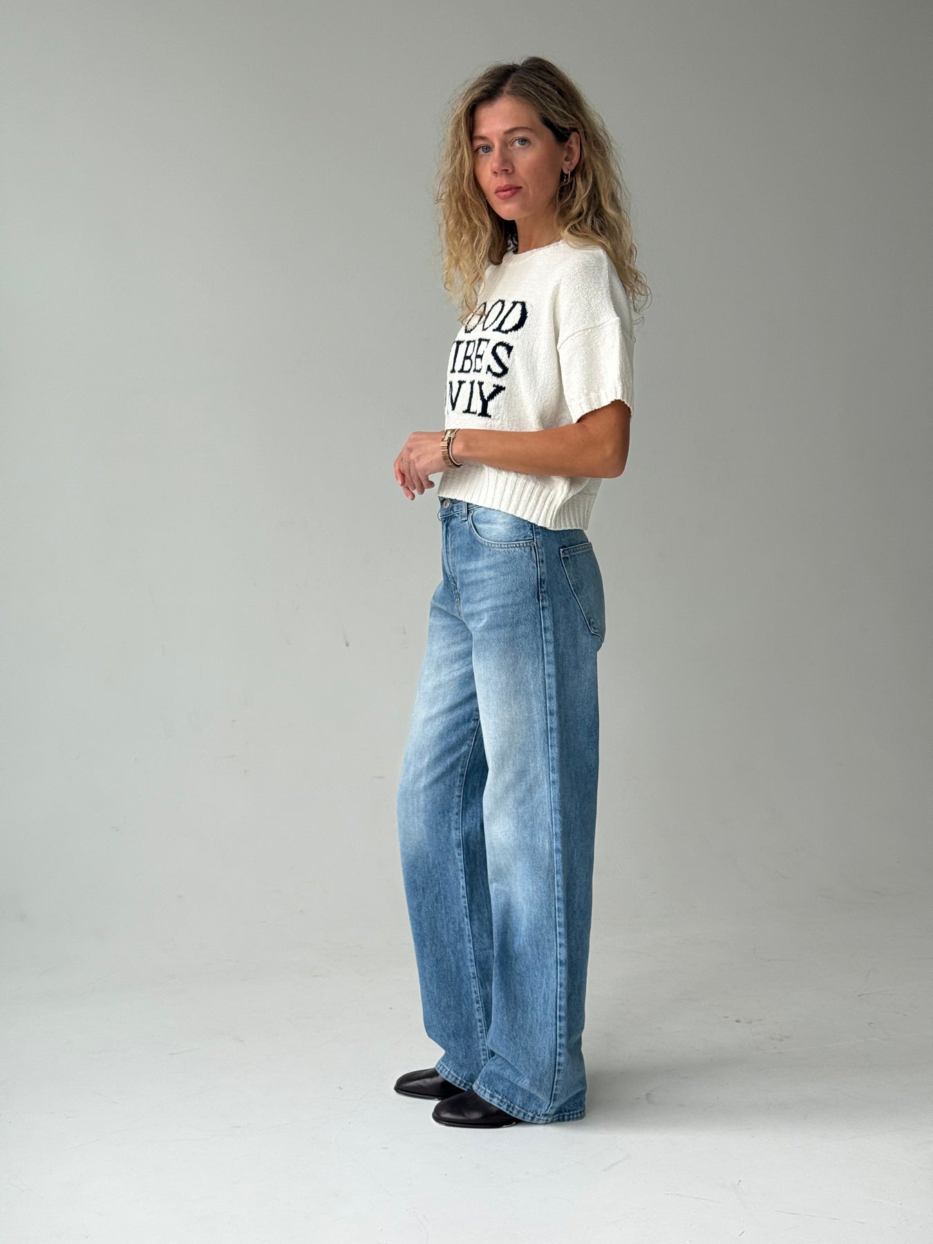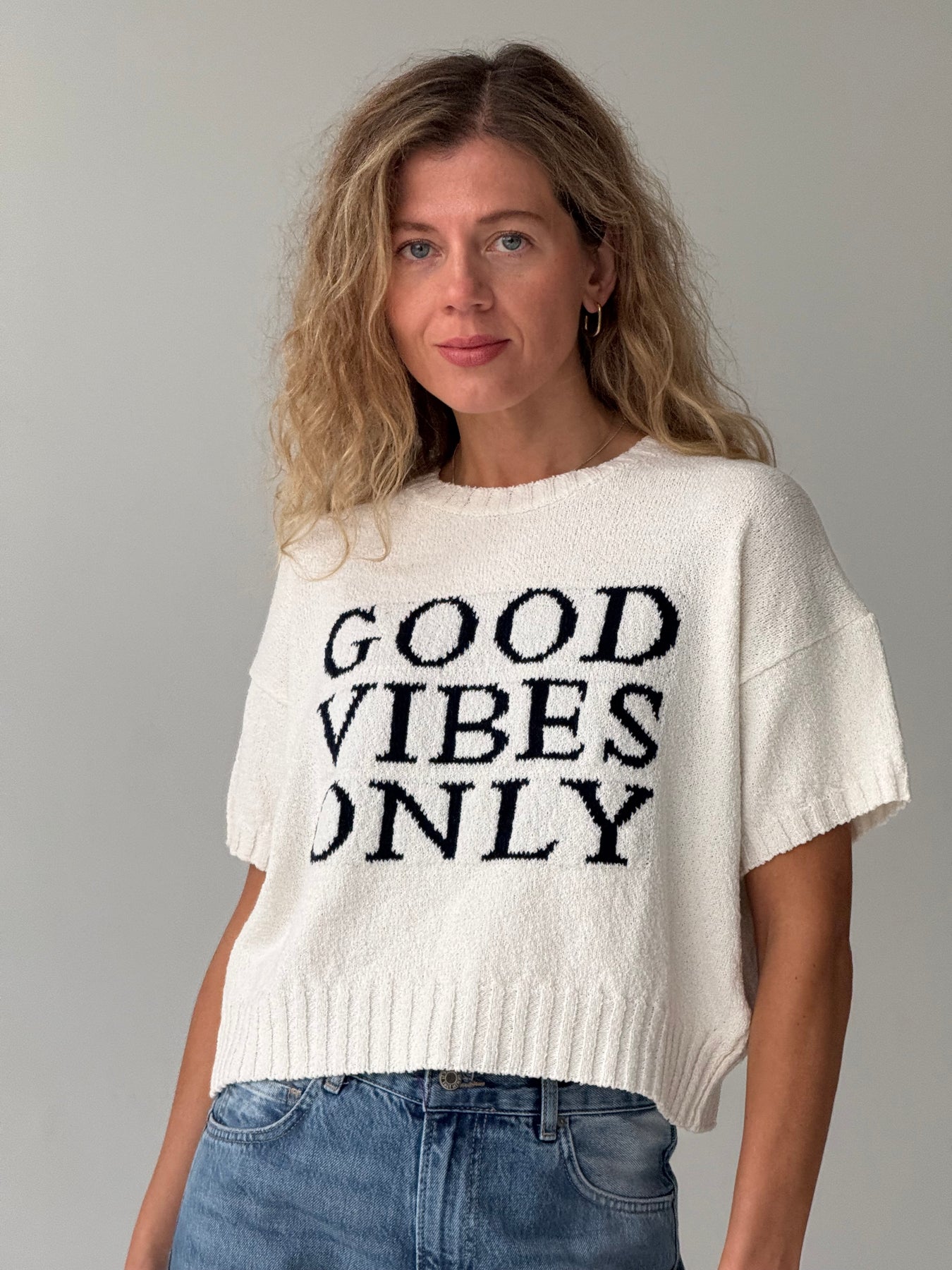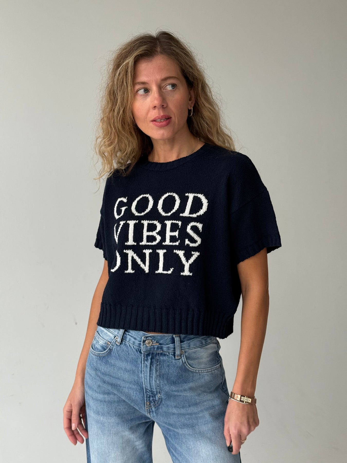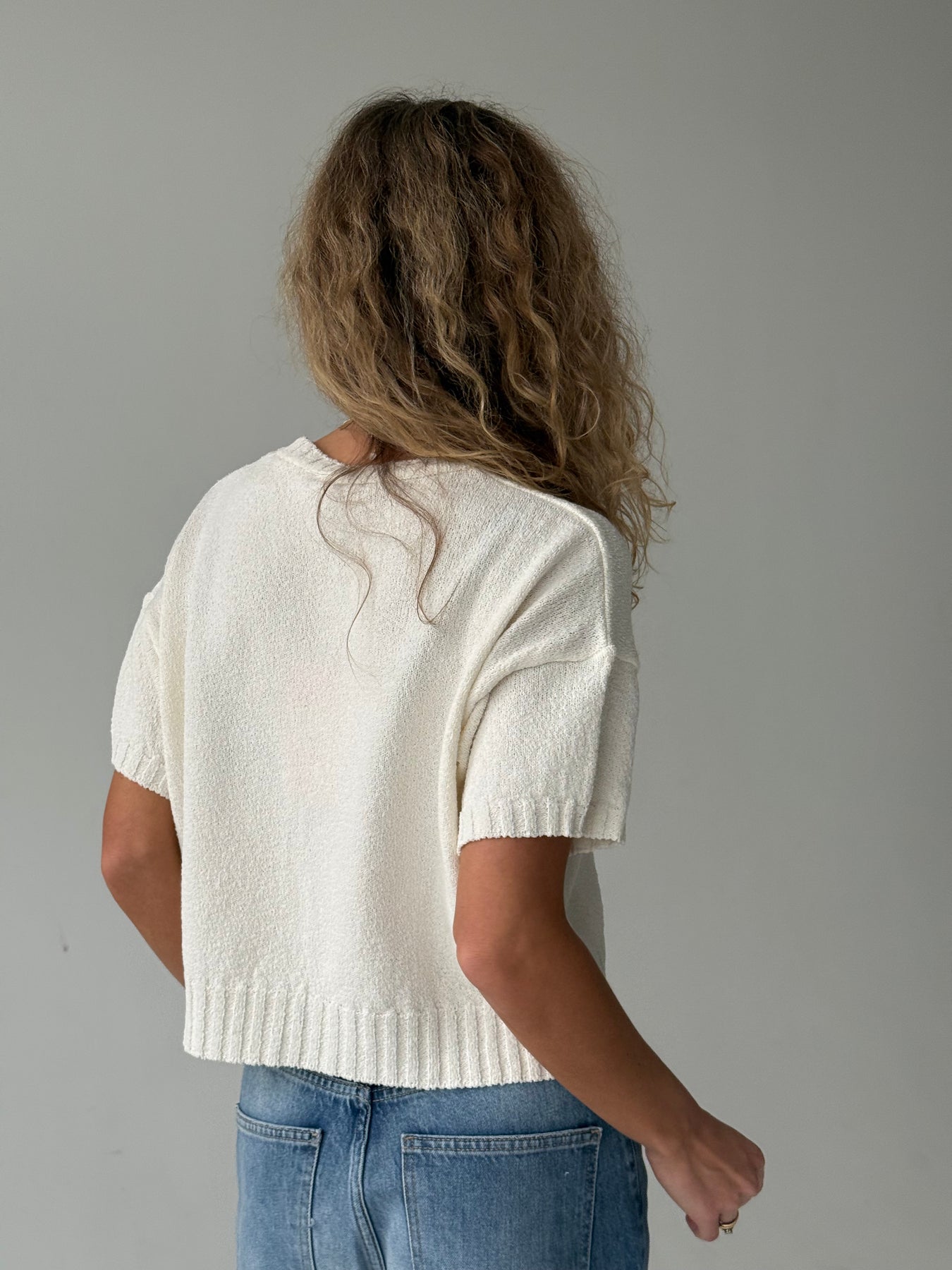 Adīts kokvilnas džemperis ar uzrakstu un apaļu kakla izgriezumu. Džemperis ir no mīksta un elastīga auduma. Īsas piedurknes ar pazeminātu plecu daļu. Rievotas apmales. Džemperis ir pustaisna piegriezuma.