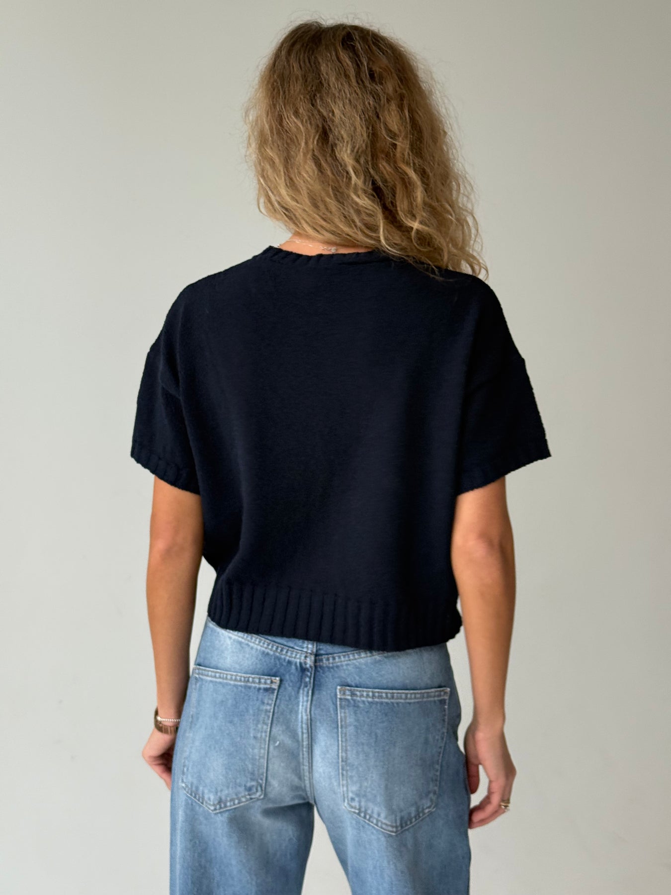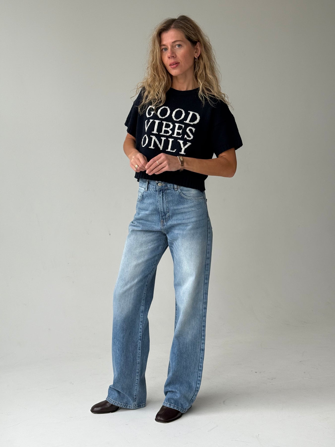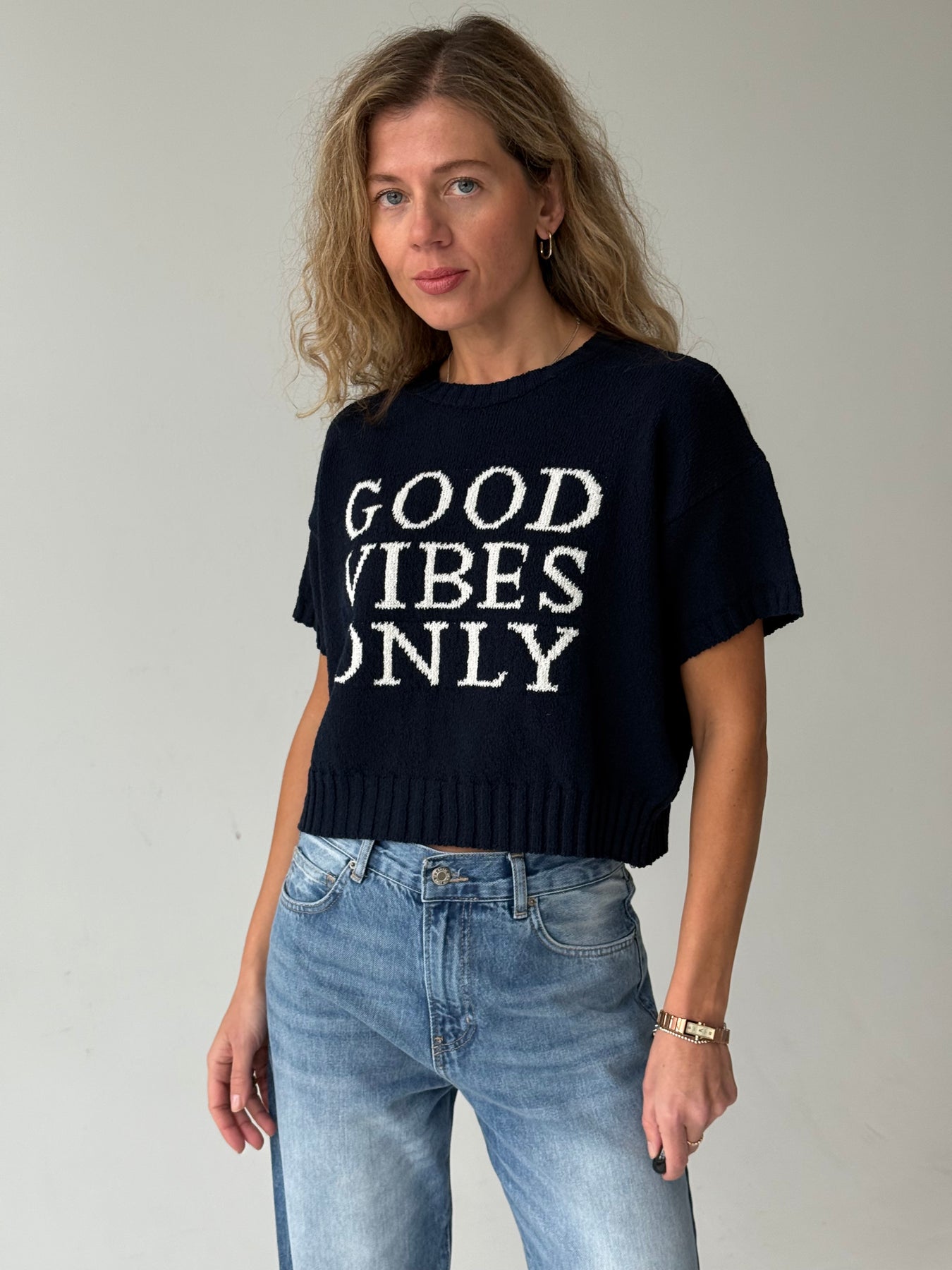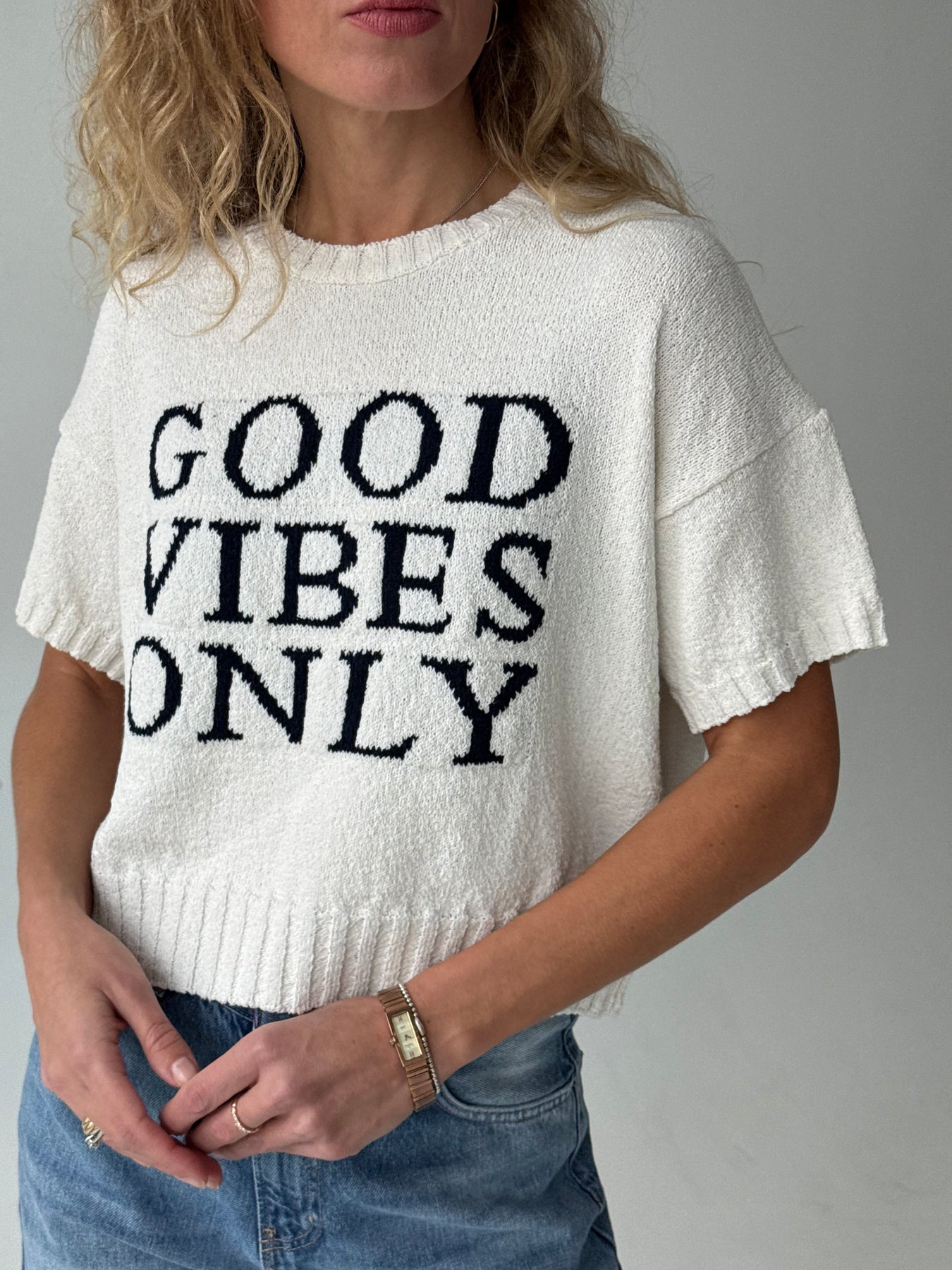 Adīts kokvilnas džemperis ar uzrakstu un apaļu kakla izgriezumu. Džemperis ir no mīksta un elastīga auduma. Īsas piedurknes ar pazeminātu plecu daļu. Rievotas apmales. Džemperis ir pustaisna piegriezuma.