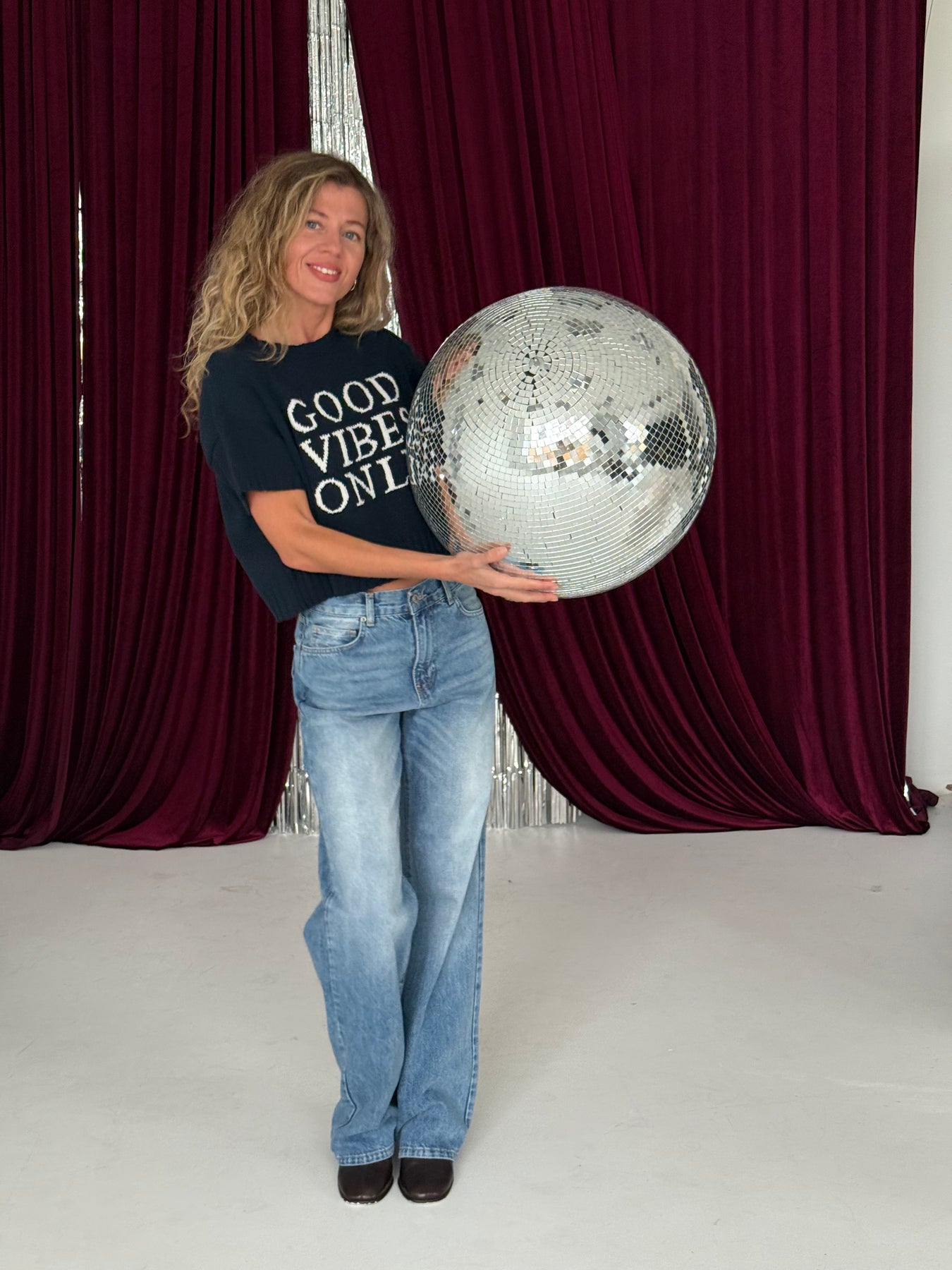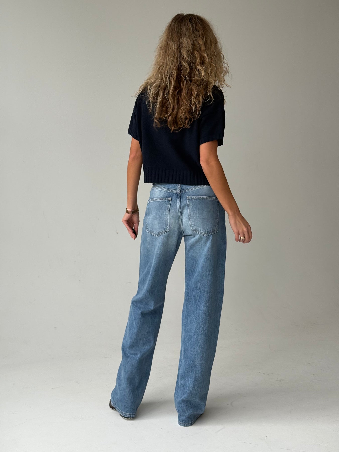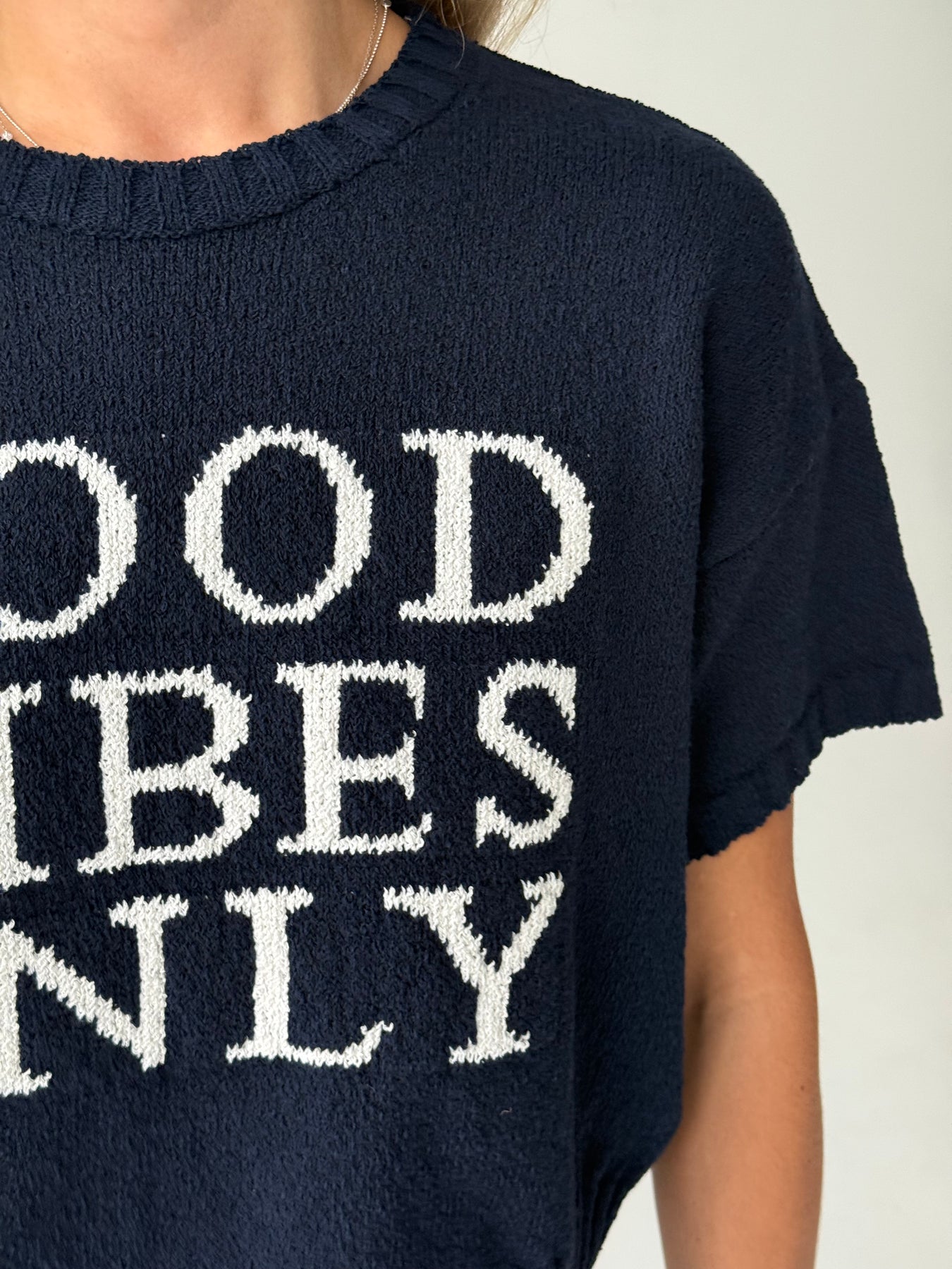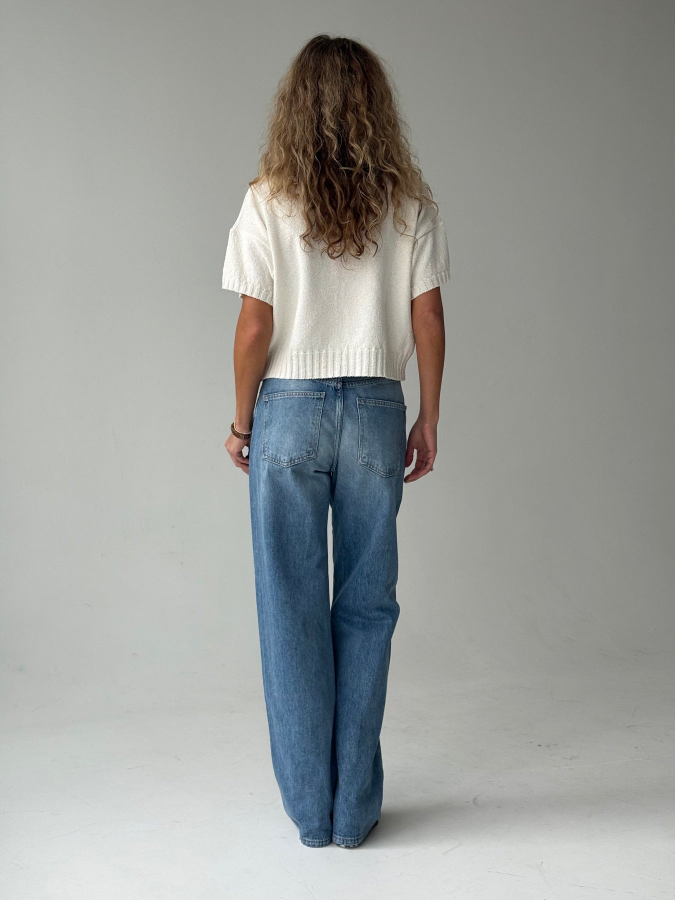 Adīts kokvilnas džemperis ar uzrakstu un apaļu kakla izgriezumu. Džemperis ir no mīksta un elastīga auduma. Īsas piedurknes ar pazeminātu plecu daļu. Rievotas apmales. Džemperis ir pustaisna piegriezuma.
