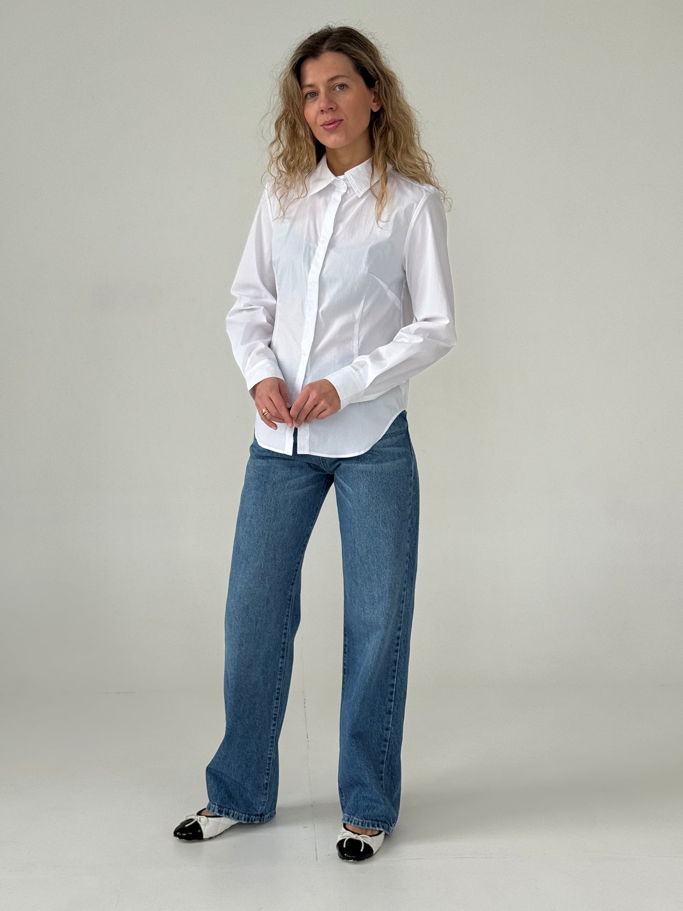 Klasisks slim fit kokvilnas krekls ar atloku apkakli un garām piedurknēm. Neredzama pogu aizdare priekšpusē. Krekls ir puspieguļoša piegriezuma.