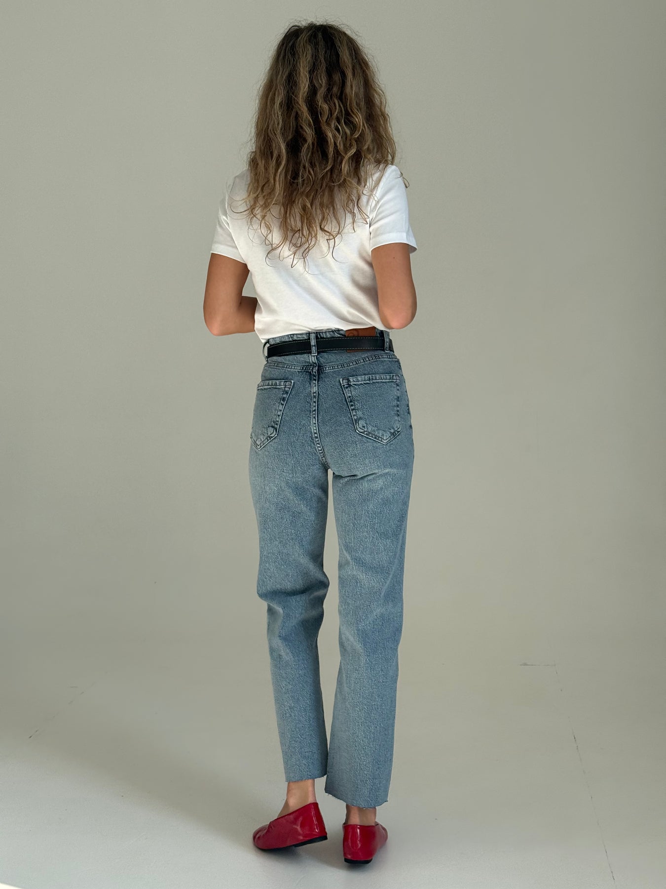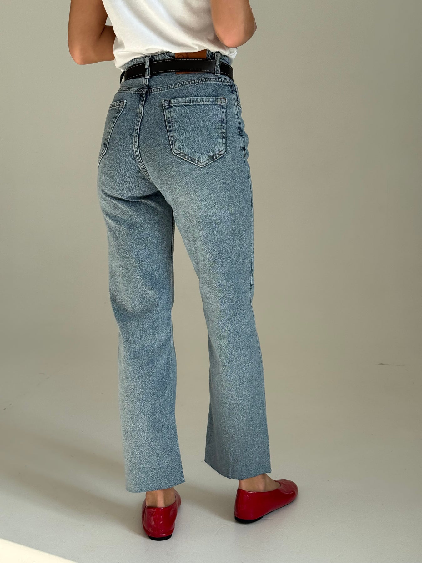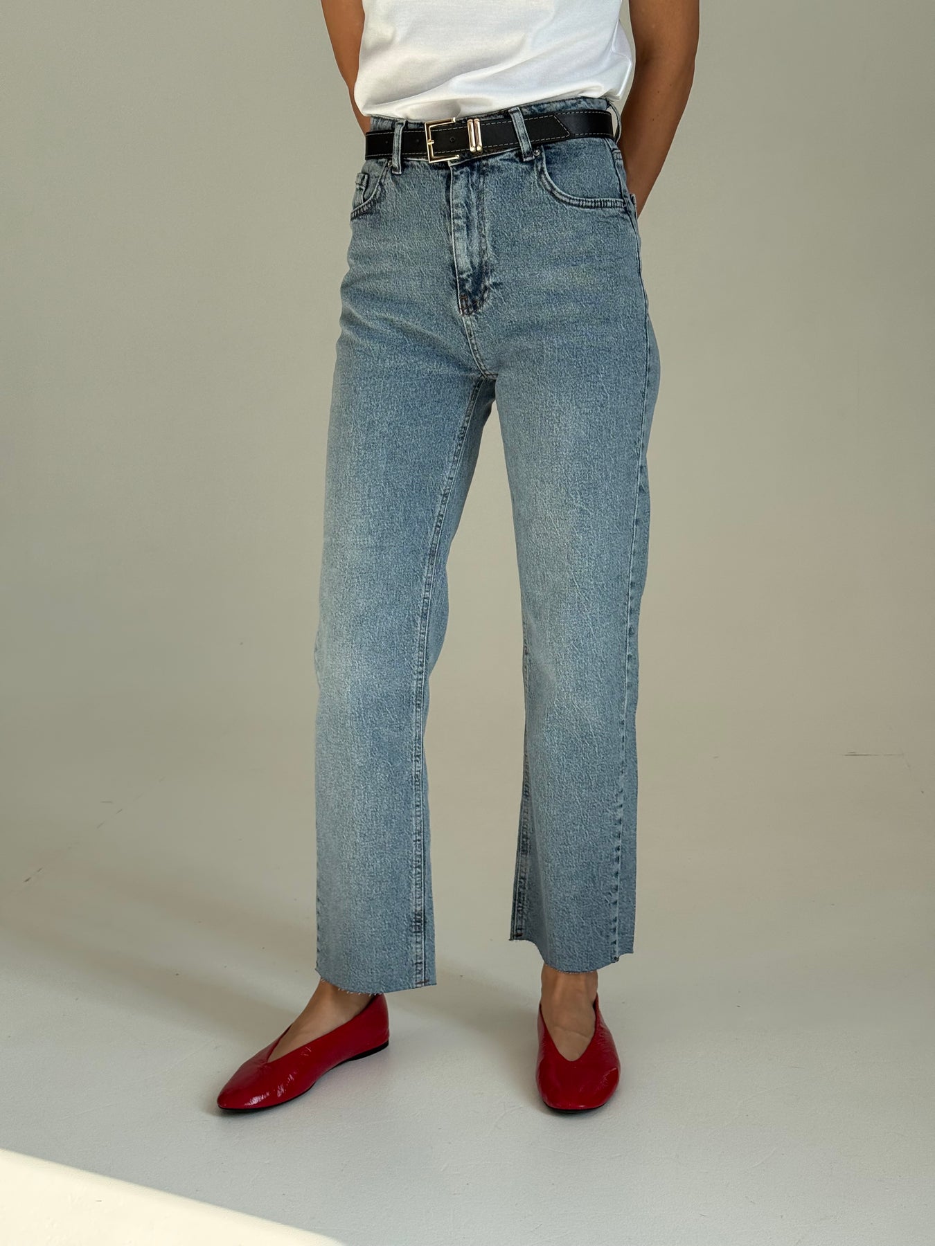 Saīsinātas džinsa bikses ar plēstiem galiem, balinātu efektu, paaugstinātu jostasvietu un jostu. Bikses ir no elastīga auduma. Aiztaisās ar rāvējslēdzēju un metāla pogu. Priekšpusē un mugurpusē ir kabatas. Bikses ir taisna piegriezuma.