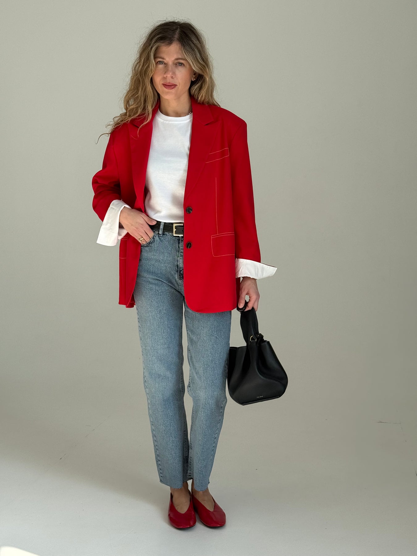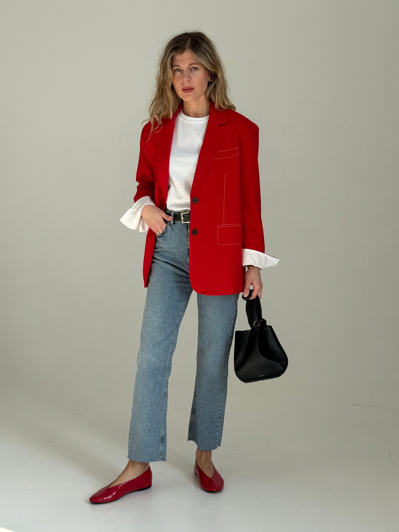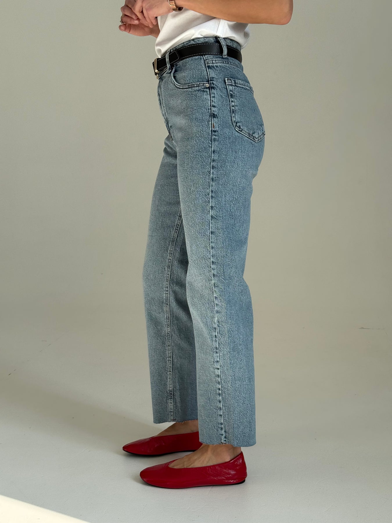 Saīsinātas džinsa bikses ar plēstiem galiem, balinātu efektu, paaugstinātu jostasvietu un jostu. Bikses ir no elastīga auduma. Aiztaisās ar rāvējslēdzēju un metāla pogu. Priekšpusē un mugurpusē ir kabatas. Bikses ir taisna piegriezuma.