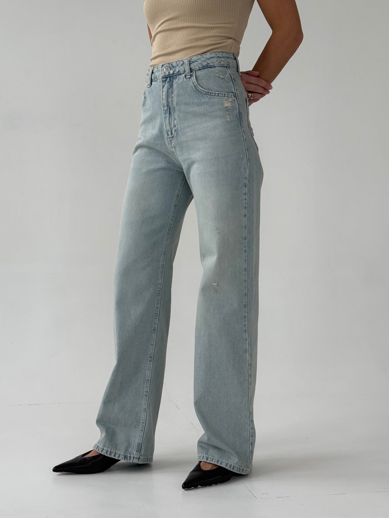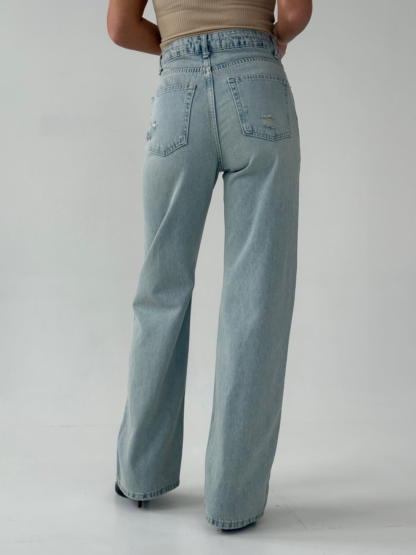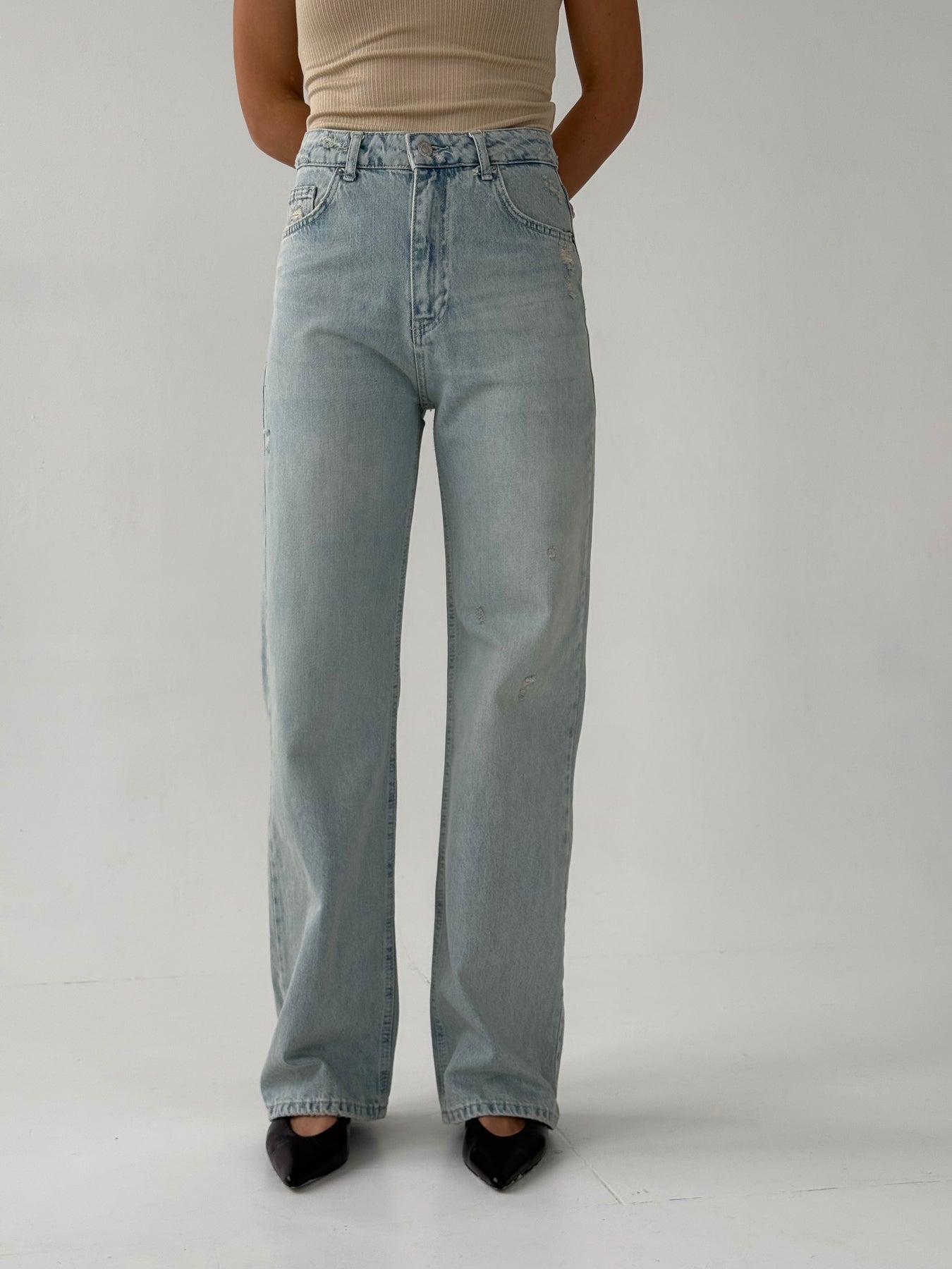 Taisnas džinsa bikses ar augstu jostasvietu. Bikses ir no mīksta auduma. Aiztaisās ar rāvējslēdzēju un metāla pogu. Priekšpusē un mugurpusē ir kabatas.