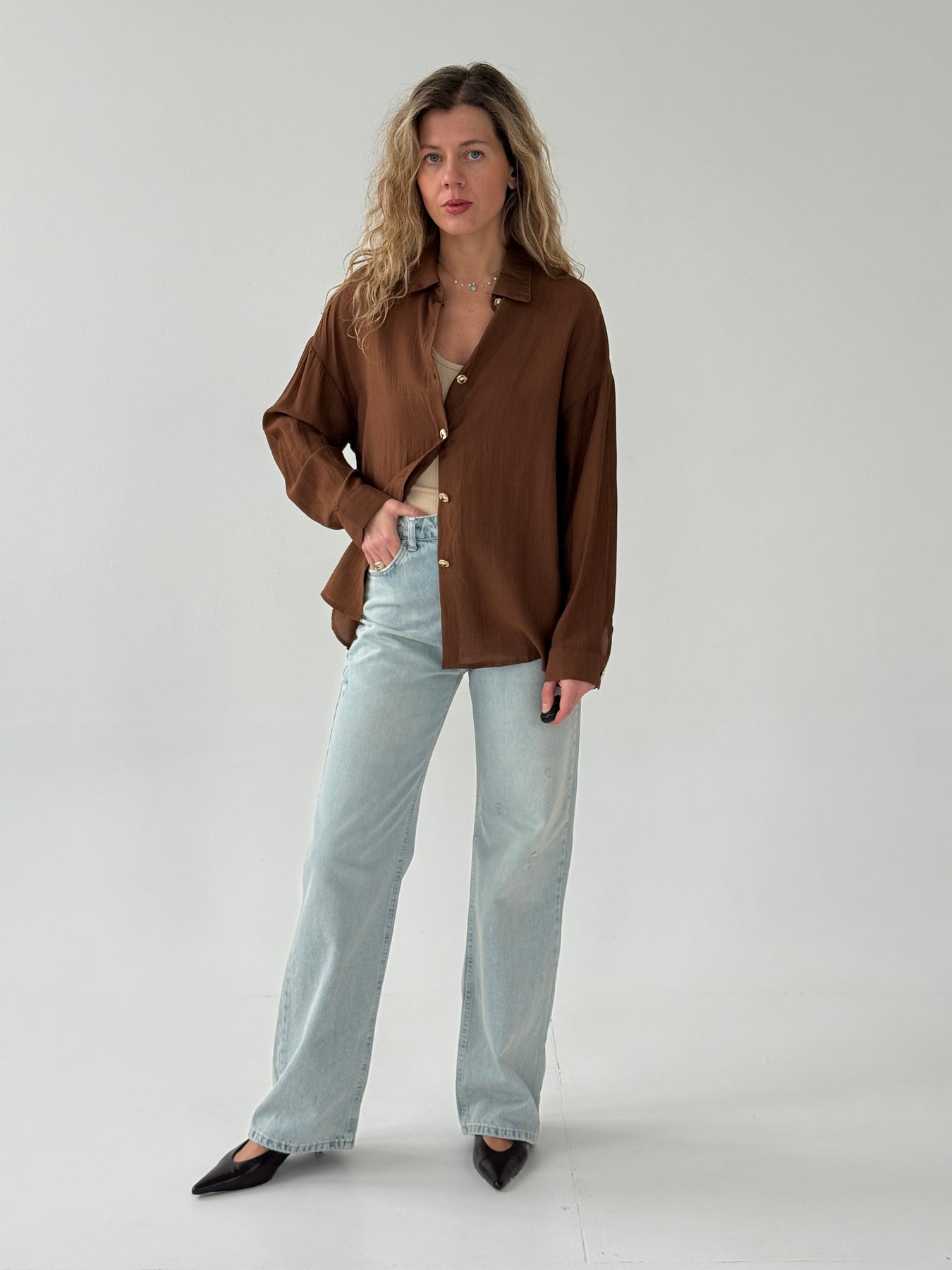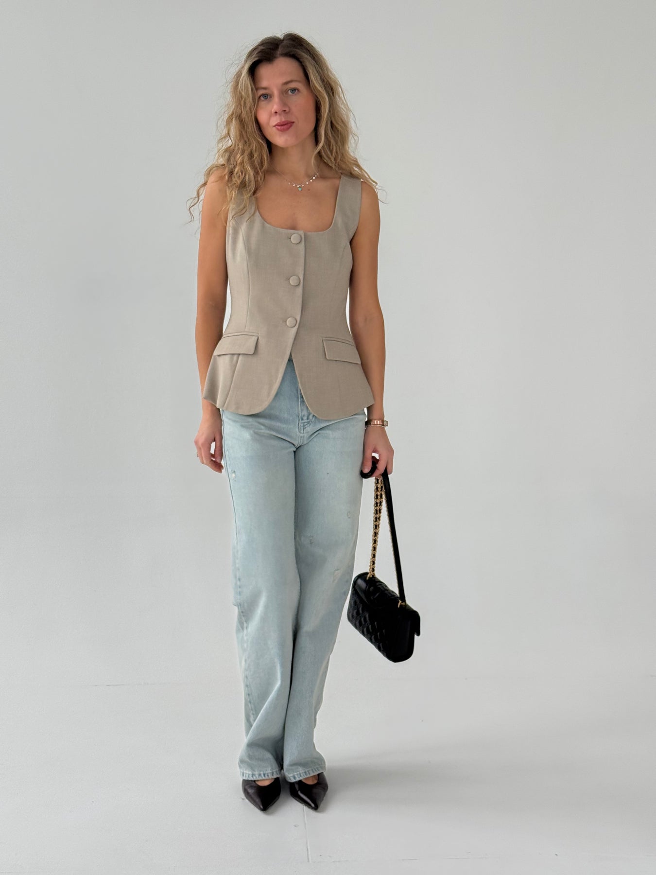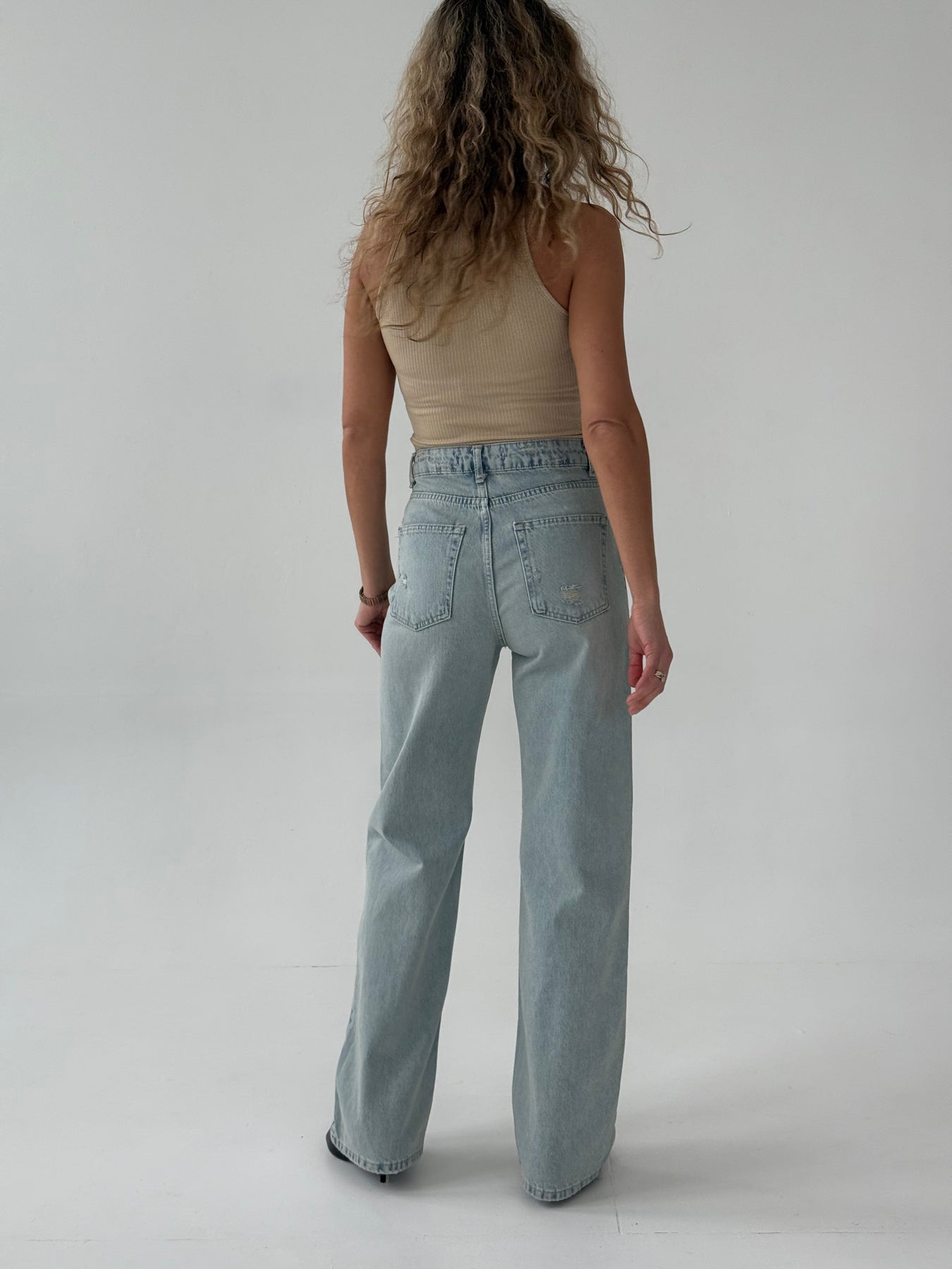 Taisnas džinsa bikses ar augstu jostasvietu. Bikses ir no mīksta auduma. Aiztaisās ar rāvējslēdzēju un metāla pogu. Priekšpusē un mugurpusē ir kabatas.