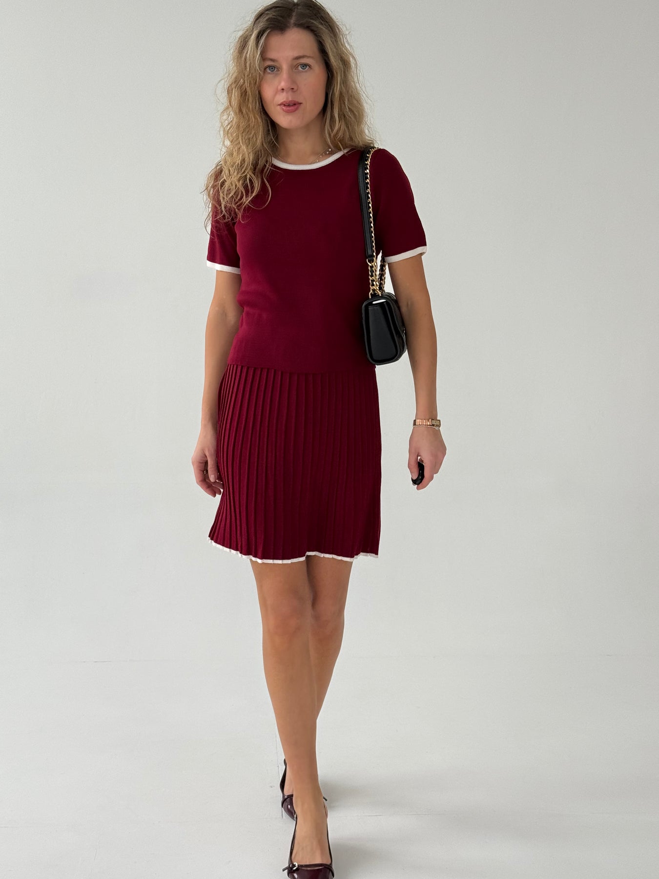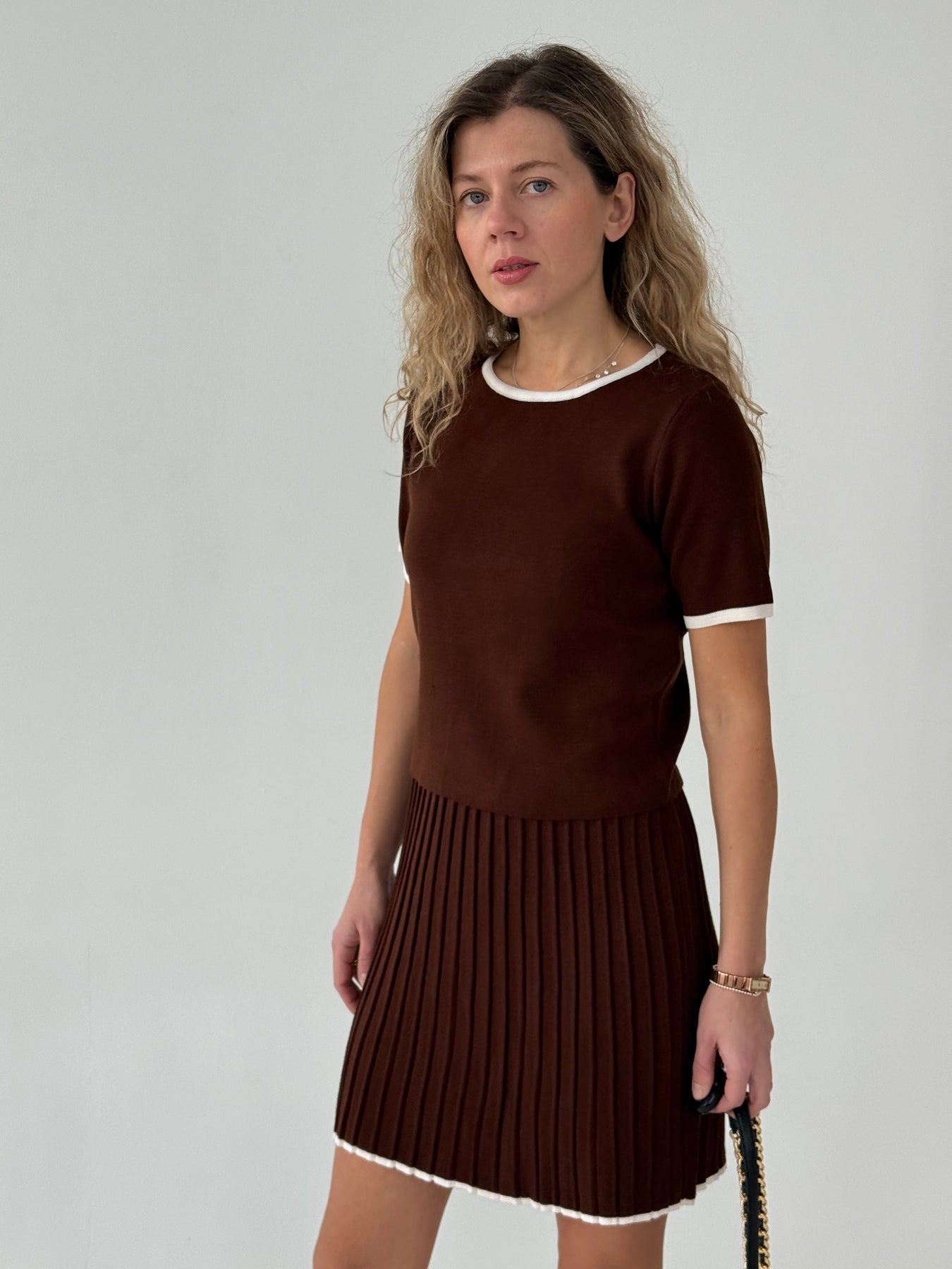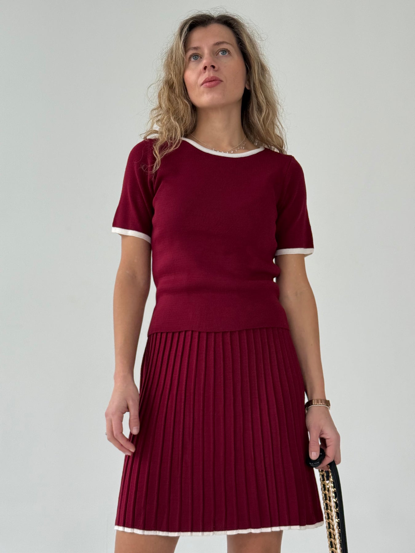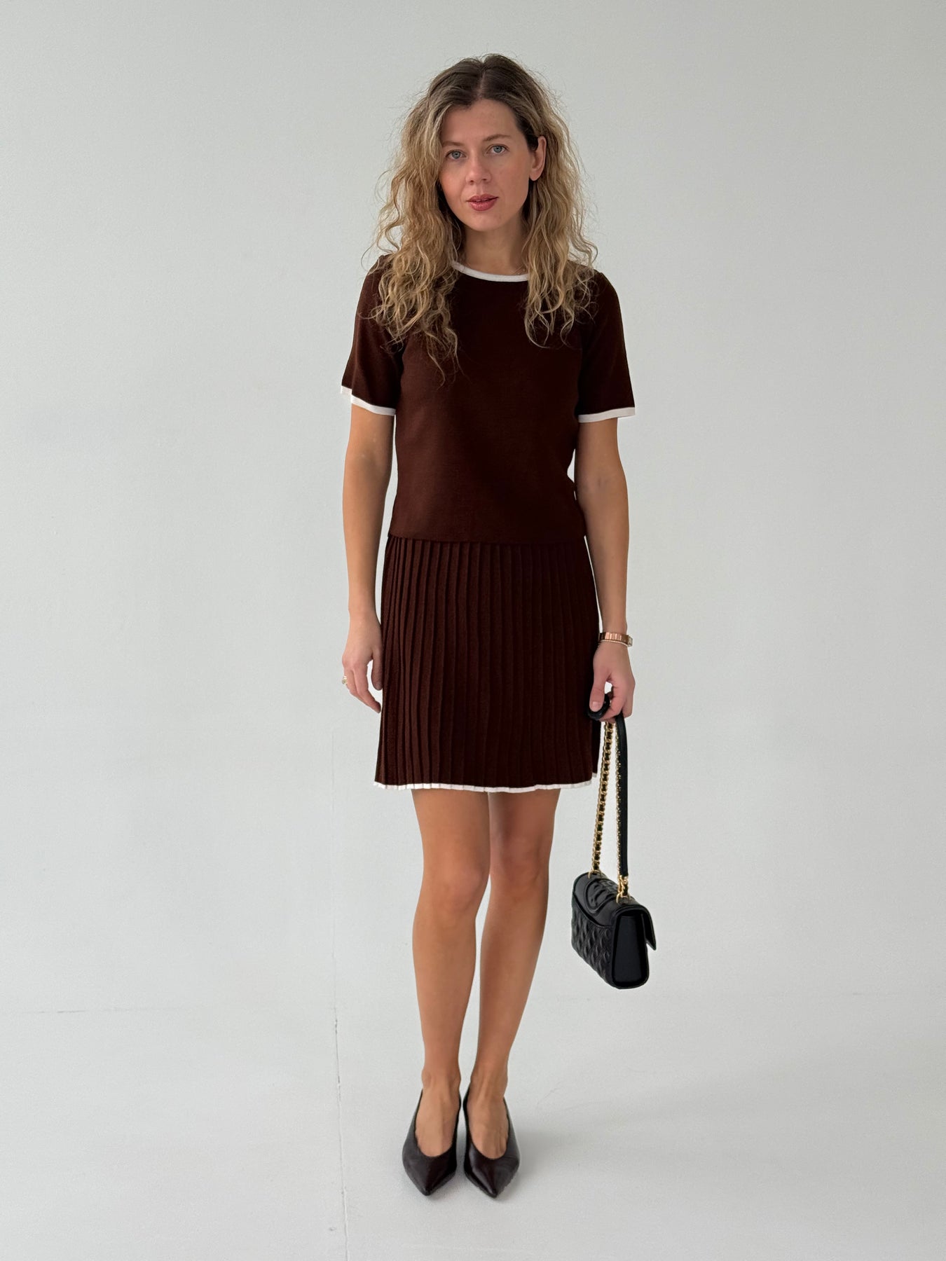 Trikotāžas plisētu svārku un topa komplekts. Tops ar apaļu kakla izgriezumu un īsām piedurknēm. Tops ir no mīksta un elastīga auduma. Tops ir puspieguļoša piegriezuma. Svārki ar paaugstinātu jostasvietu un iestrādātu gumiju jostasvietā. Svārki ir pustaisna piegriezuma.