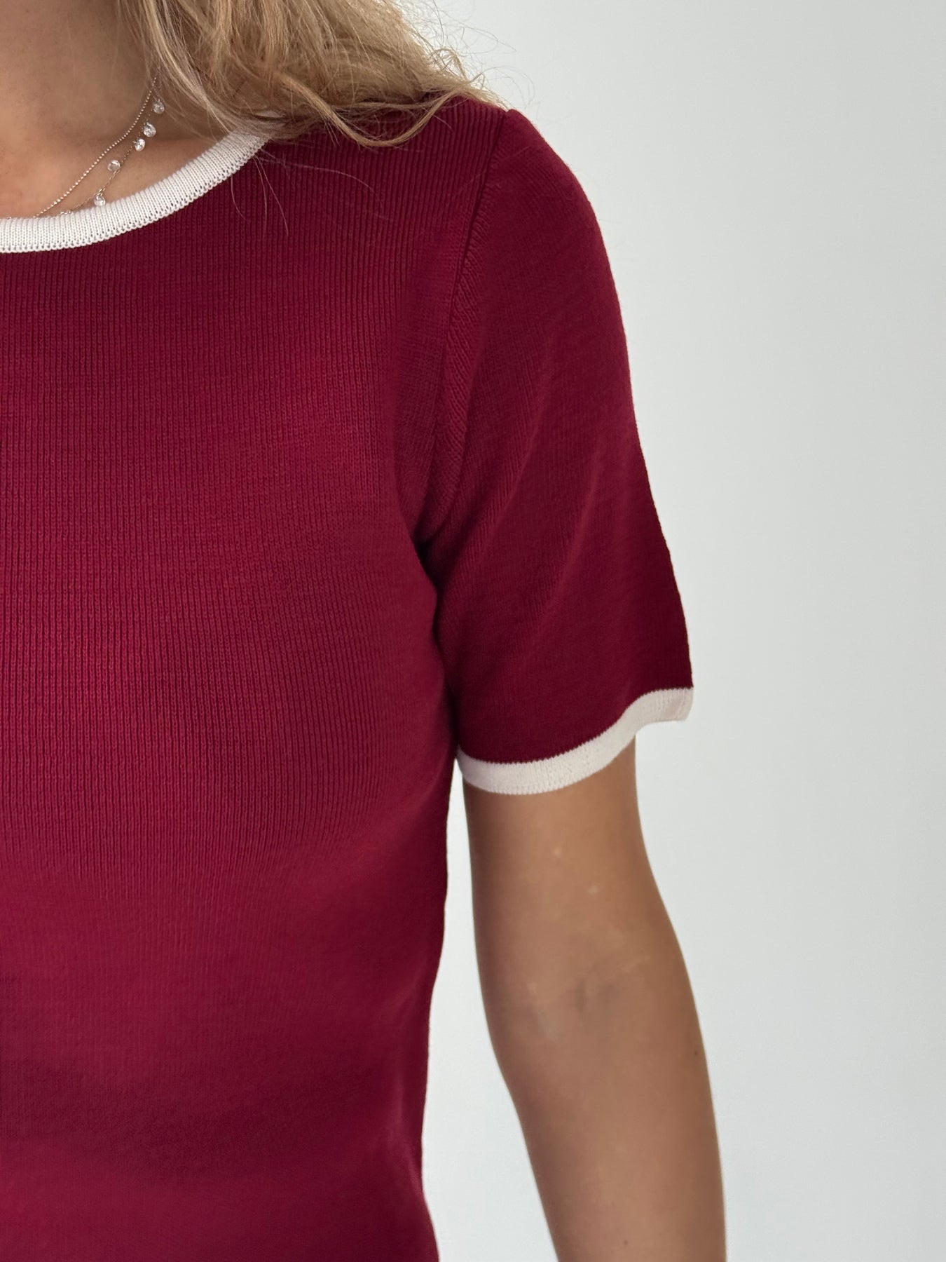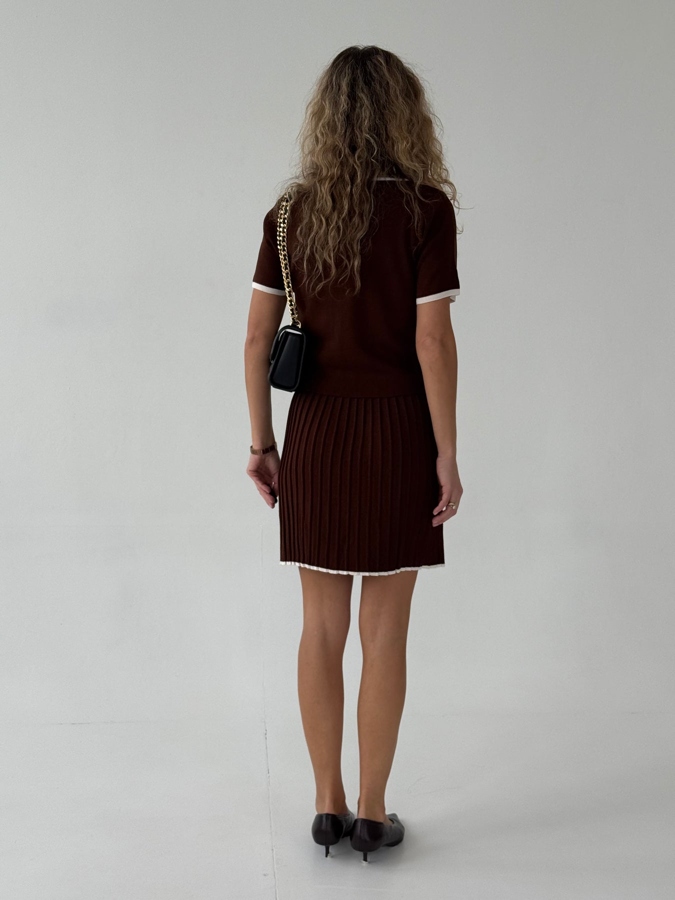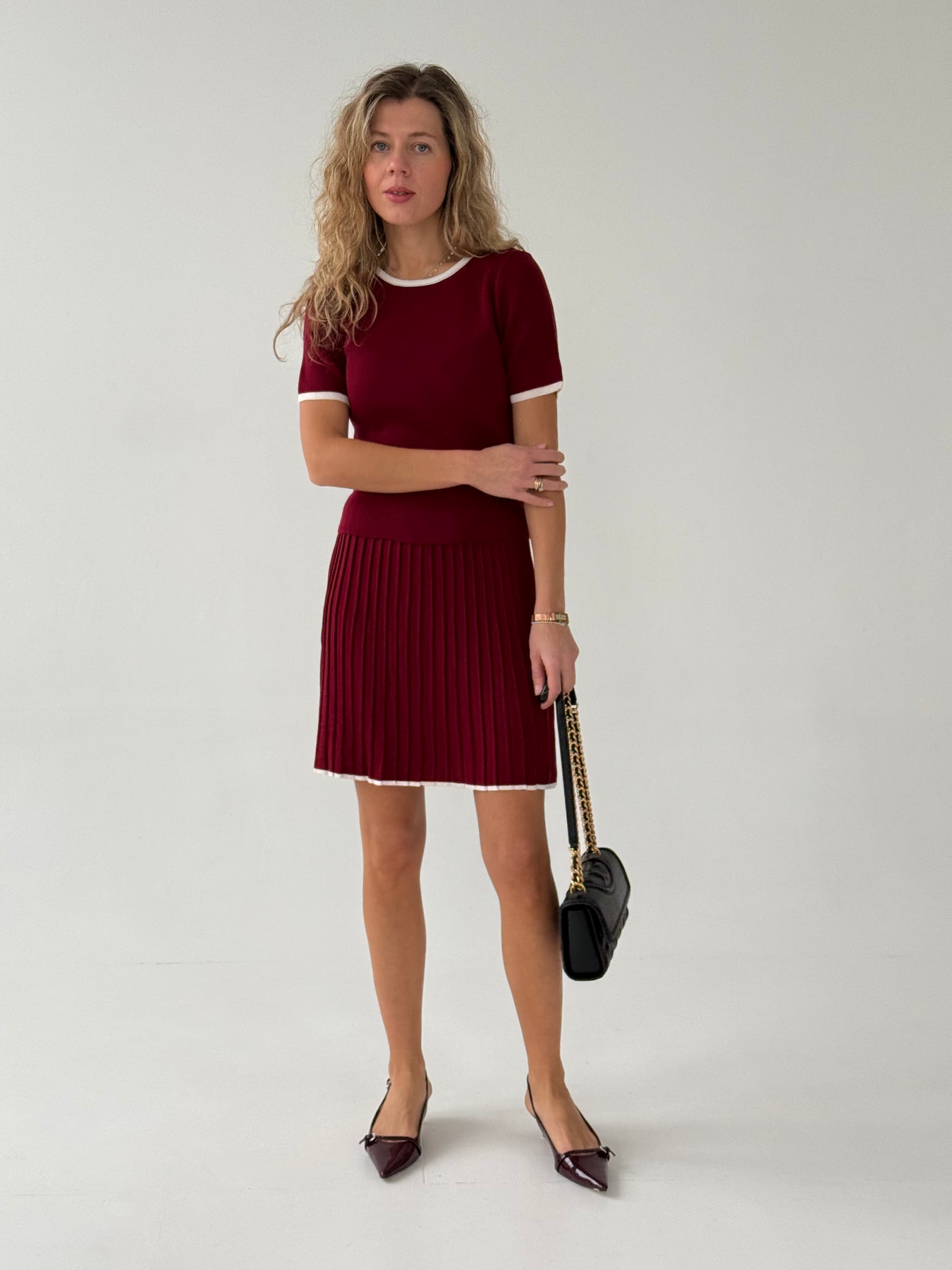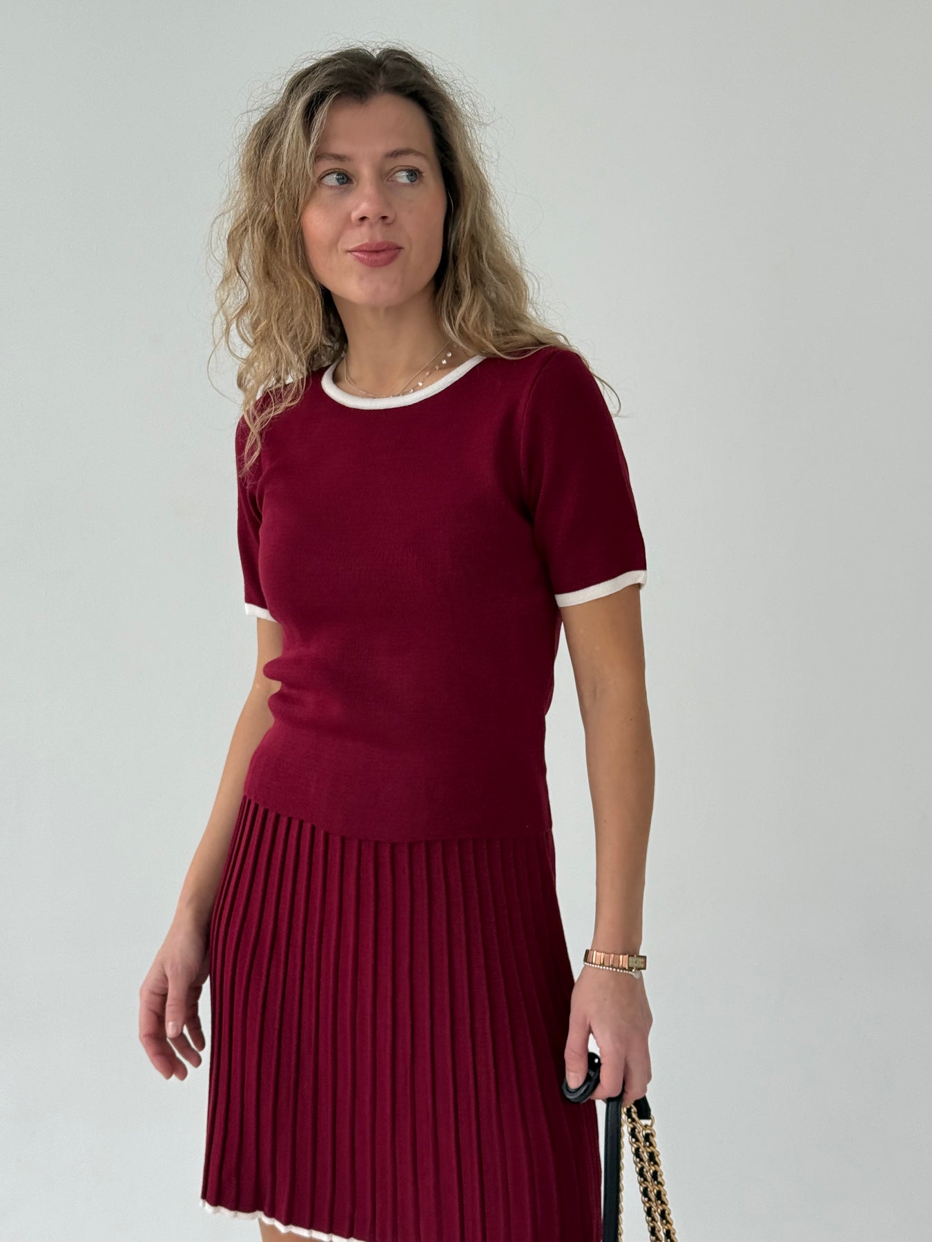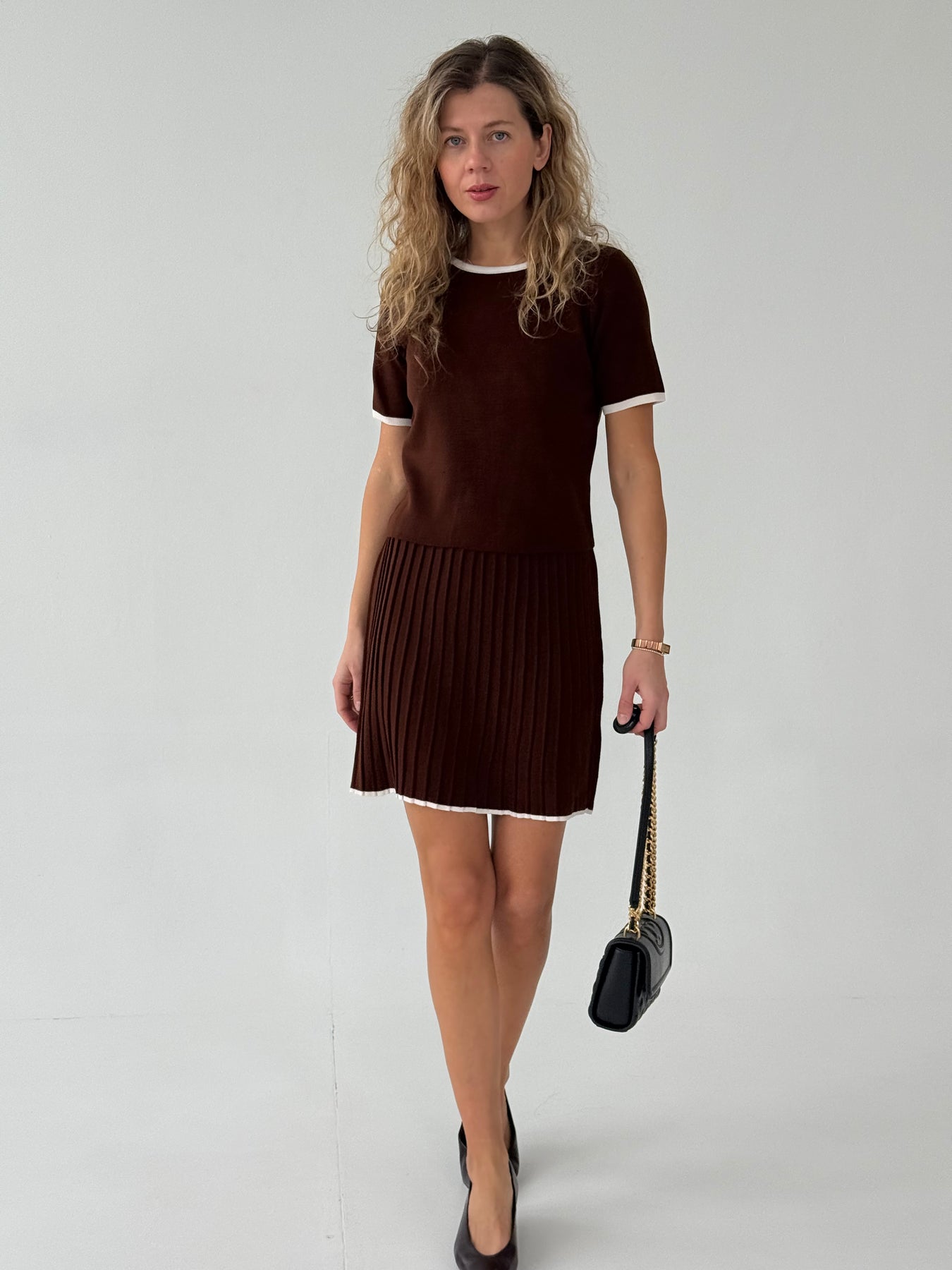 Trikotāžas plisētu svārku un topa komplekts. Tops ar apaļu kakla izgriezumu un īsām piedurknēm. Tops ir no mīksta un elastīga auduma. Tops ir puspieguļoša piegriezuma. Svārki ar paaugstinātu jostasvietu un iestrādātu gumiju jostasvietā. Svārki ir pustaisna piegriezuma.