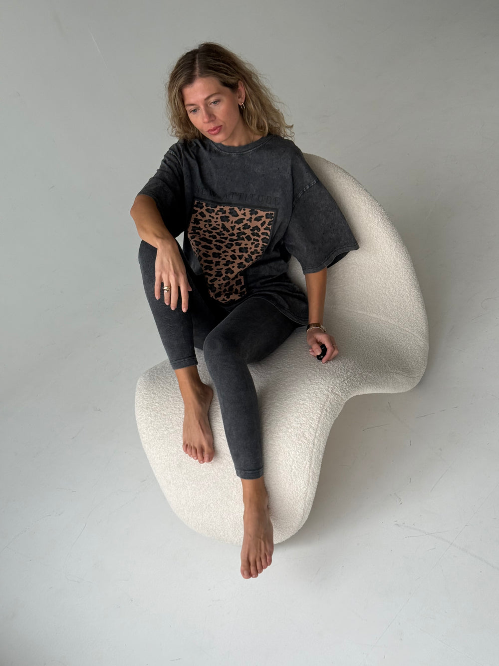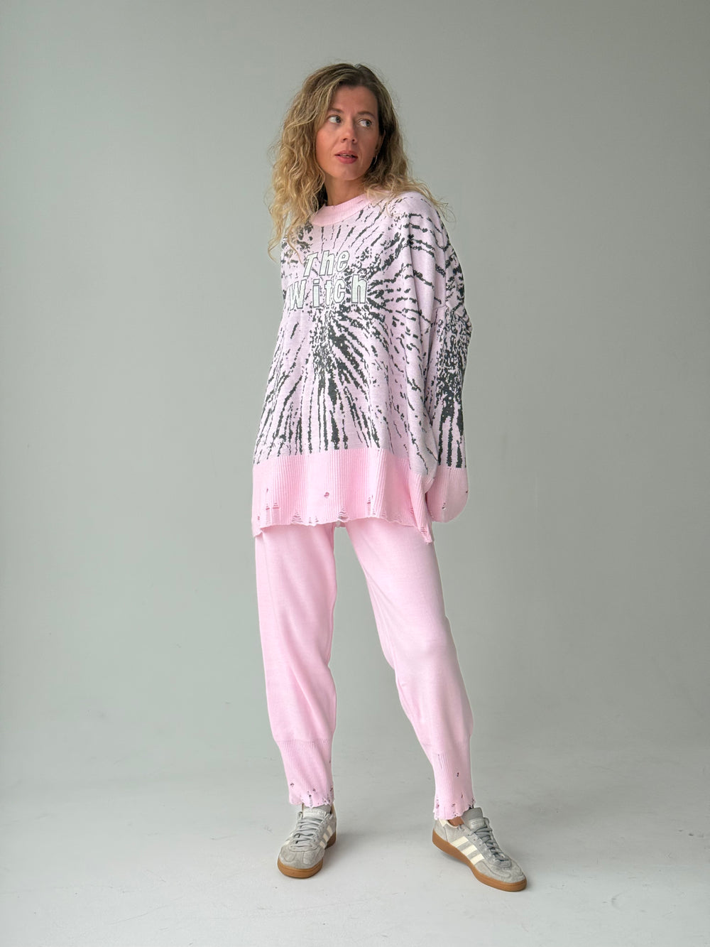 Trikotāžas bikšu kostīms ar uzrakstu un plēsumiem