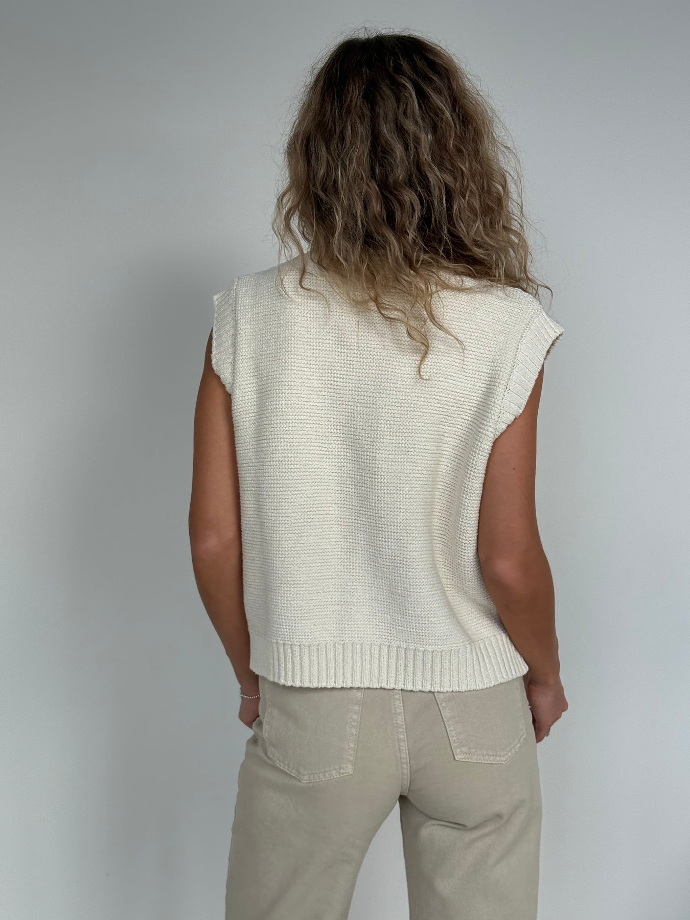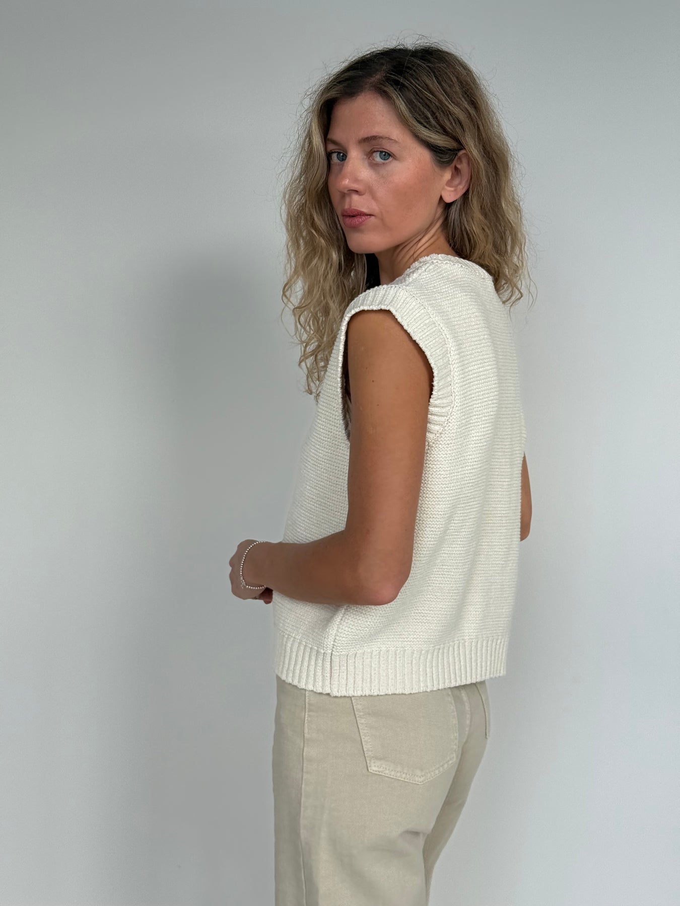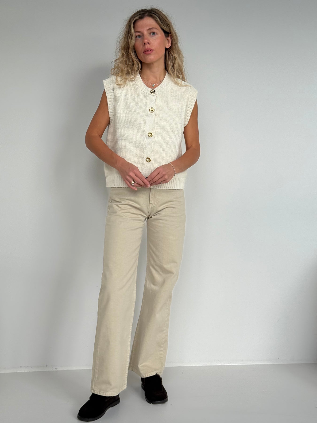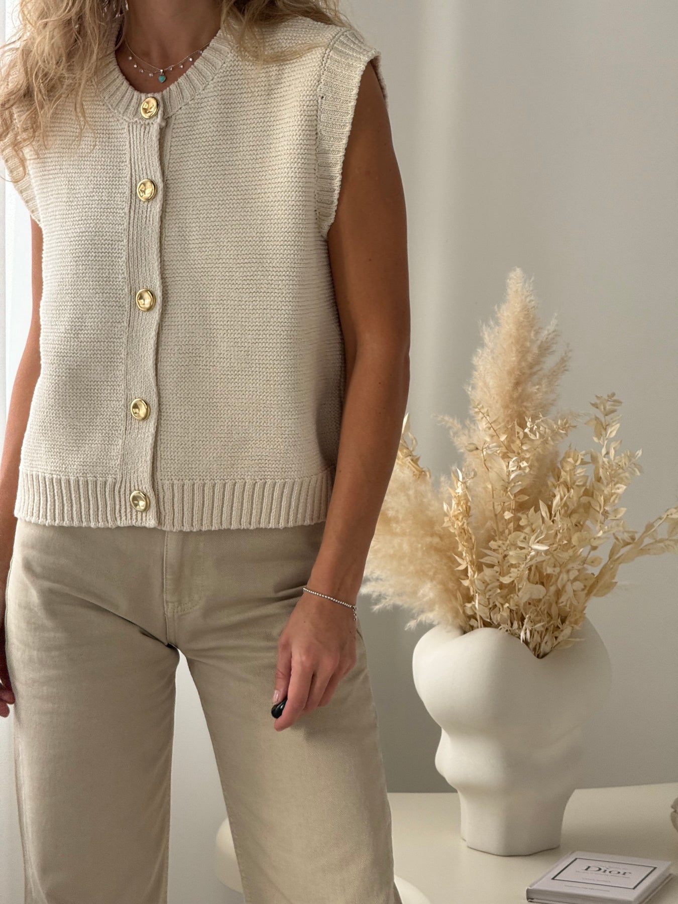 Adīta kokvilnas veste ar apaļu kakla izgriezumu. Veste no mīksta un elastīga auduma. Pogu aizdare priekšpusē. Veste ir taisna piegriezuma.