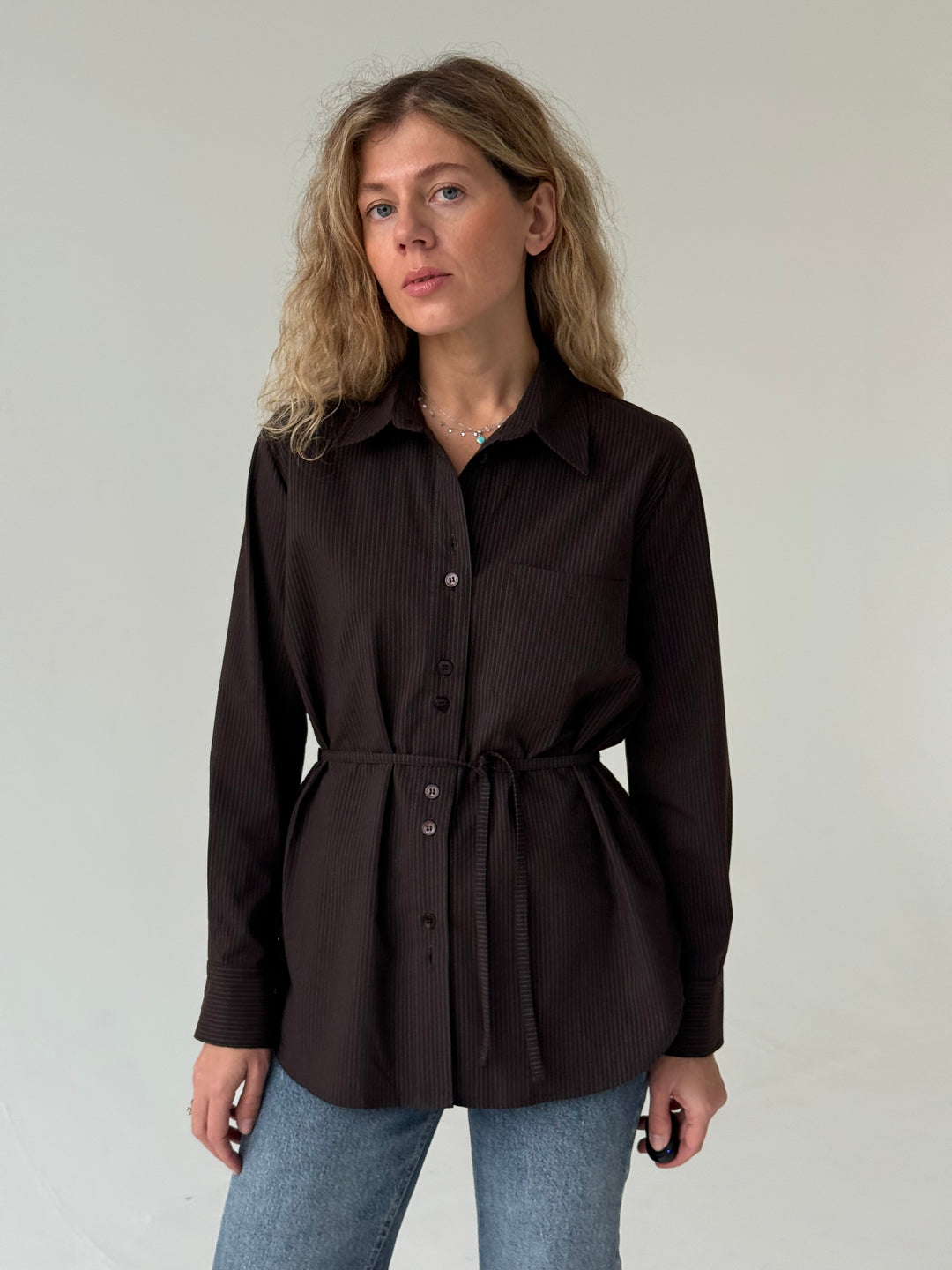 Kokvilnas svītrains krekls ar sasienamo jostiņu