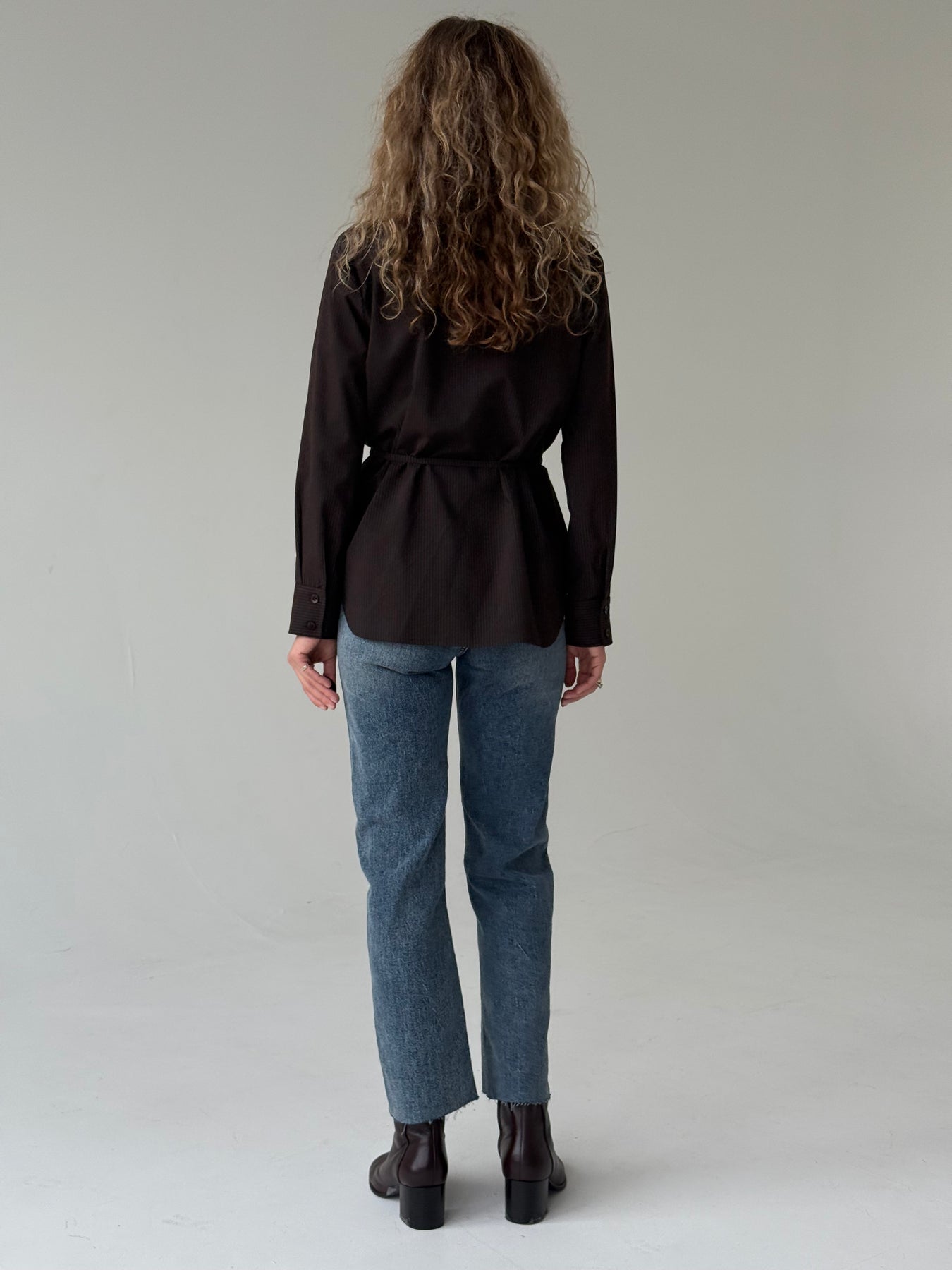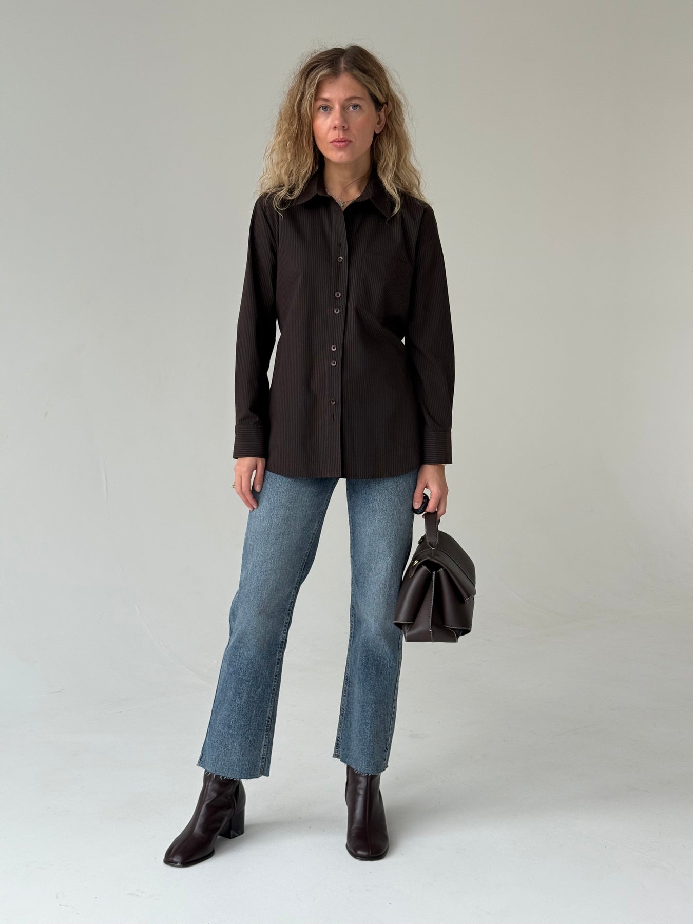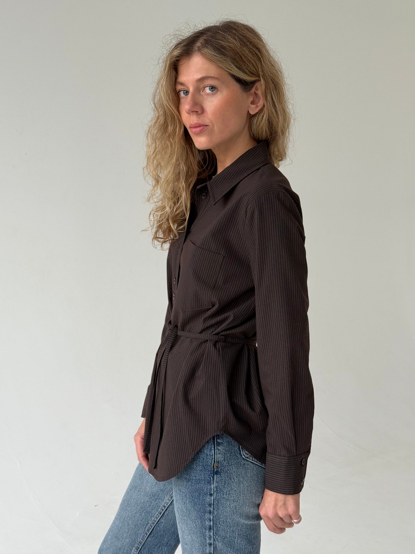 Kokvilnas svītrains krekls ar atloku apkakli, uzšūtu kabatu krūšu daļā, garām piedurknēm un noņemamo sasienamo jostiņu. Pogu aizdare priekšpusē. Krekls ir pustaisna piegriezuma.