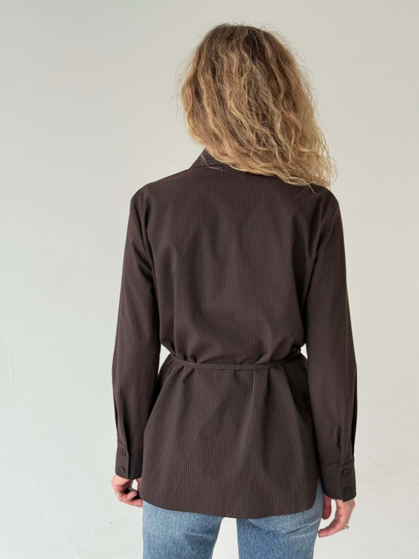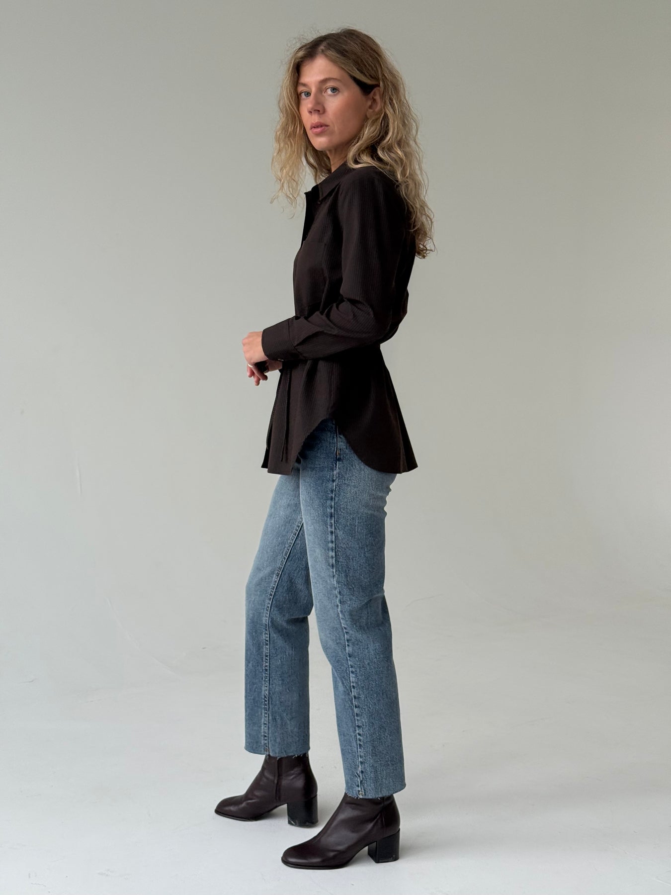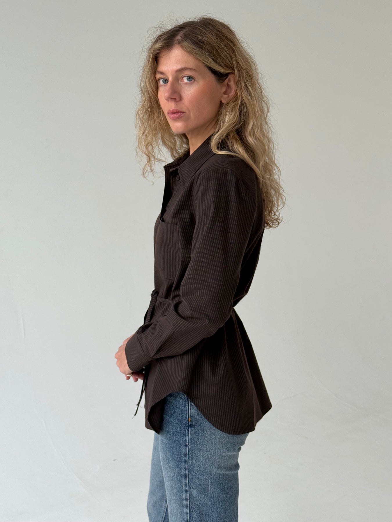 Kokvilnas svītrains krekls ar atloku apkakli, uzšūtu kabatu krūšu daļā, garām piedurknēm un noņemamo sasienamo jostiņu. Pogu aizdare priekšpusē. Krekls ir pustaisna piegriezuma.