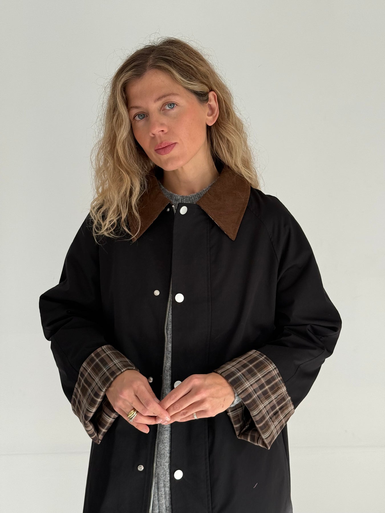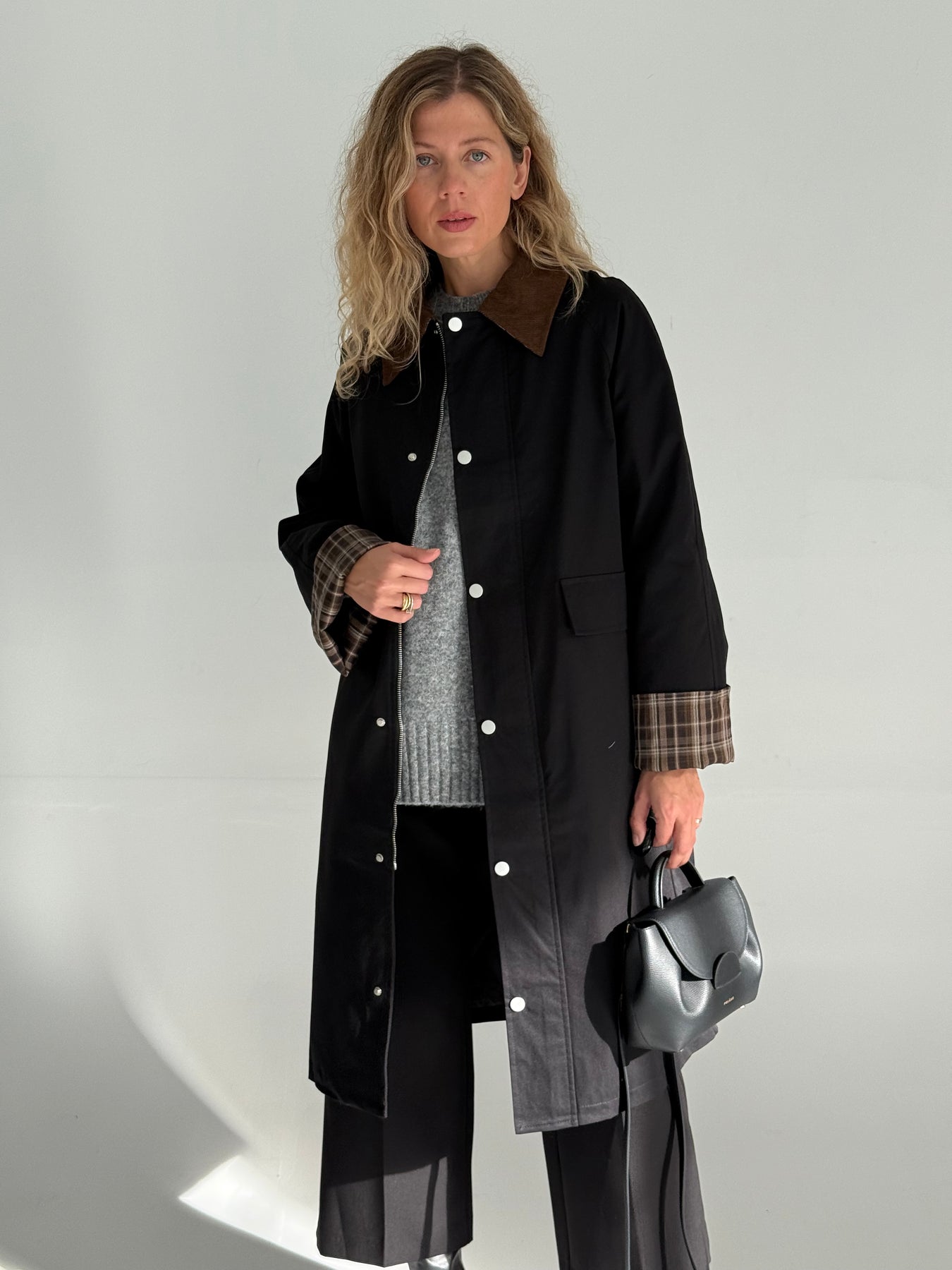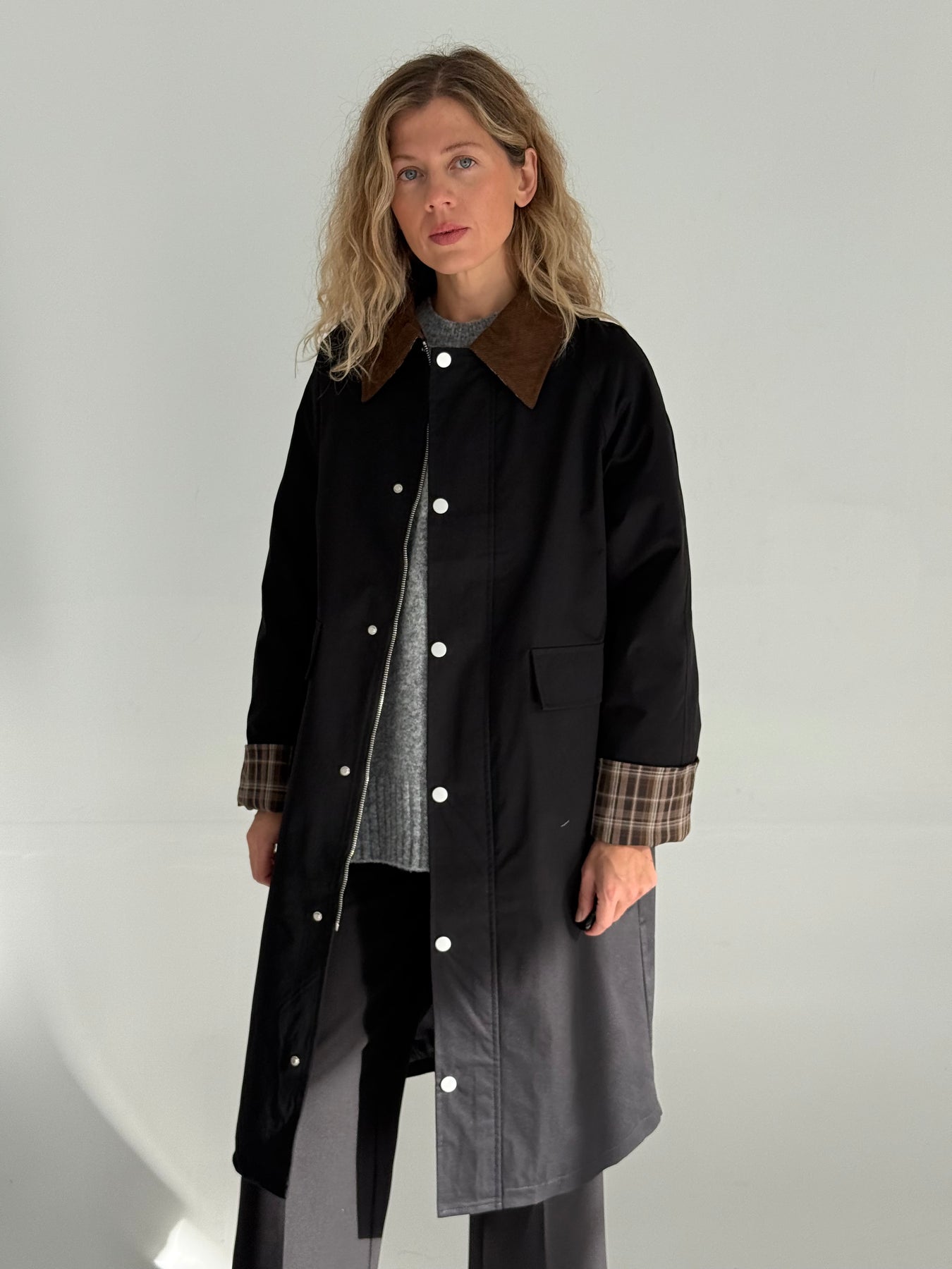 Trencis ar smailgala velveta atloku apkakli, oderi un pazeminātu plecu daļu. Garas un regulējamās piedurknes ar rūtainu oderi pie aprocēm. Priekšpusē ir divas uzšūtas kabatas ar pārloku. Aiztaisās ar spiedpogām un rāvējslēdzēju. Trencis ir taisna piegriezuma.