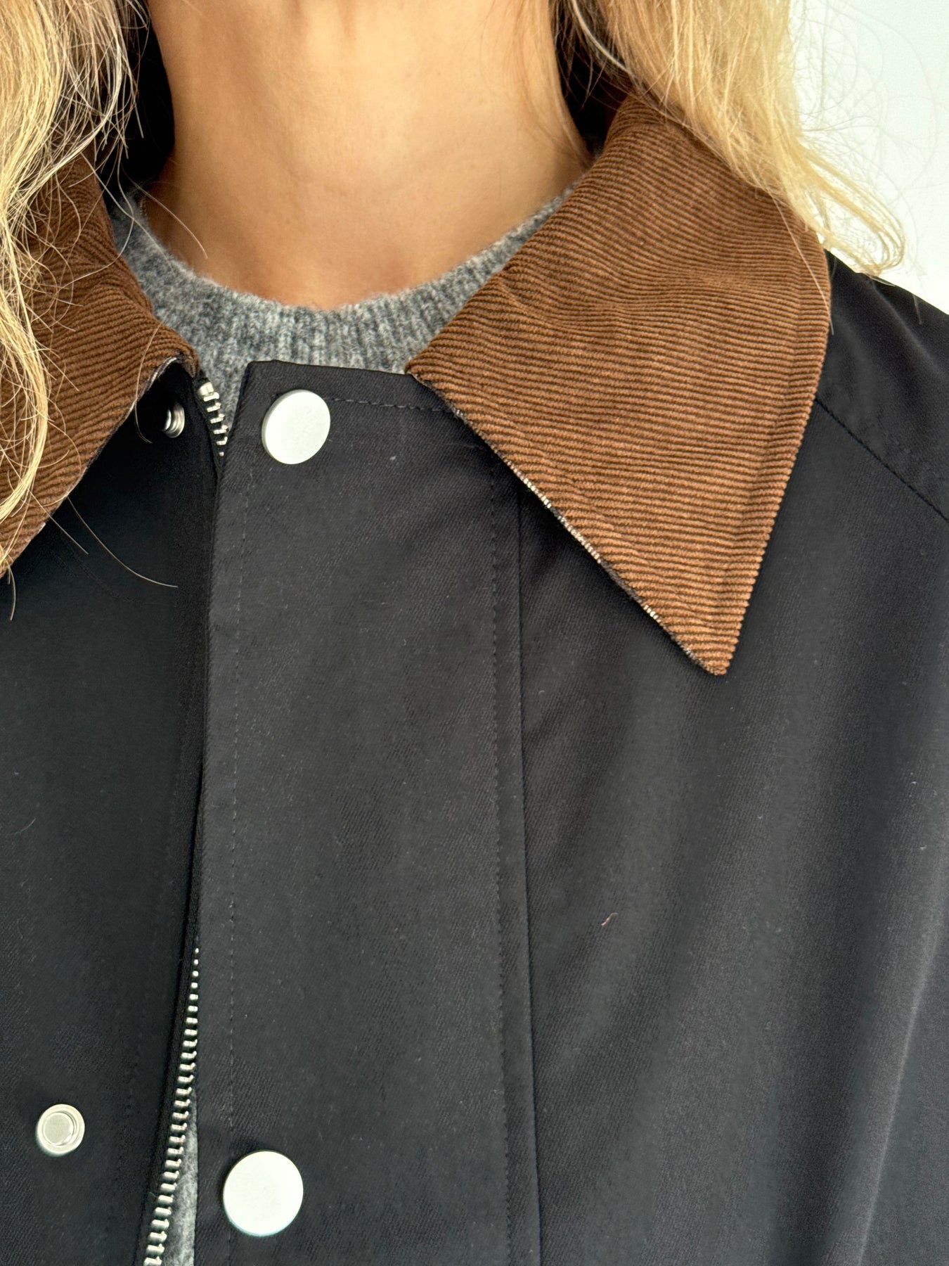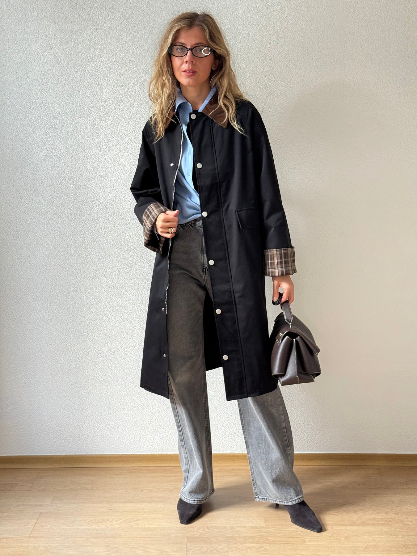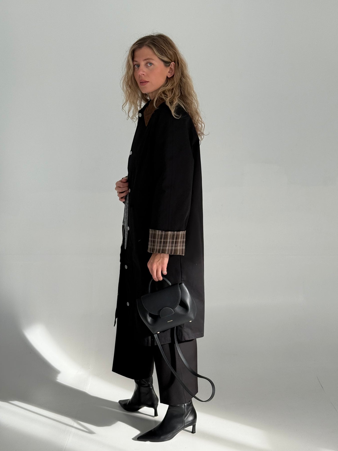 Trencis ar smailgala velveta atloku apkakli, oderi un pazeminātu plecu daļu. Garas un regulējamās piedurknes ar rūtainu oderi pie aprocēm. Priekšpusē ir divas uzšūtas kabatas ar pārloku. Aiztaisās ar spiedpogām un rāvējslēdzēju. Trencis ir taisna piegriezuma.