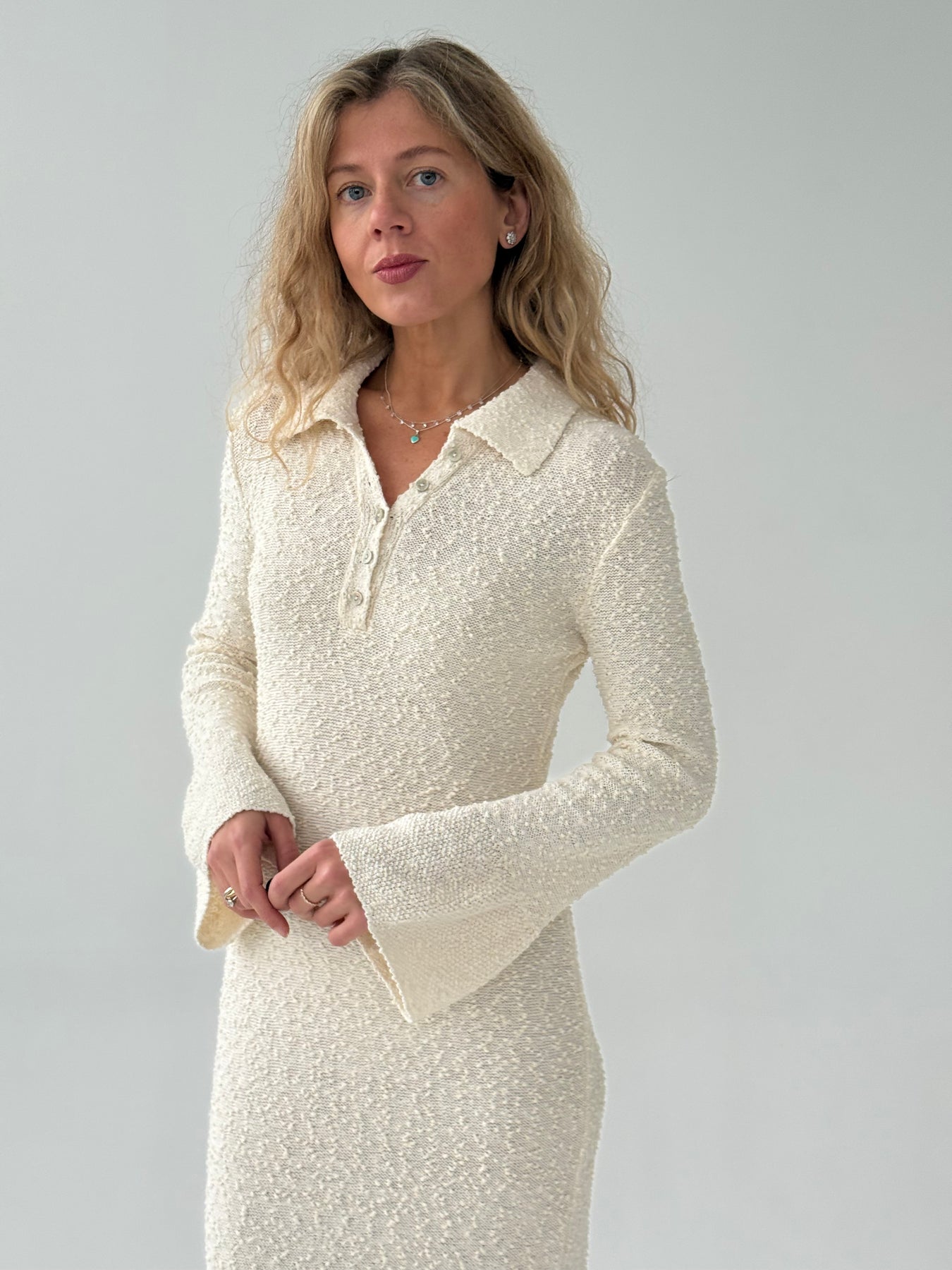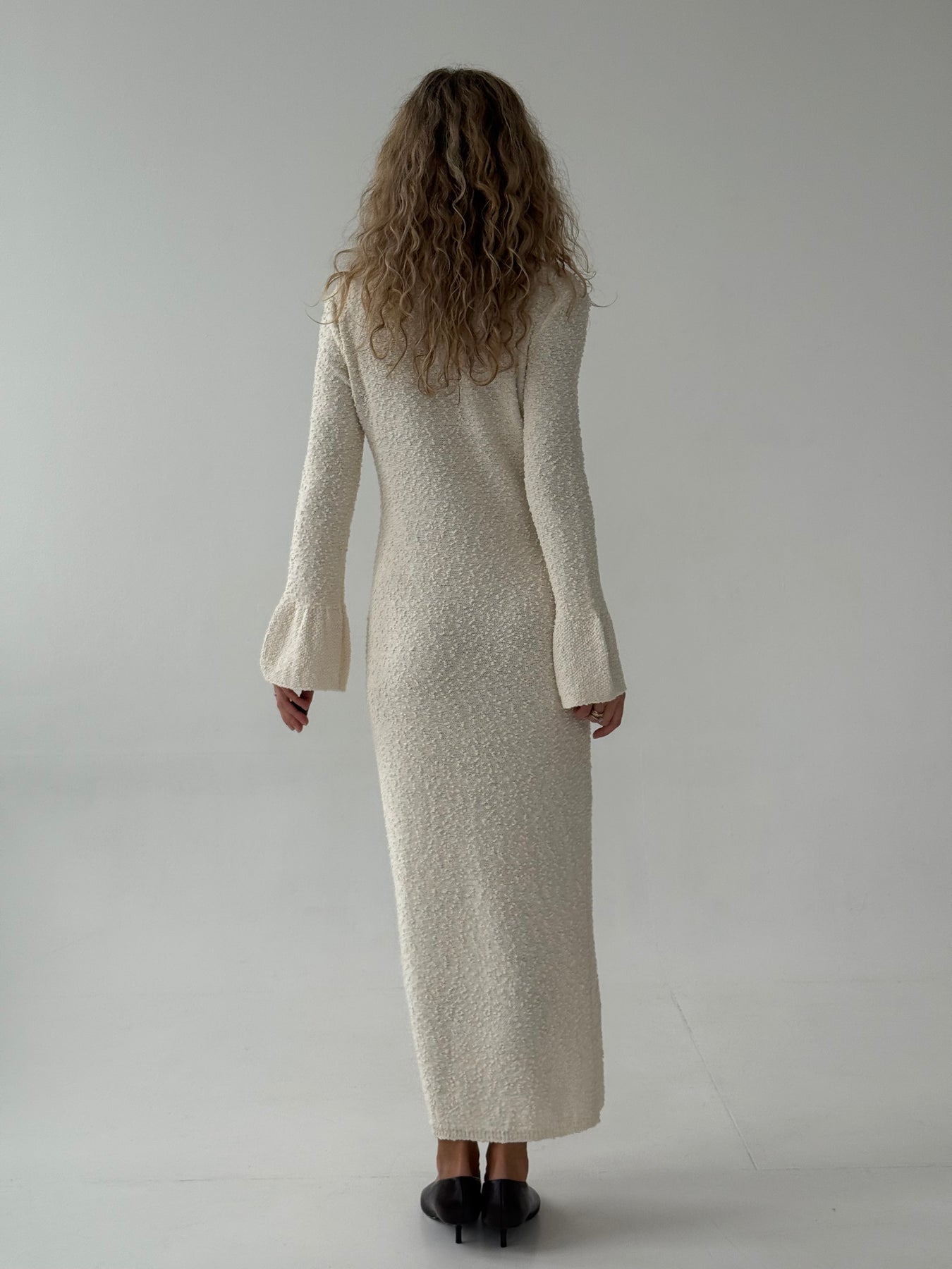 Gara buklē kleita ar atloku apkakli un garām piedurknēm. Kleita ir no mīksta un elastīga auduma. Pogu aizdare priekšpusē. Kleita ir pieguļoša piegriezuma.