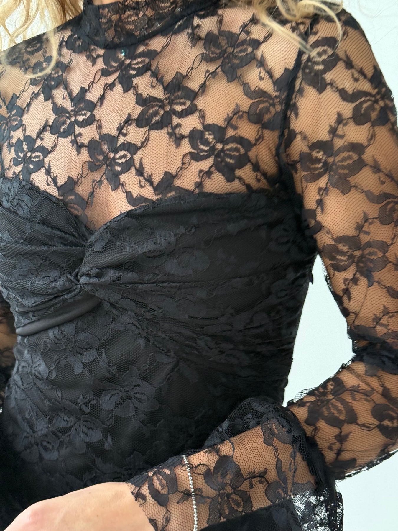 Midi mežģīņu kleita ar vidēji augstu apkakli un garām piedurknēm. Kleita ir no mīksta un elastīga auduma. Kleita ar oderi. Aiztaisās ar neredzamu rāvējslēdzēju mugurpusē. Kleita ir pieguļoša piegriezuma.
