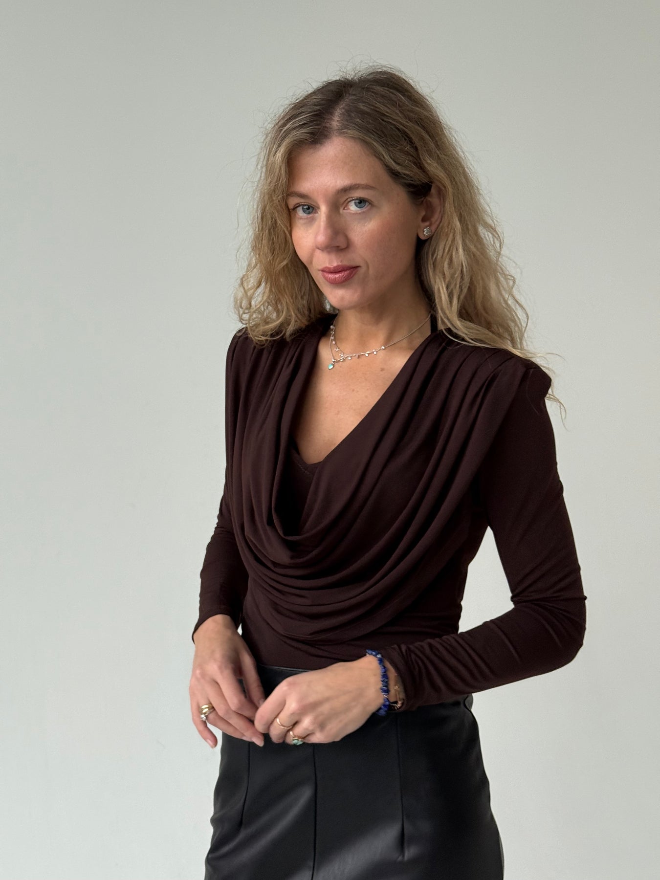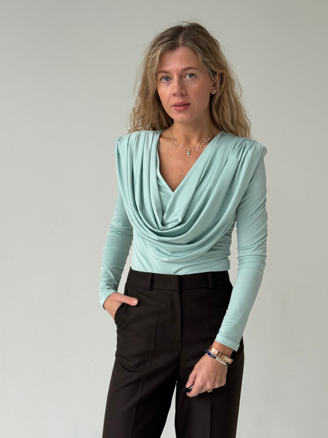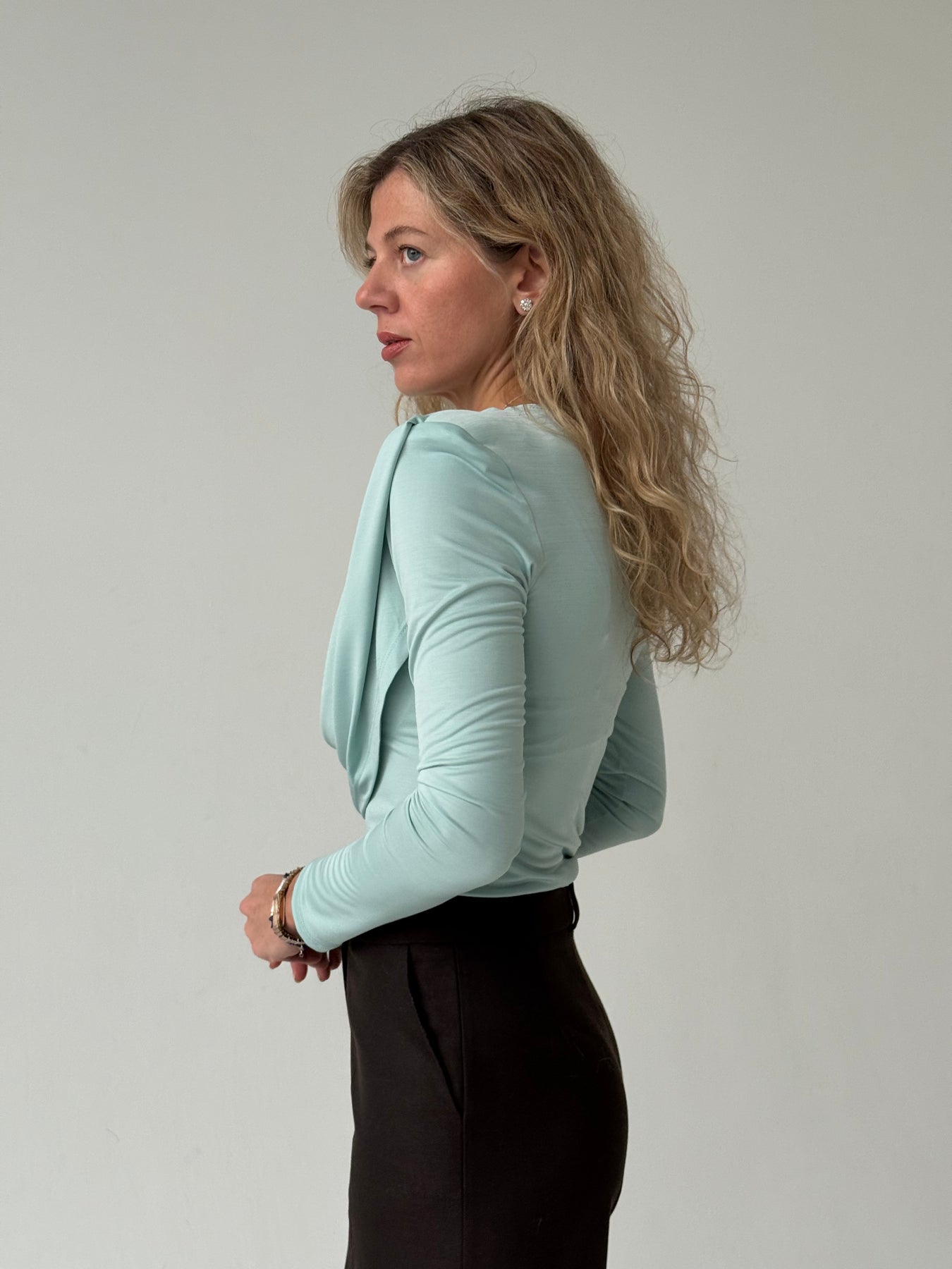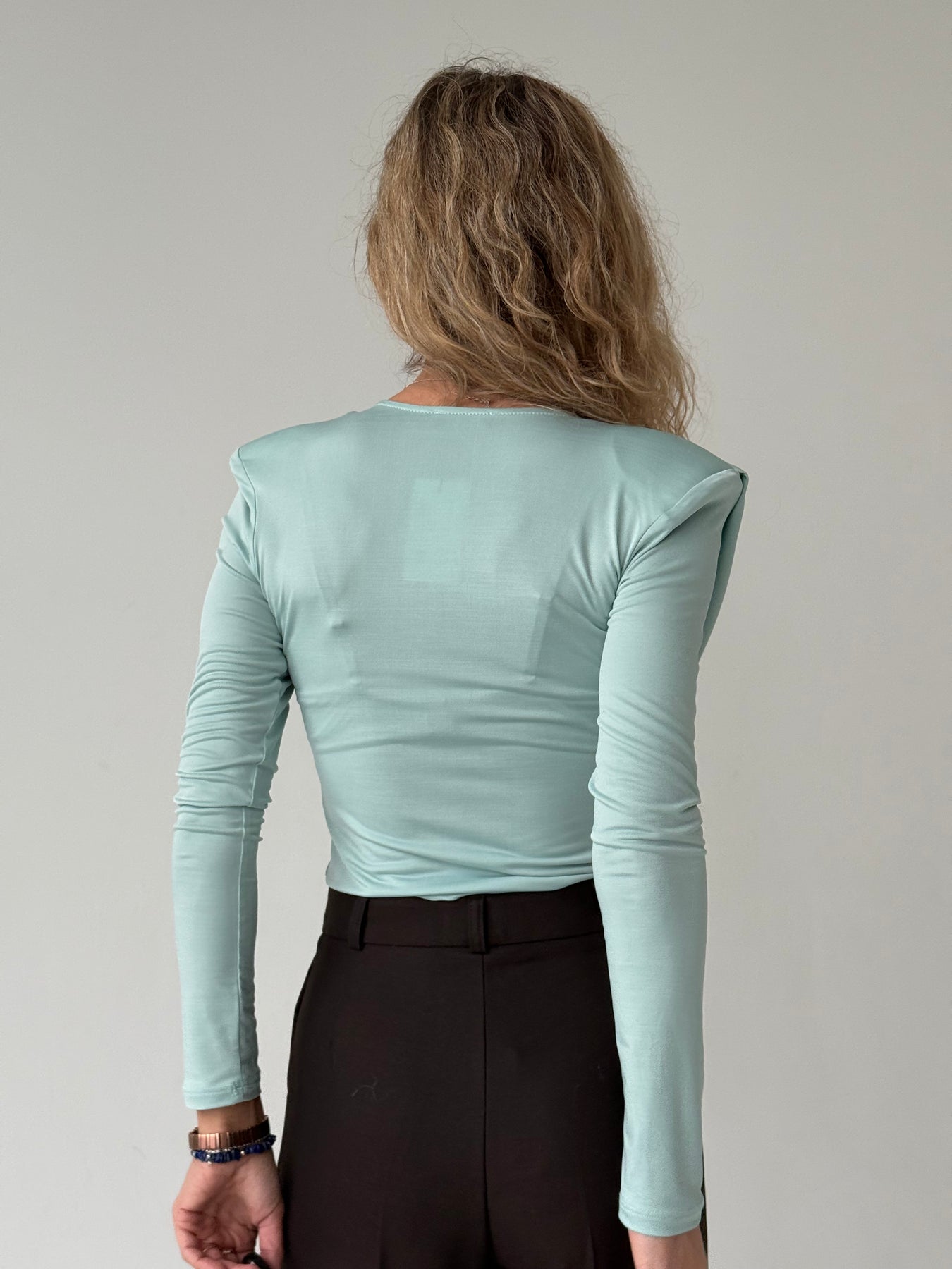 Slim fit viskozes tops ar V-veida kakla izgriezumu, krokojumu un garām piedurknēm. Tops ir no elastīga un mīksta auduma. Tops ir pieguļoša piegriezuma.