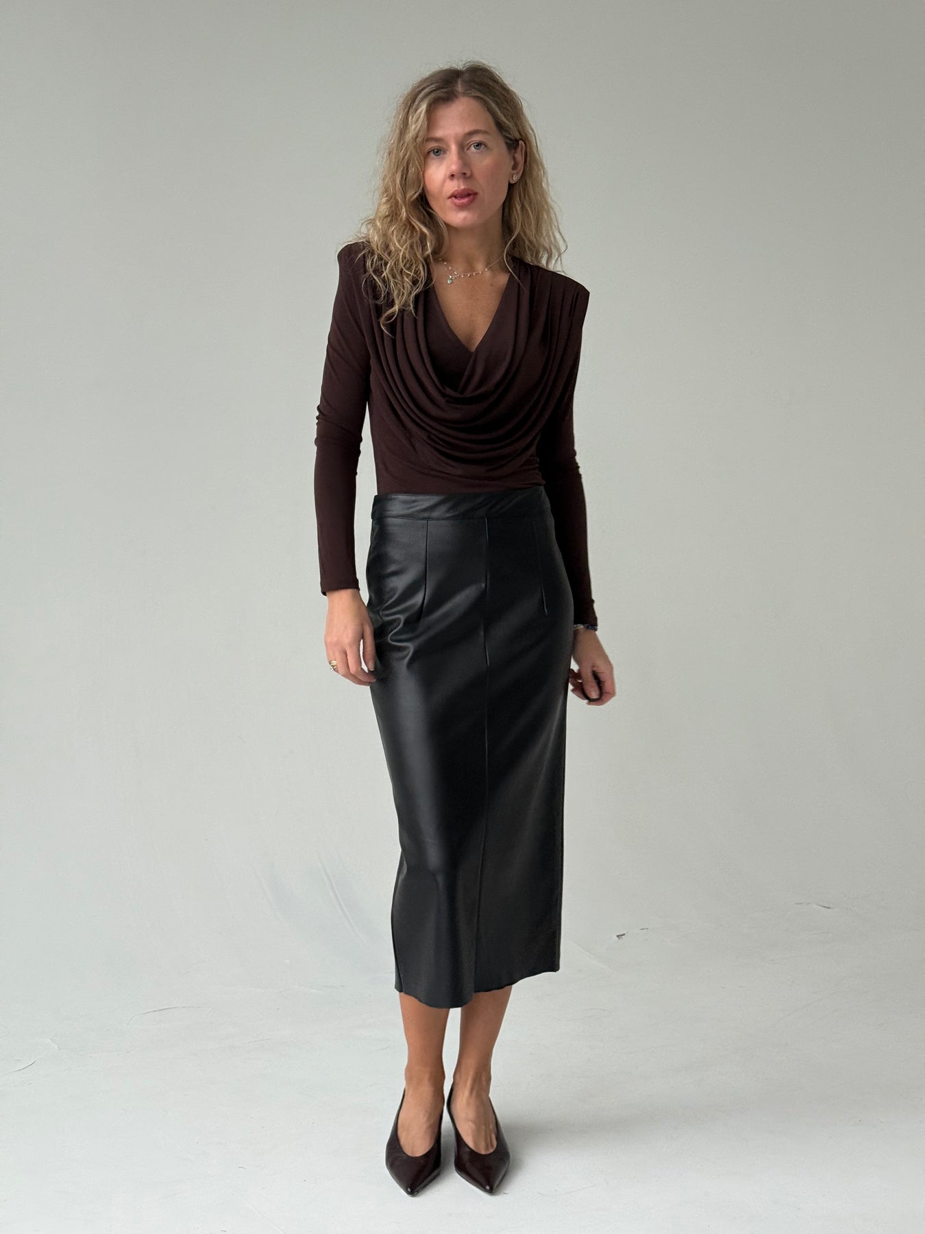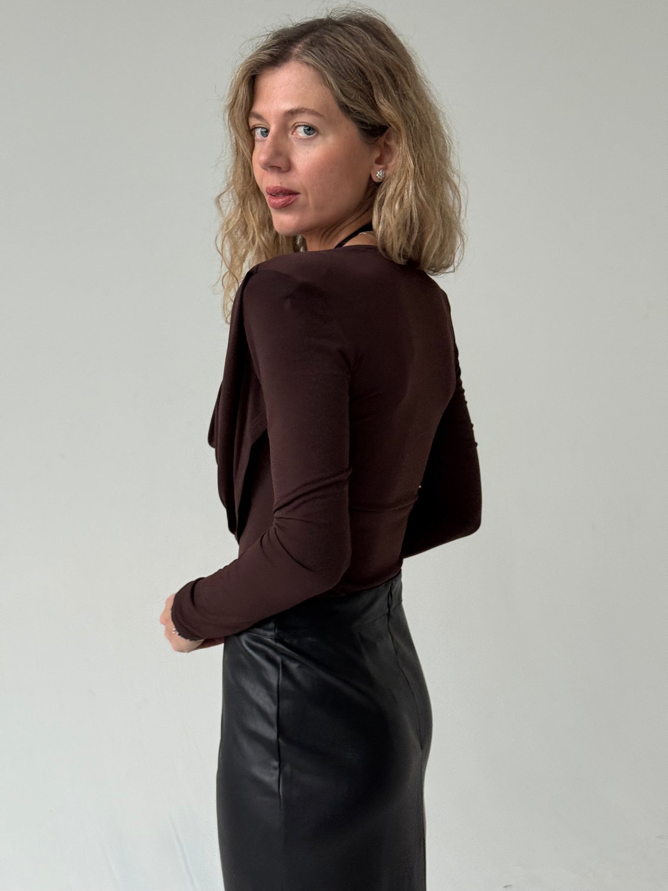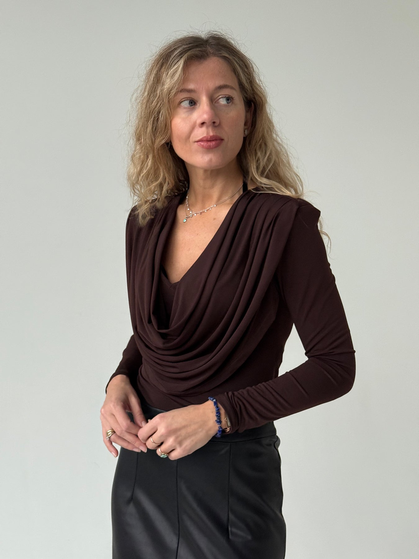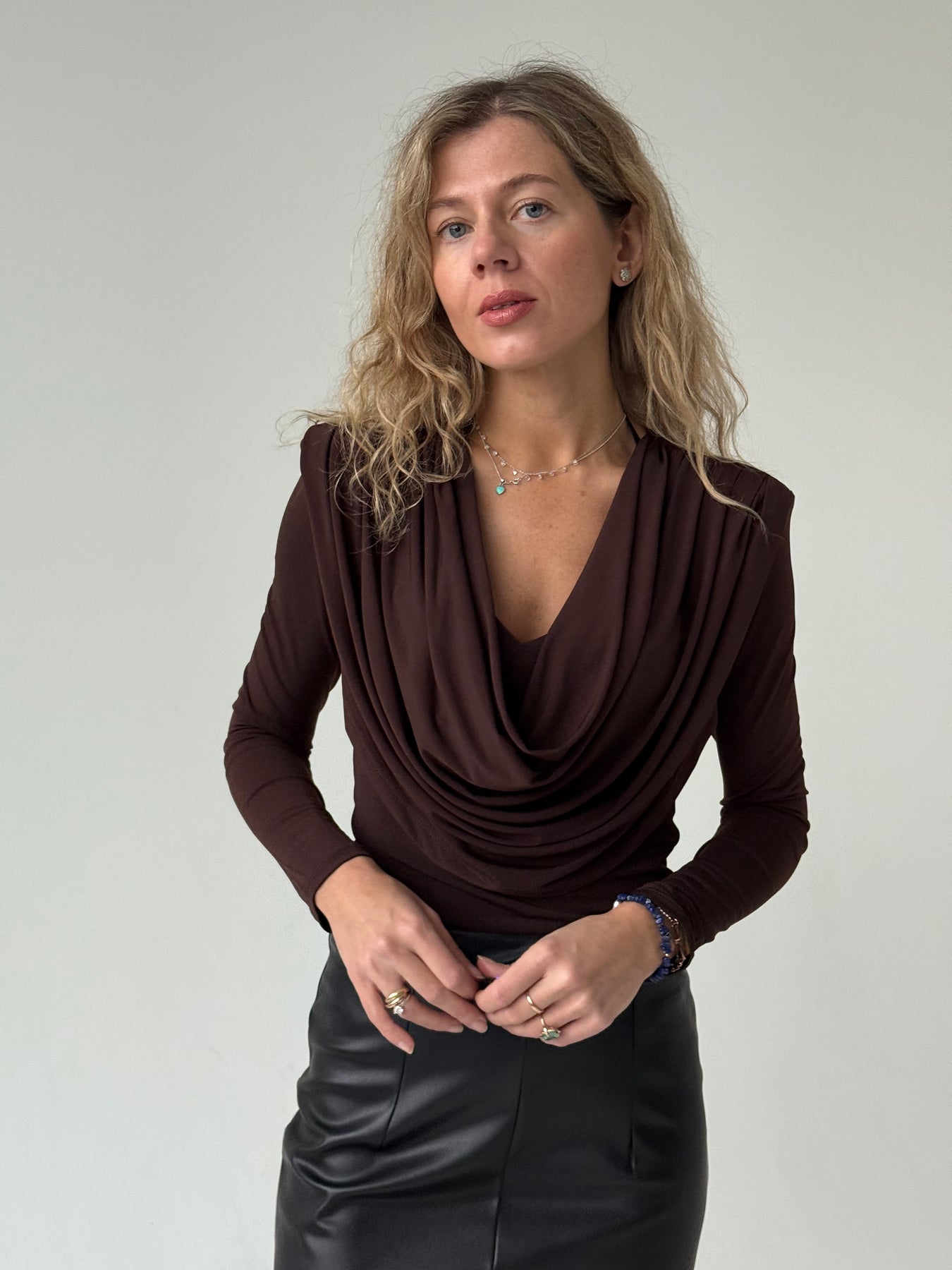 Slim fit viskozes tops ar V-veida kakla izgriezumu, krokojumu un garām piedurknēm. Tops ir no elastīga un mīksta auduma. Tops ir pieguļoša piegriezuma.