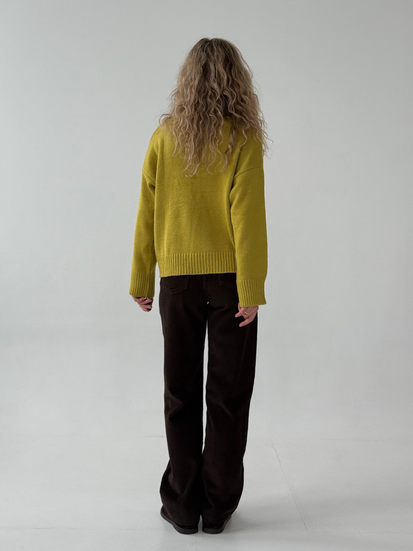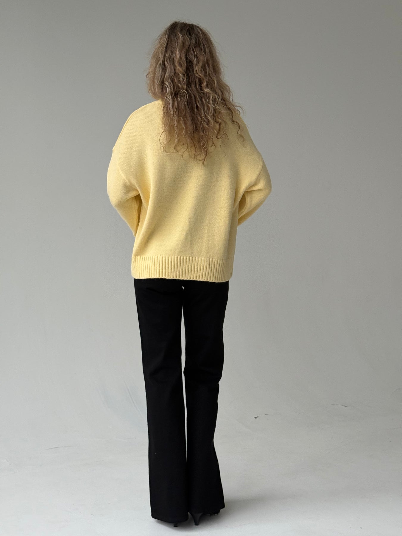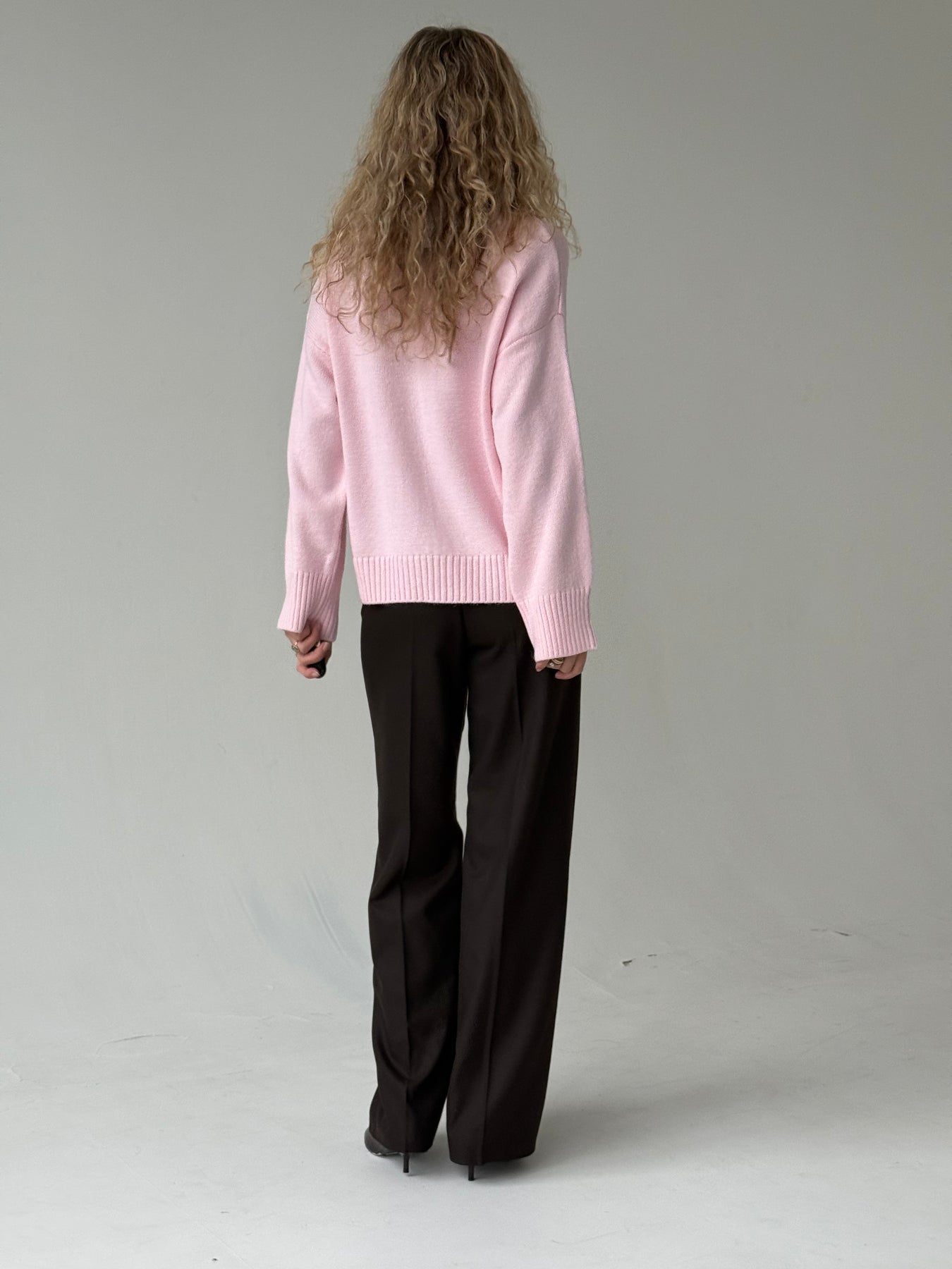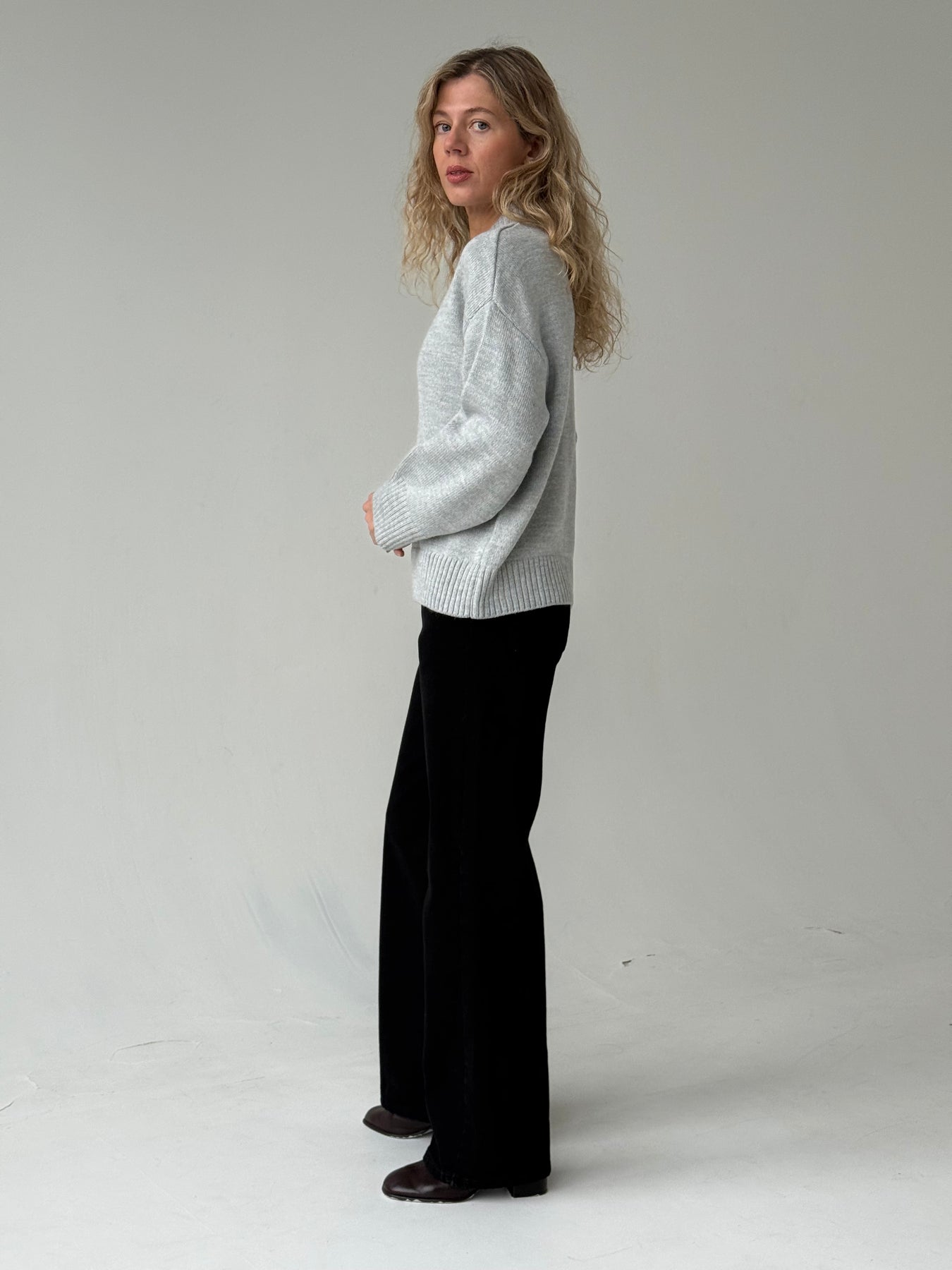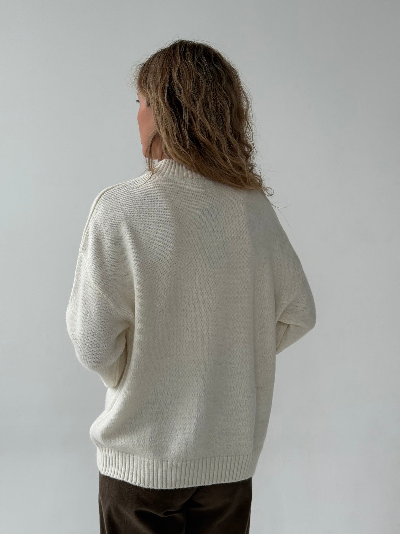Adīts džemperis ar apaļu kakla izgriezumu, pazeminātu plecu daļu un garām piedurknēm. Džemperis ir no mīksta auduma. Džemperis ir pustaisna piegriezuma. Rievotas apmales.