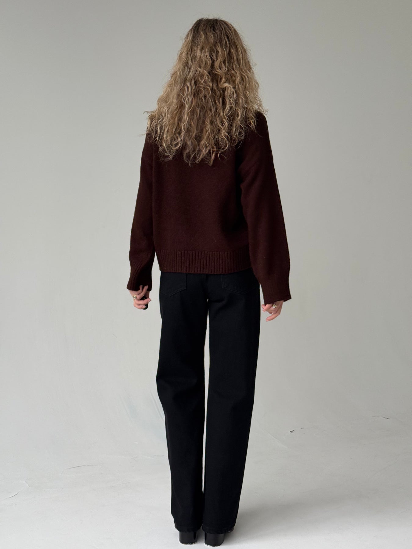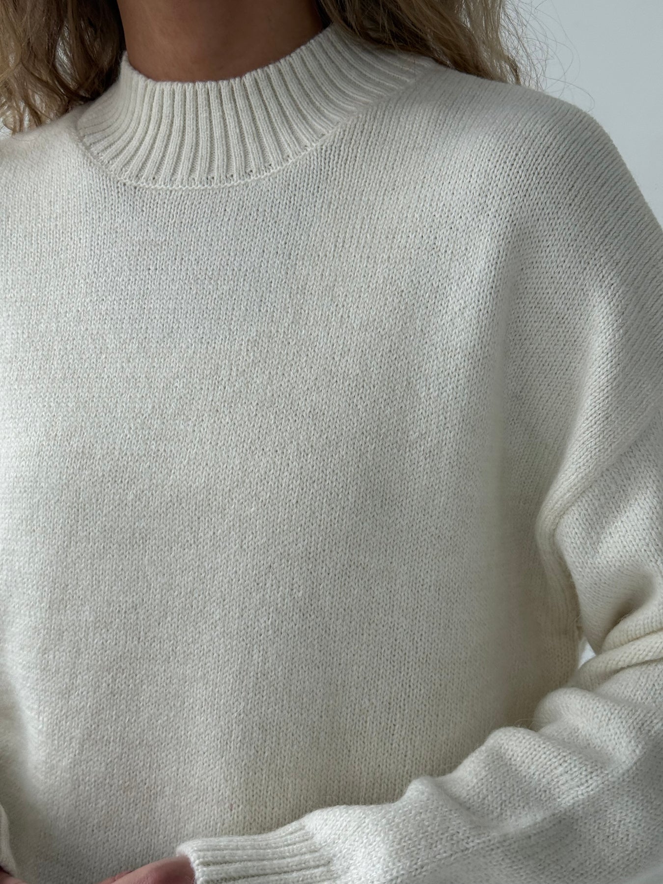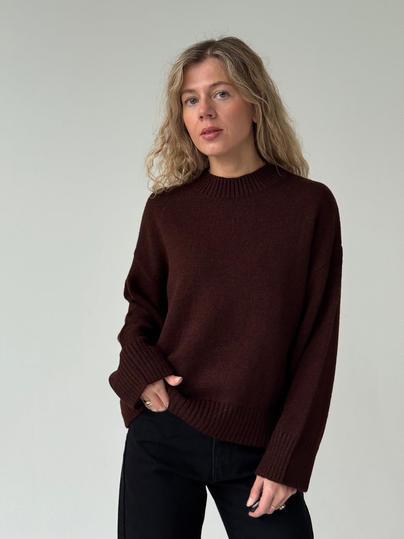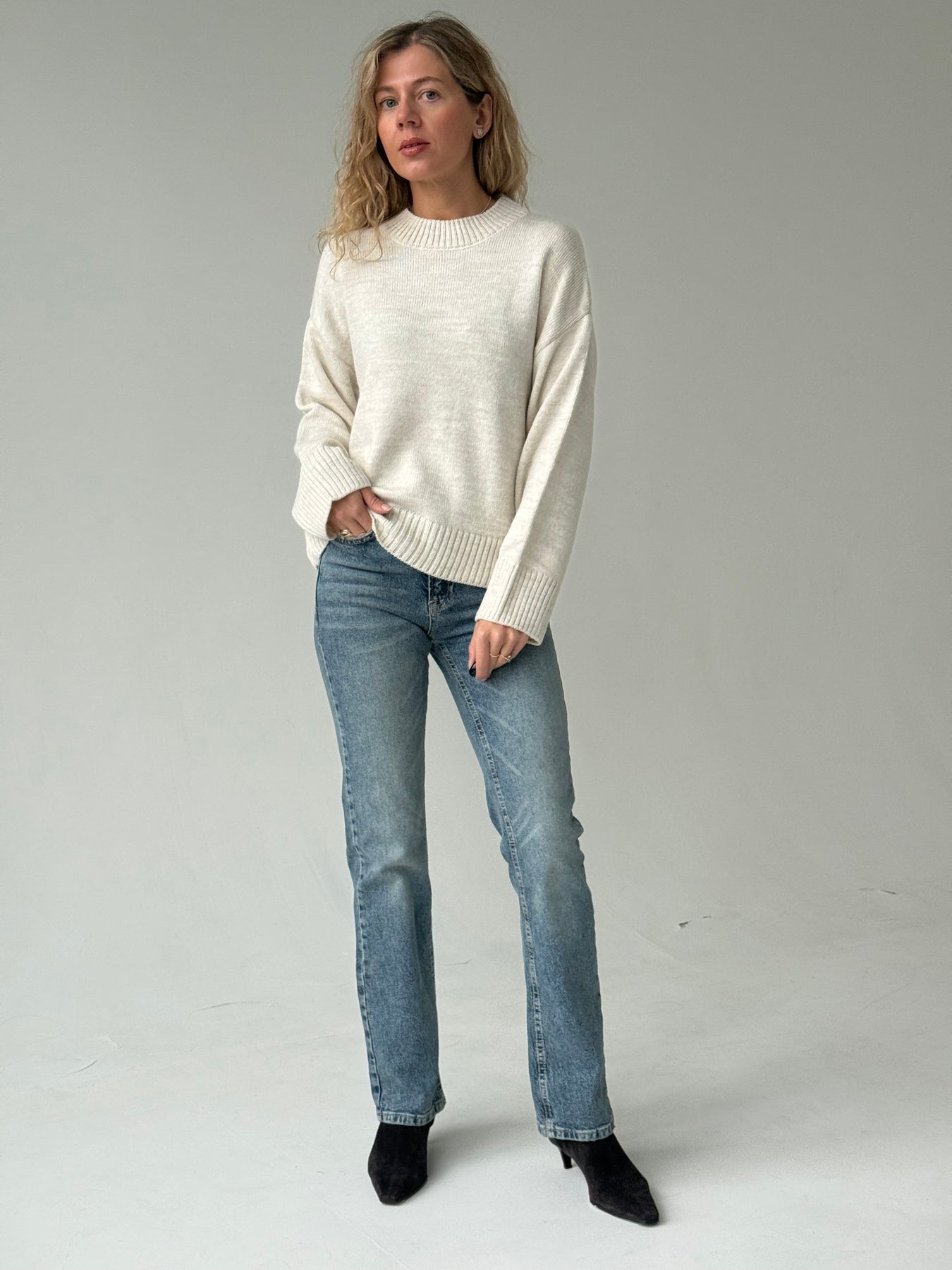 Adīts džemperis ar apaļu kakla izgriezumu, pazeminātu plecu daļu un garām piedurknēm. Džemperis ir no mīksta auduma. Džemperis ir pustaisna piegriezuma. Rievotas apmales.