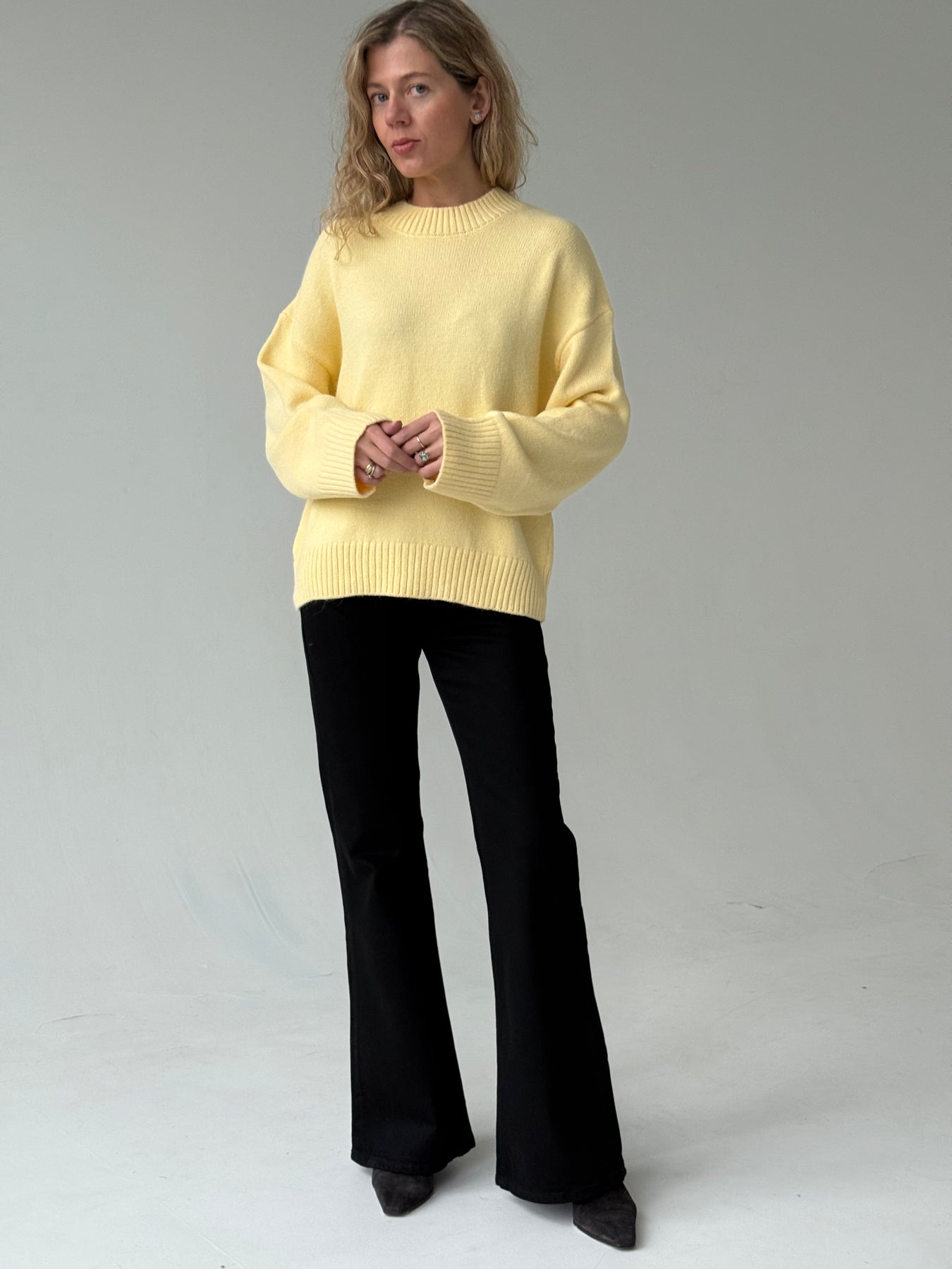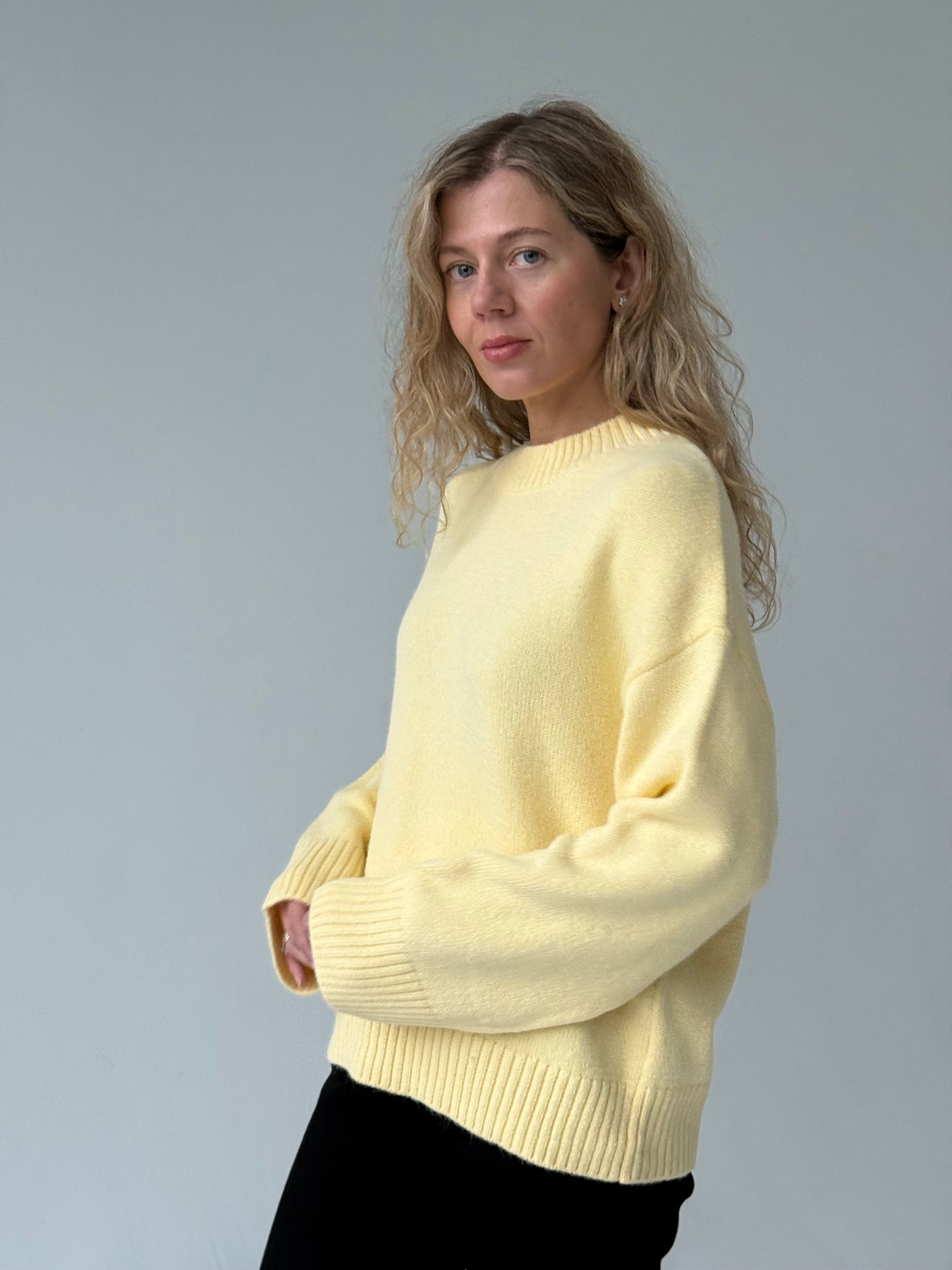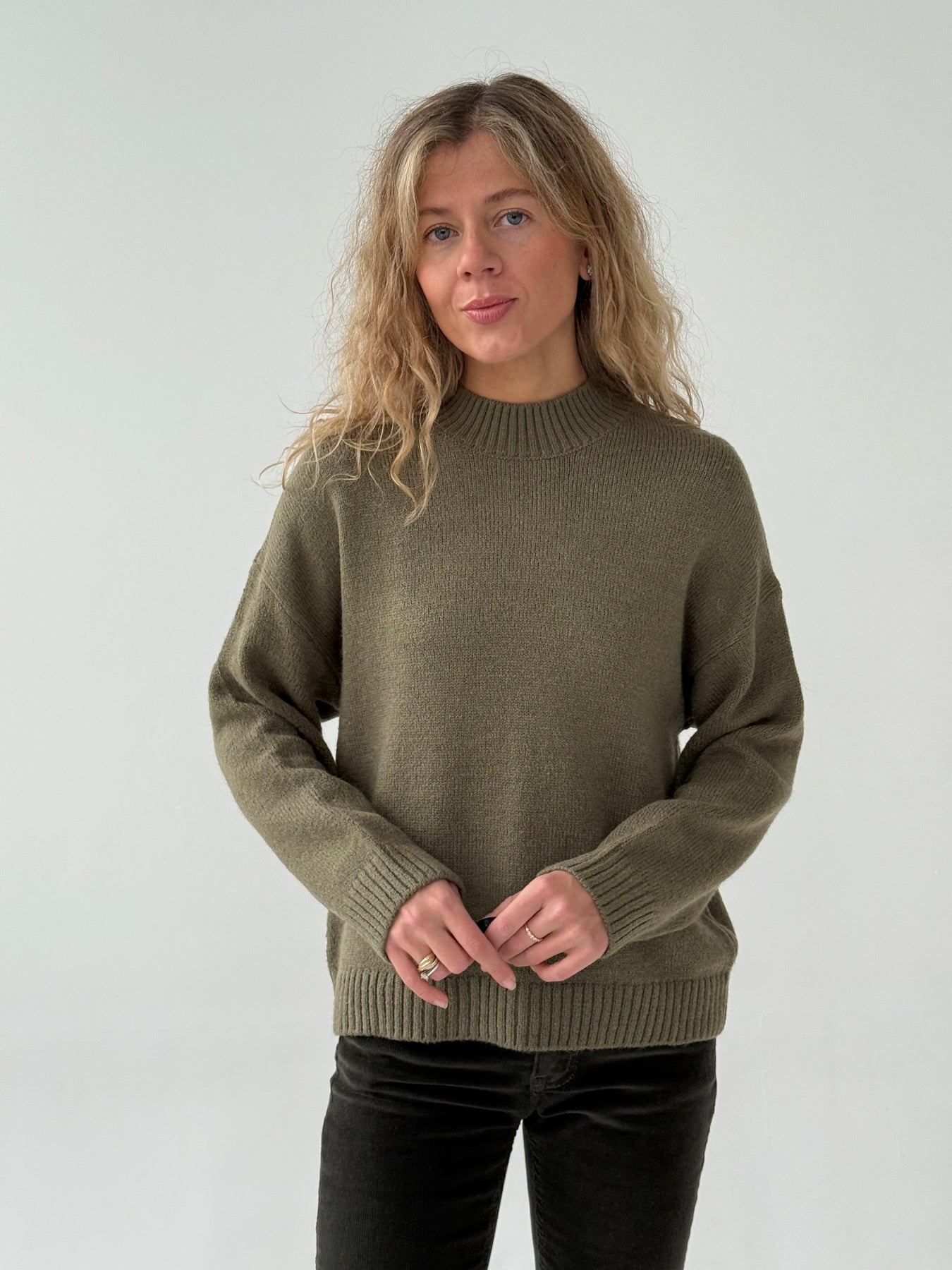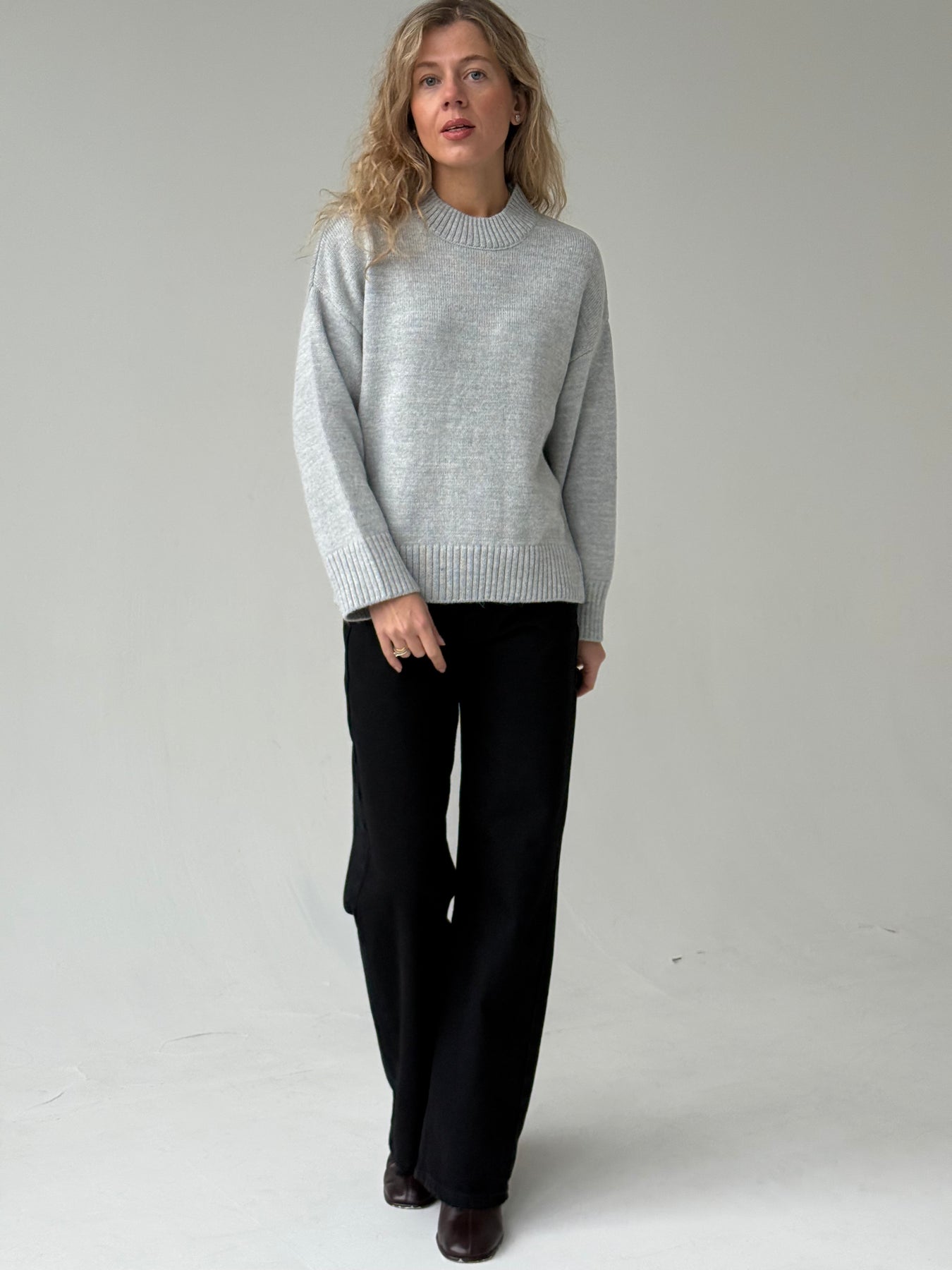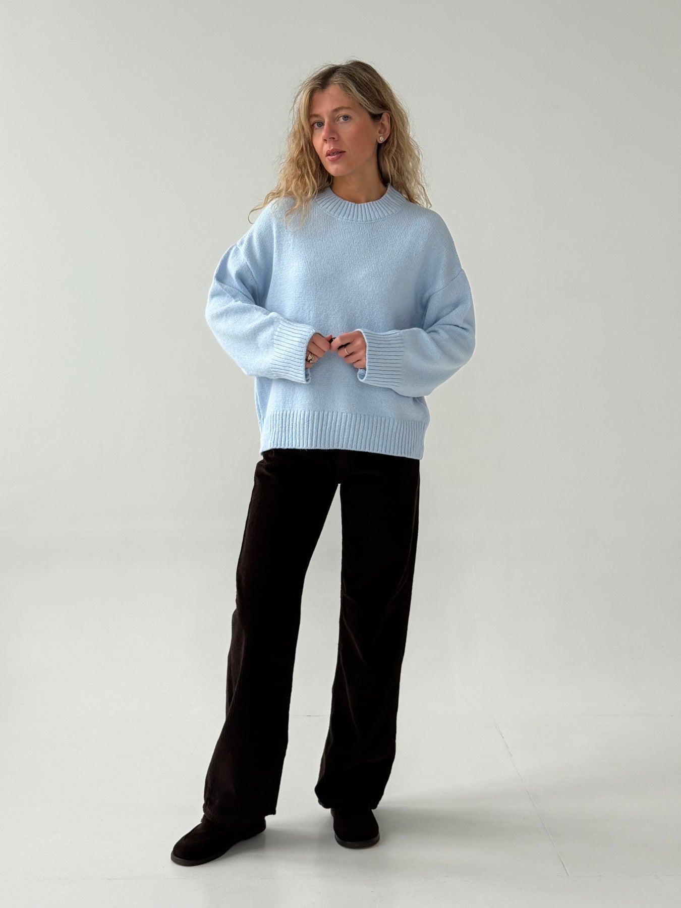 Adīts džemperis ar apaļu kakla izgriezumu, pazeminātu plecu daļu un garām piedurknēm. Džemperis ir no mīksta auduma. Džemperis ir pustaisna piegriezuma. Rievotas apmales.