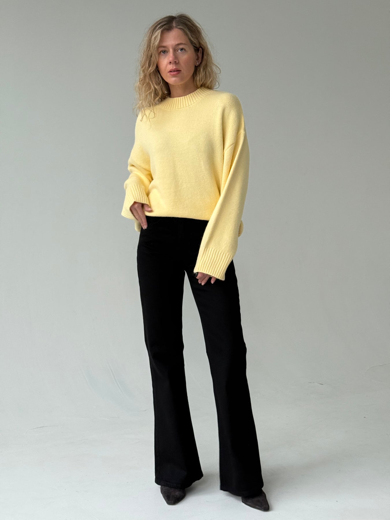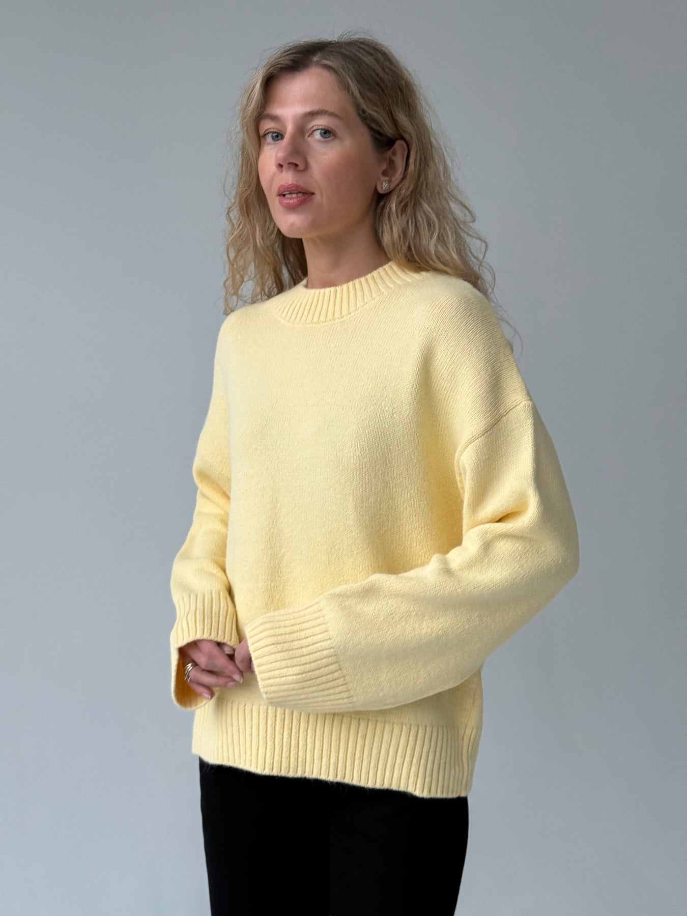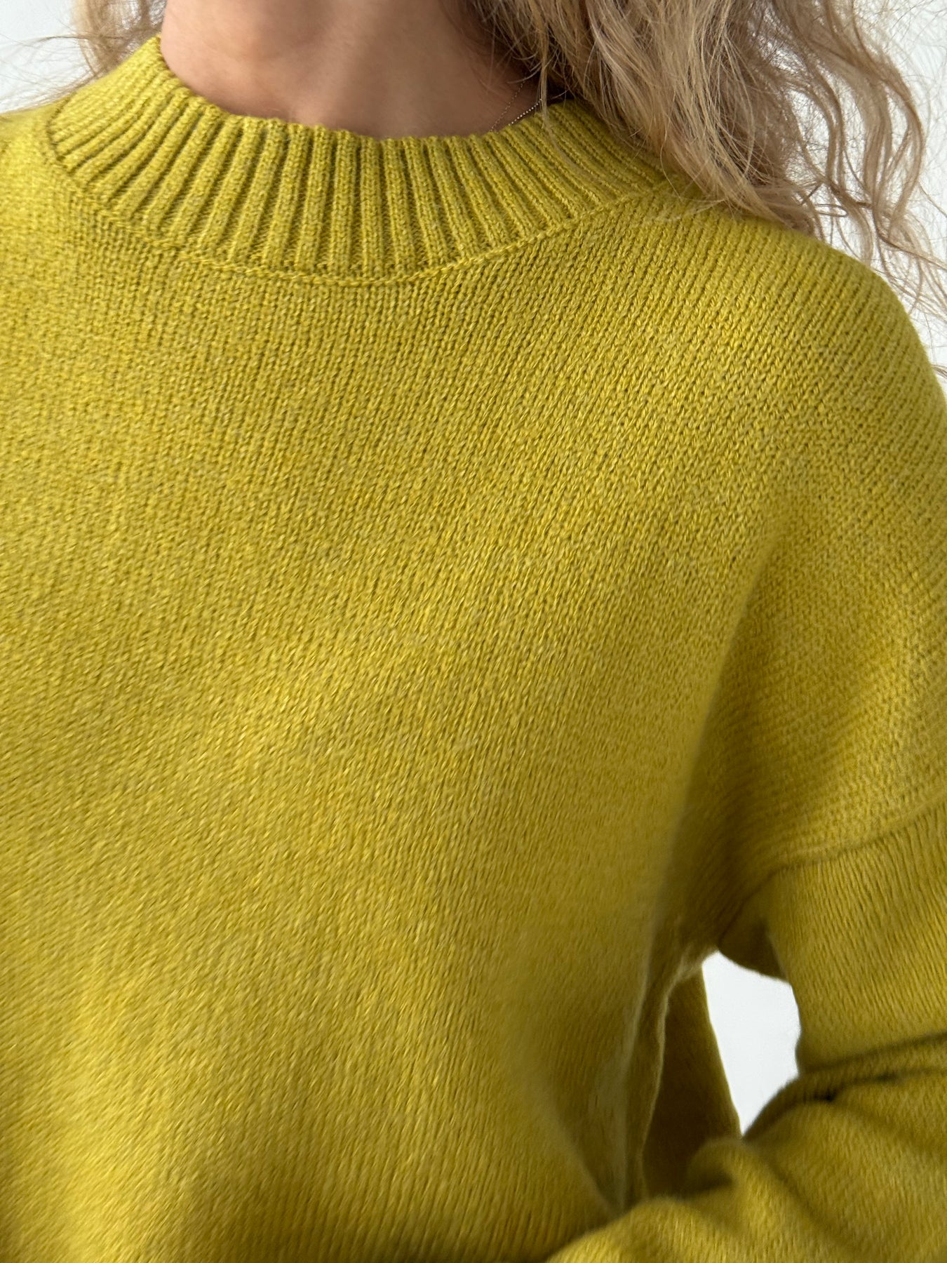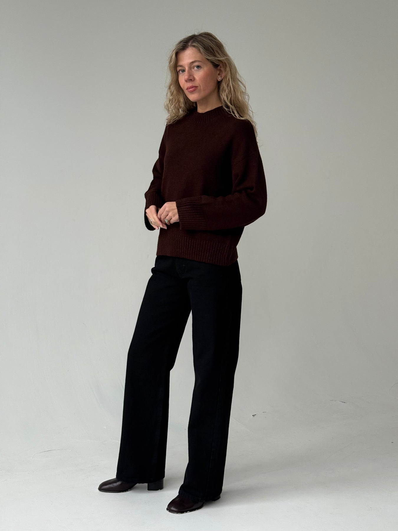 Adīts džemperis ar apaļu kakla izgriezumu, pazeminātu plecu daļu un garām piedurknēm. Džemperis ir no mīksta auduma. Džemperis ir pustaisna piegriezuma. Rievotas apmales.