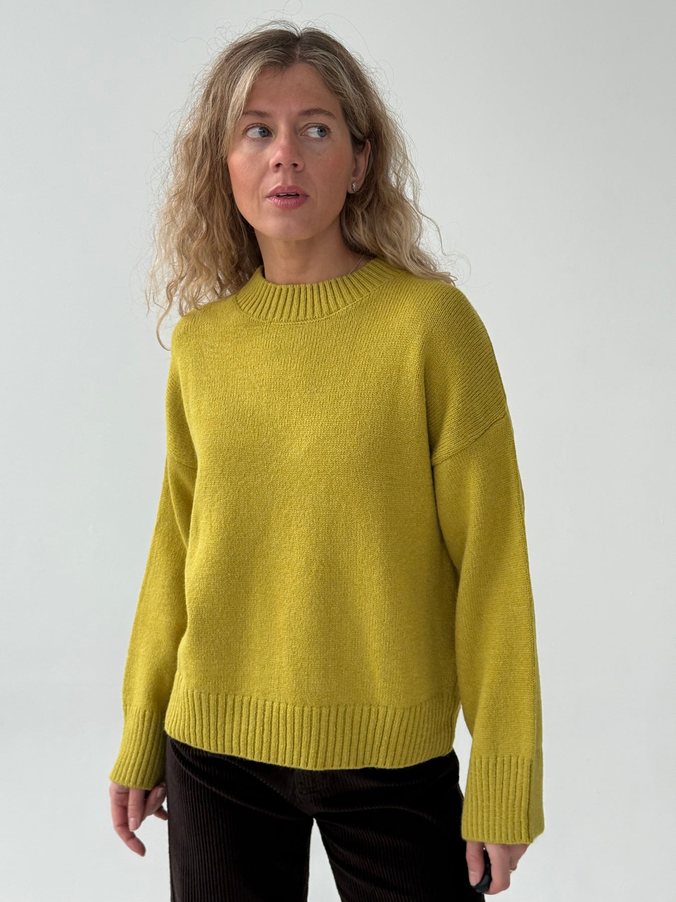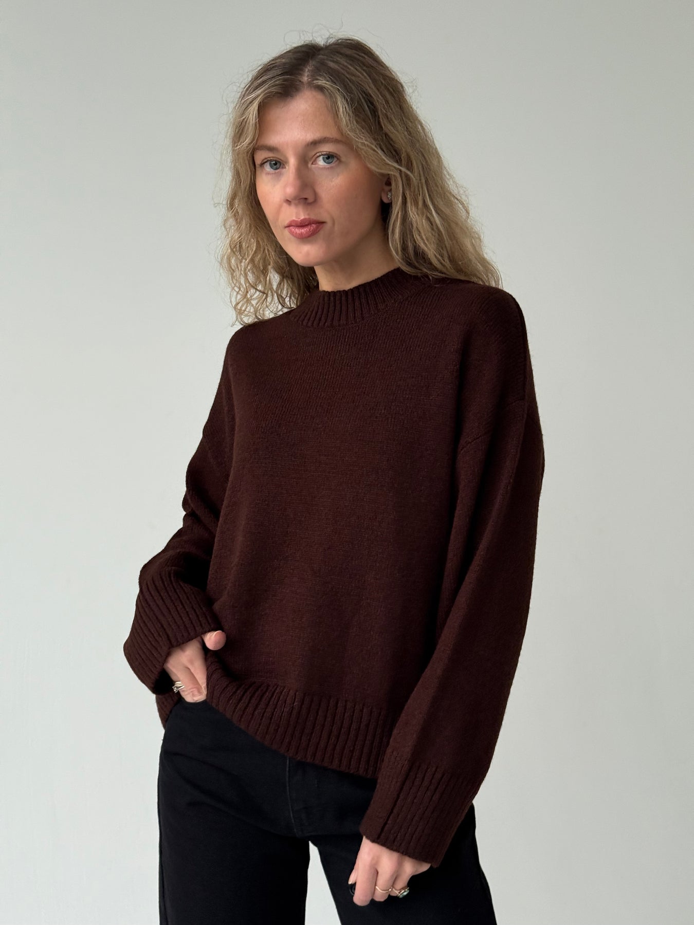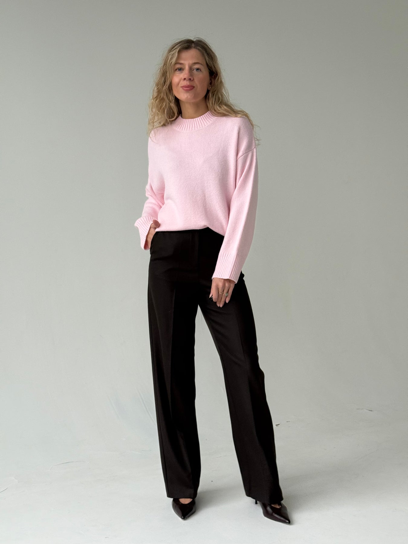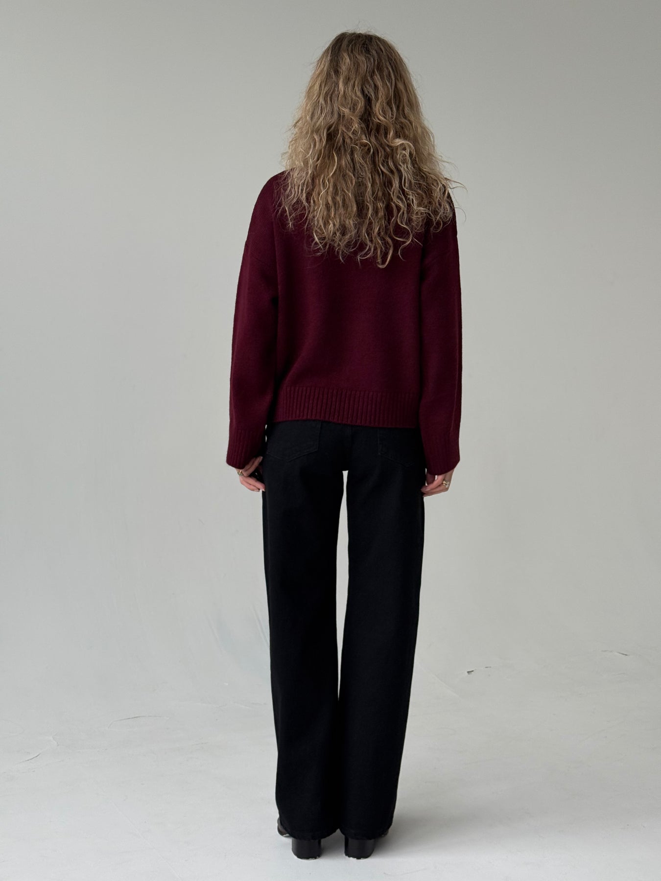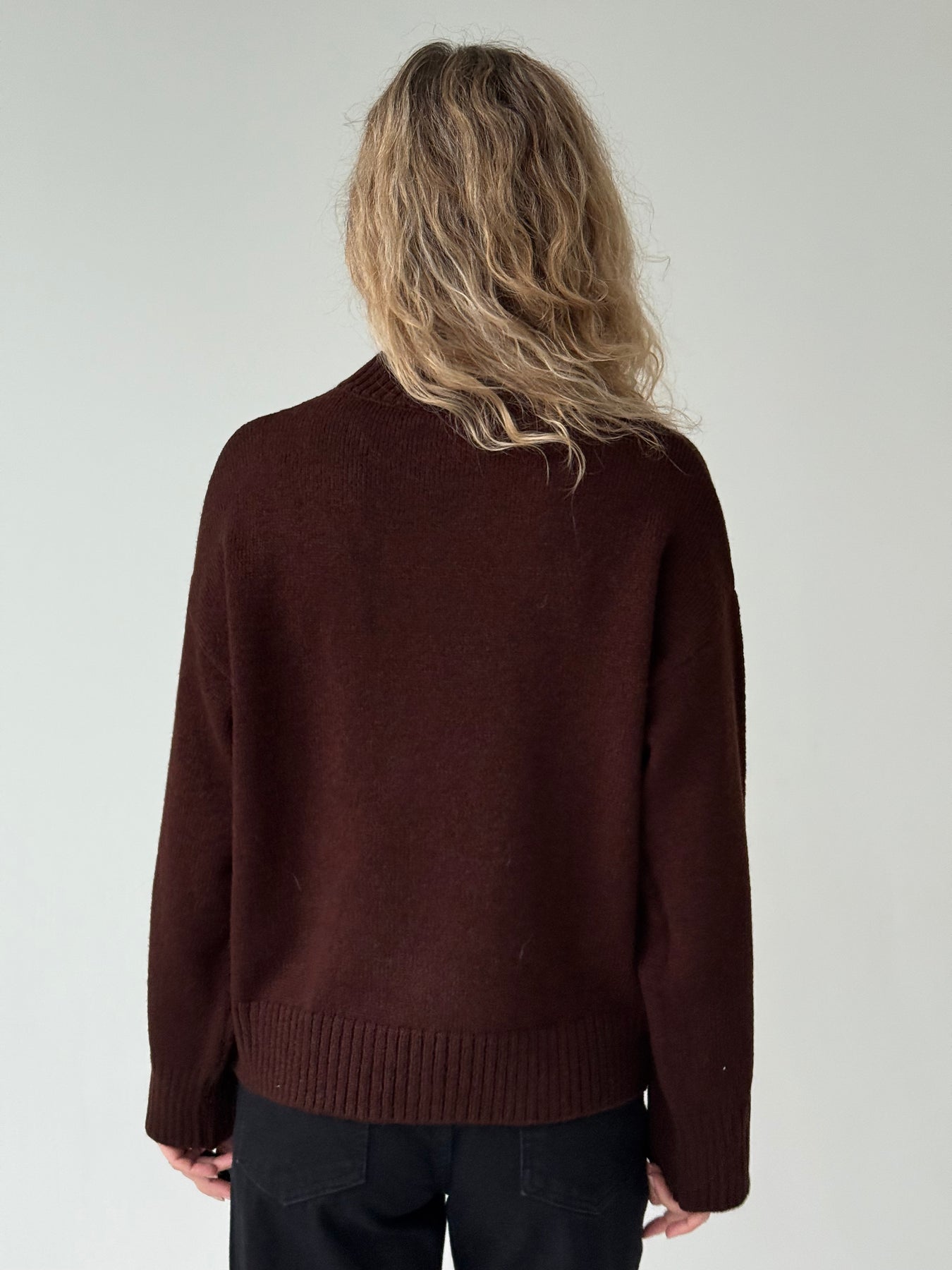 Adīts džemperis ar apaļu kakla izgriezumu, pazeminātu plecu daļu un garām piedurknēm. Džemperis ir no mīksta auduma. Džemperis ir pustaisna piegriezuma. Rievotas apmales.