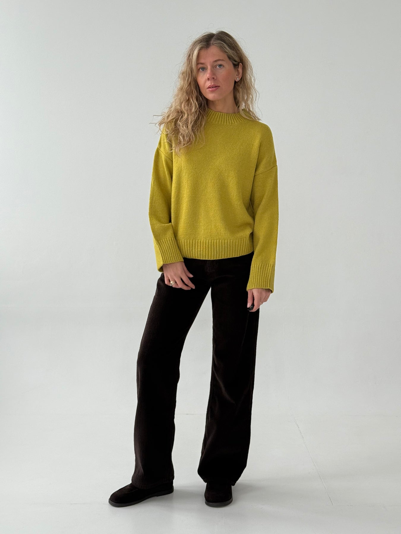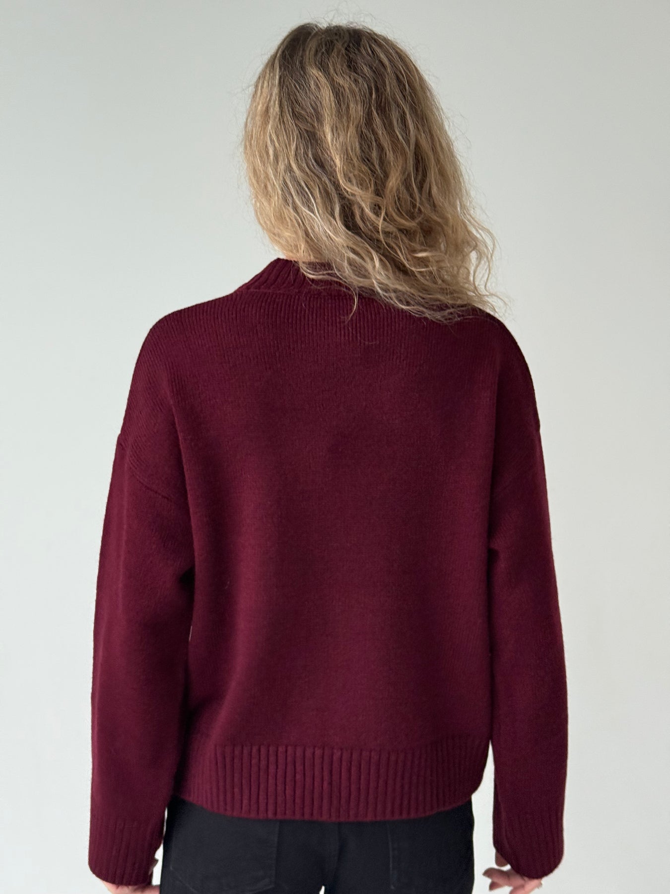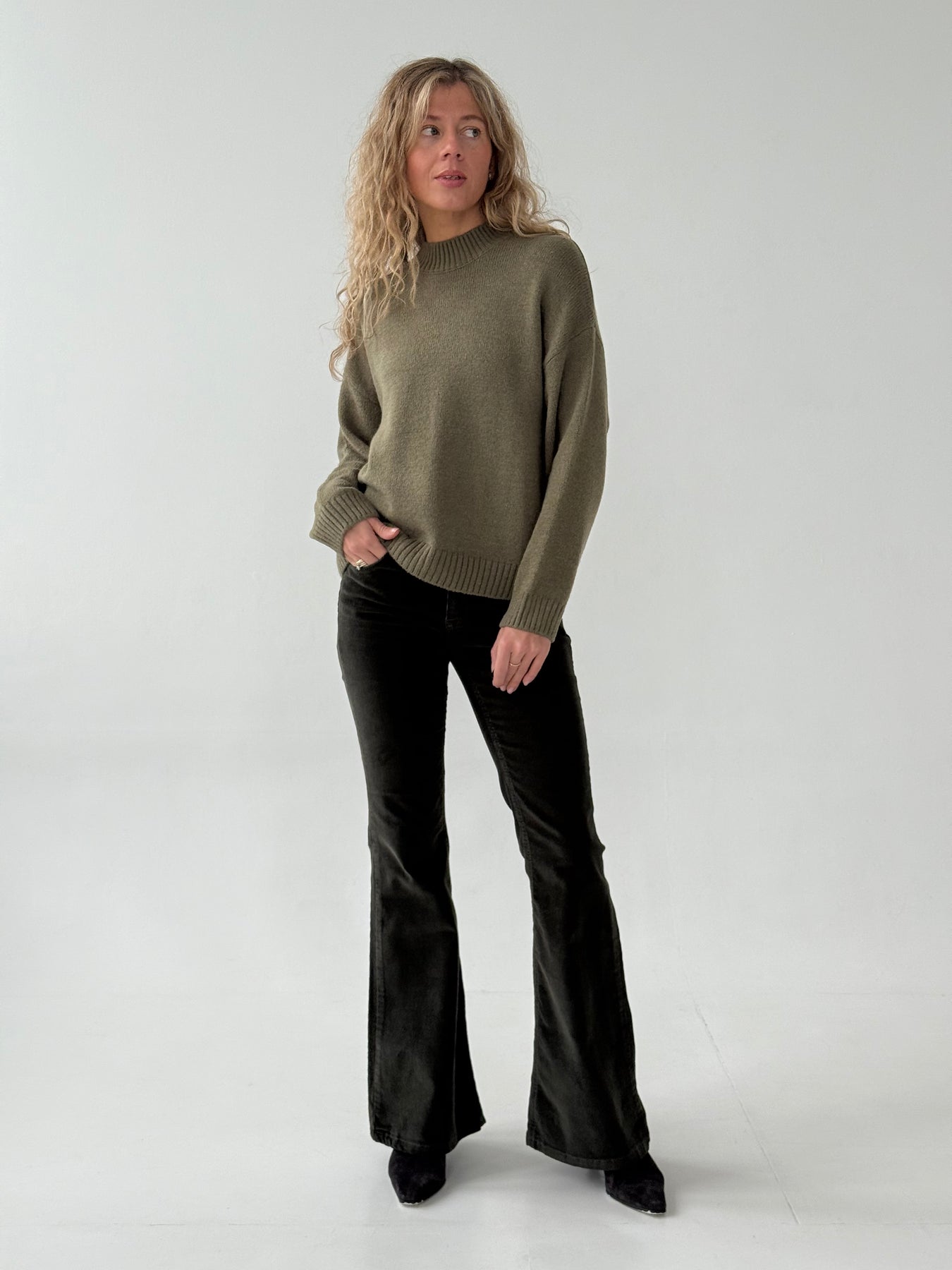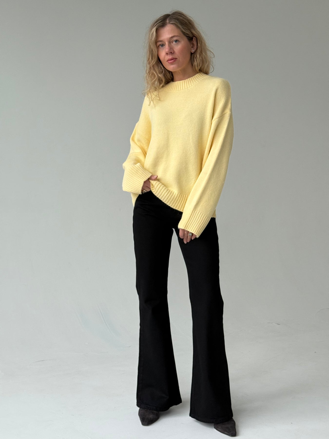 Adīts džemperis ar apaļu kakla izgriezumu, pazeminātu plecu daļu un garām piedurknēm. Džemperis ir no mīksta auduma. Džemperis ir pustaisna piegriezuma. Rievotas apmales.