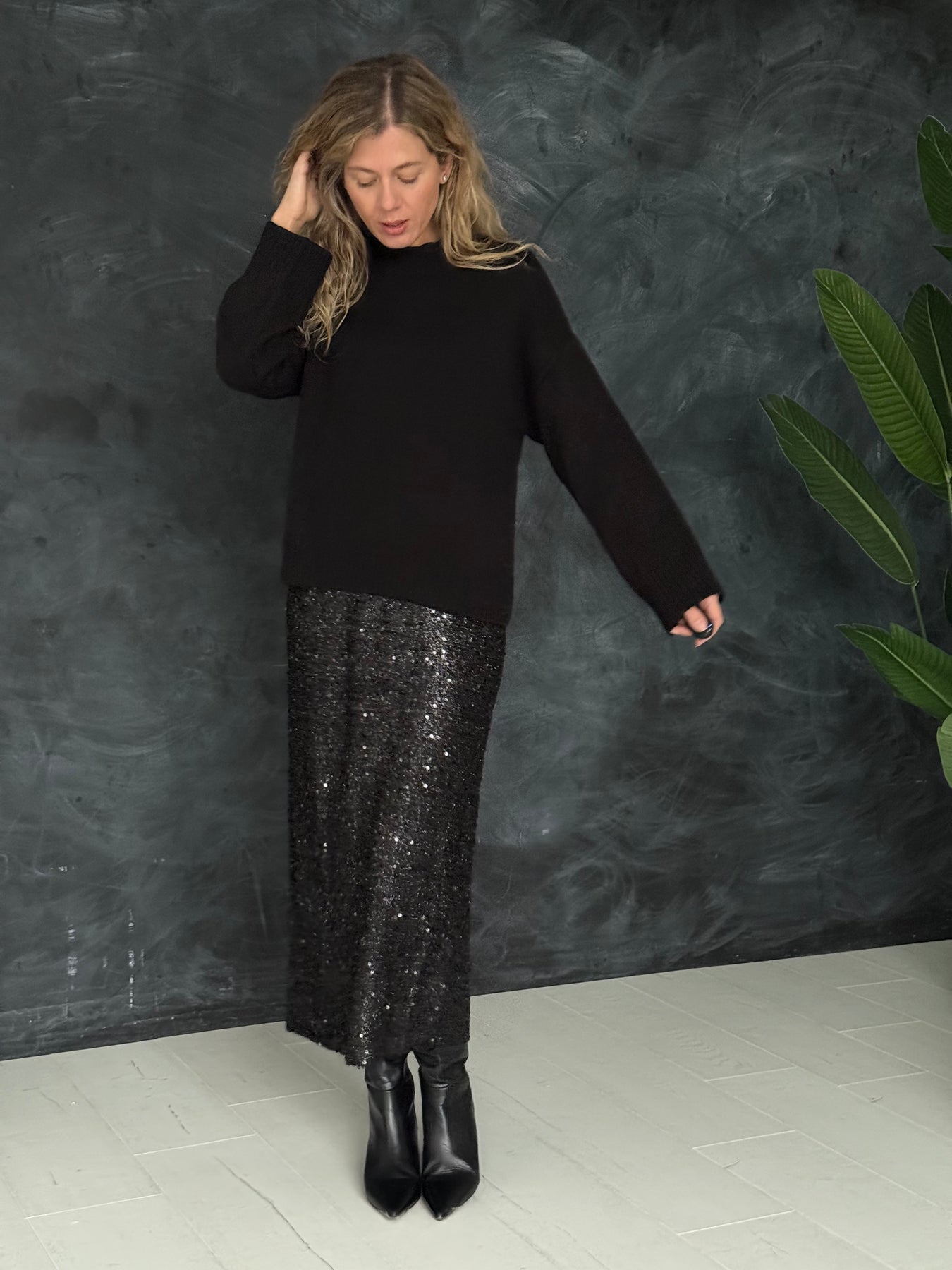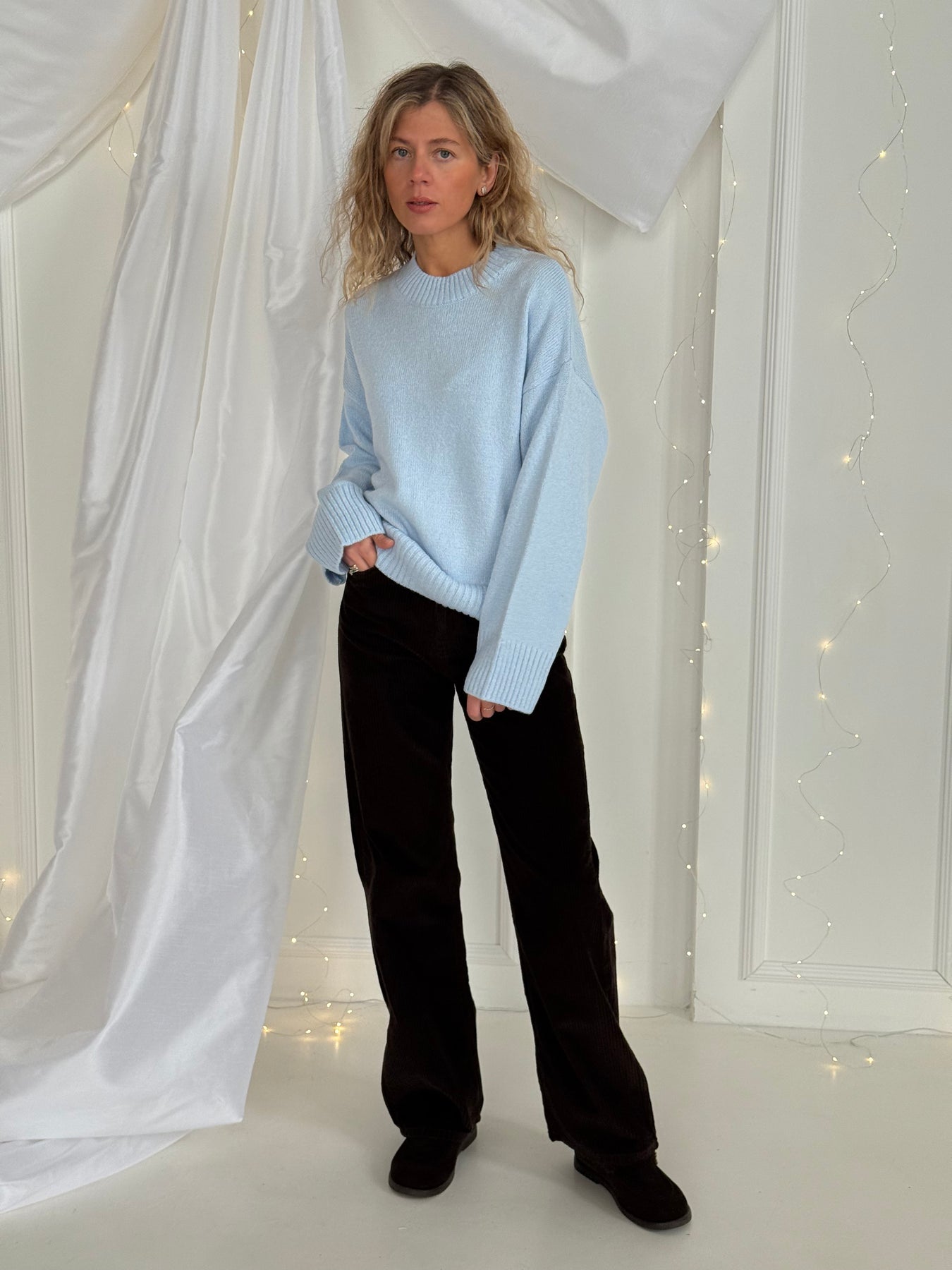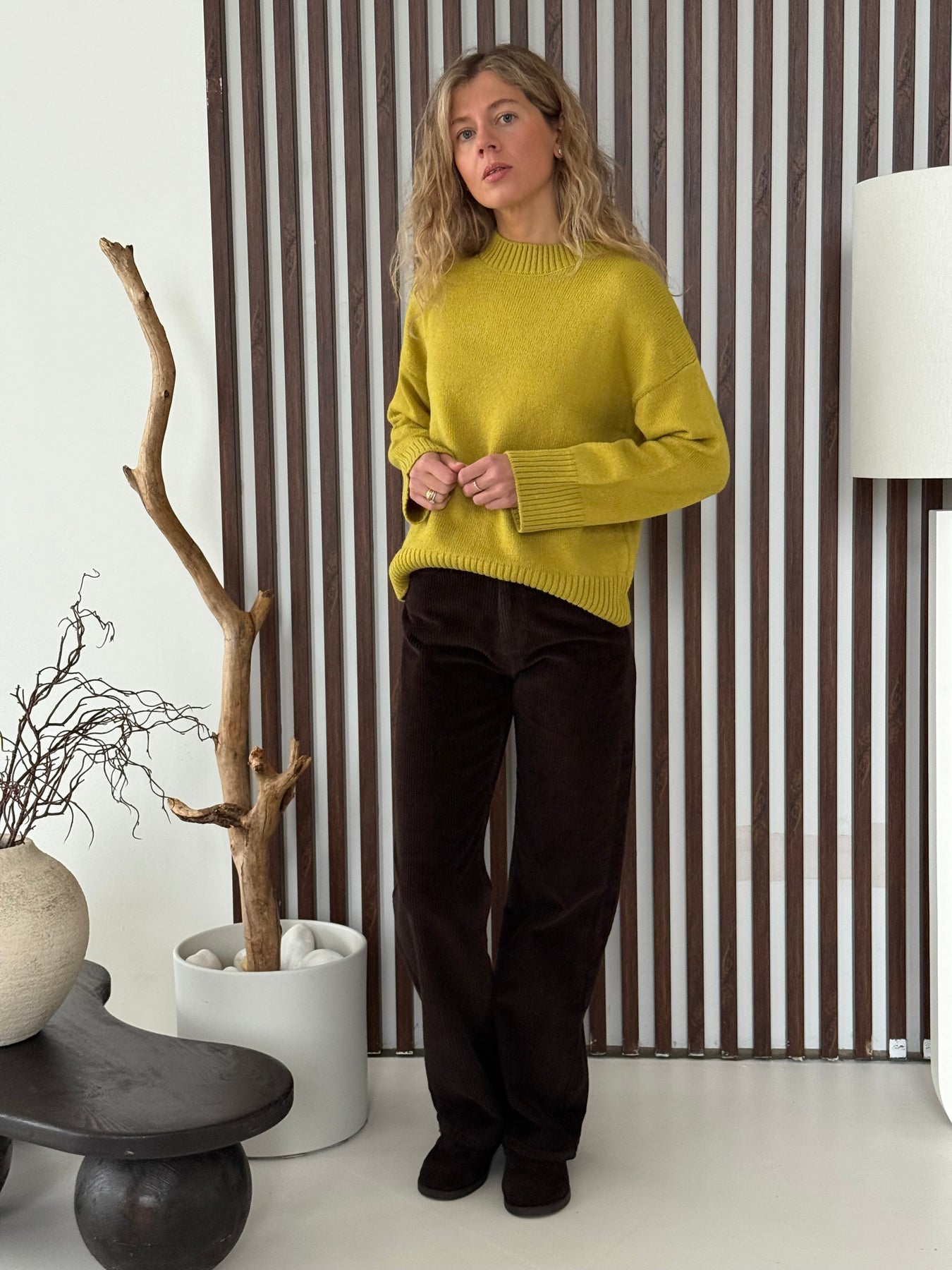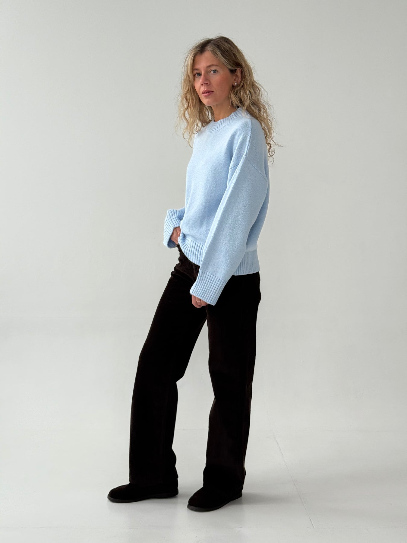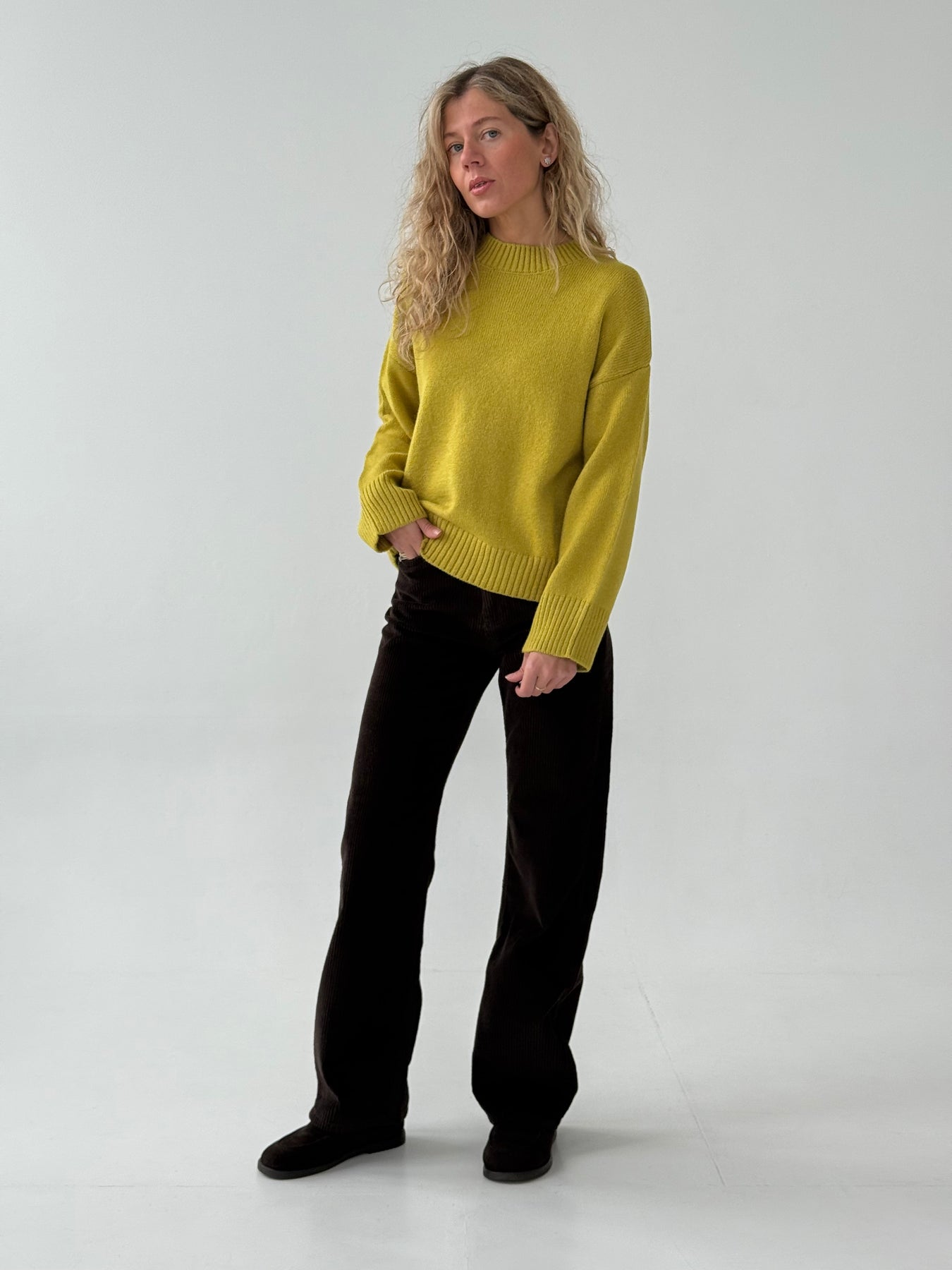 Adīts džemperis ar apaļu kakla izgriezumu, pazeminātu plecu daļu un garām piedurknēm. Džemperis ir no mīksta auduma. Džemperis ir pustaisna piegriezuma. Rievotas apmales.
