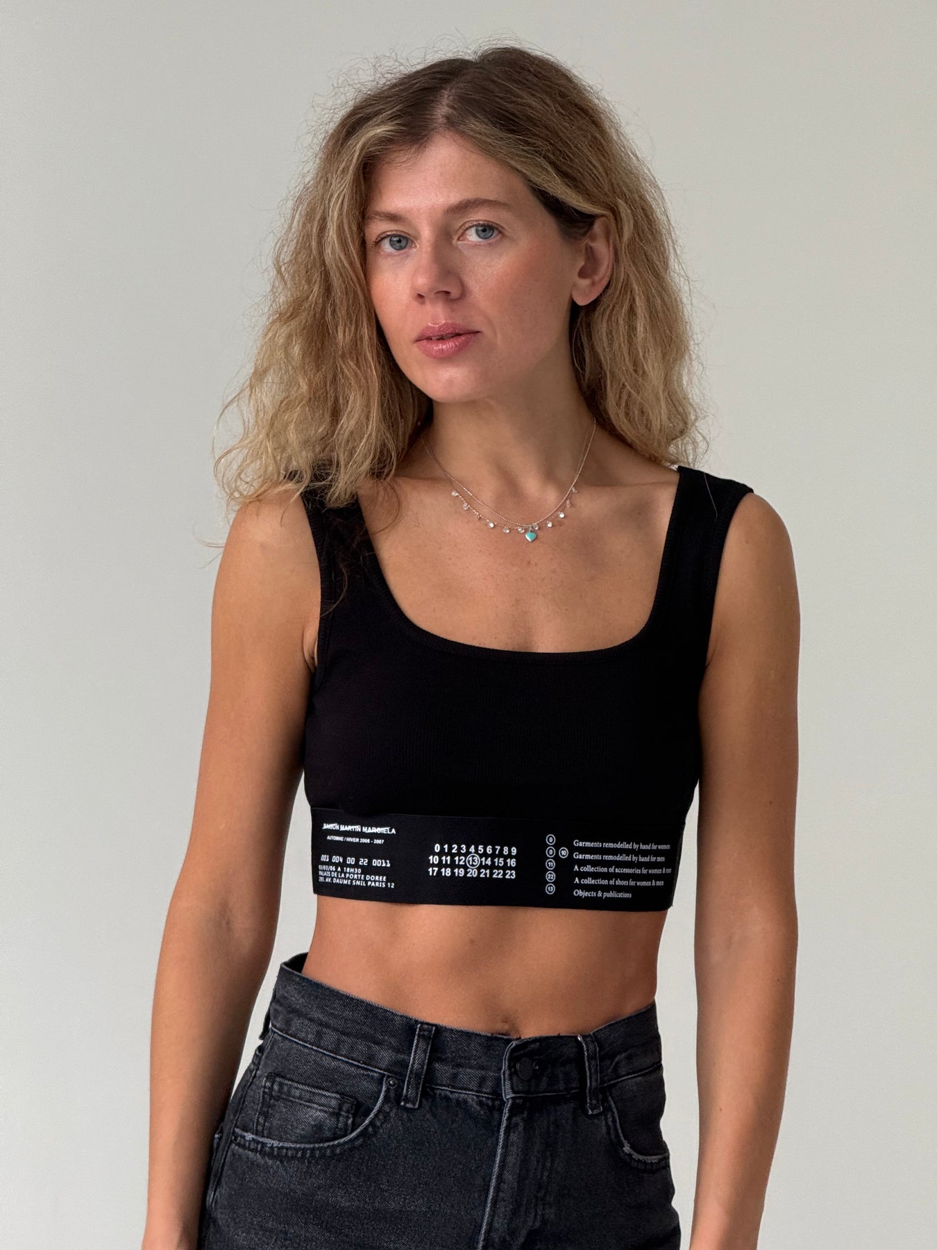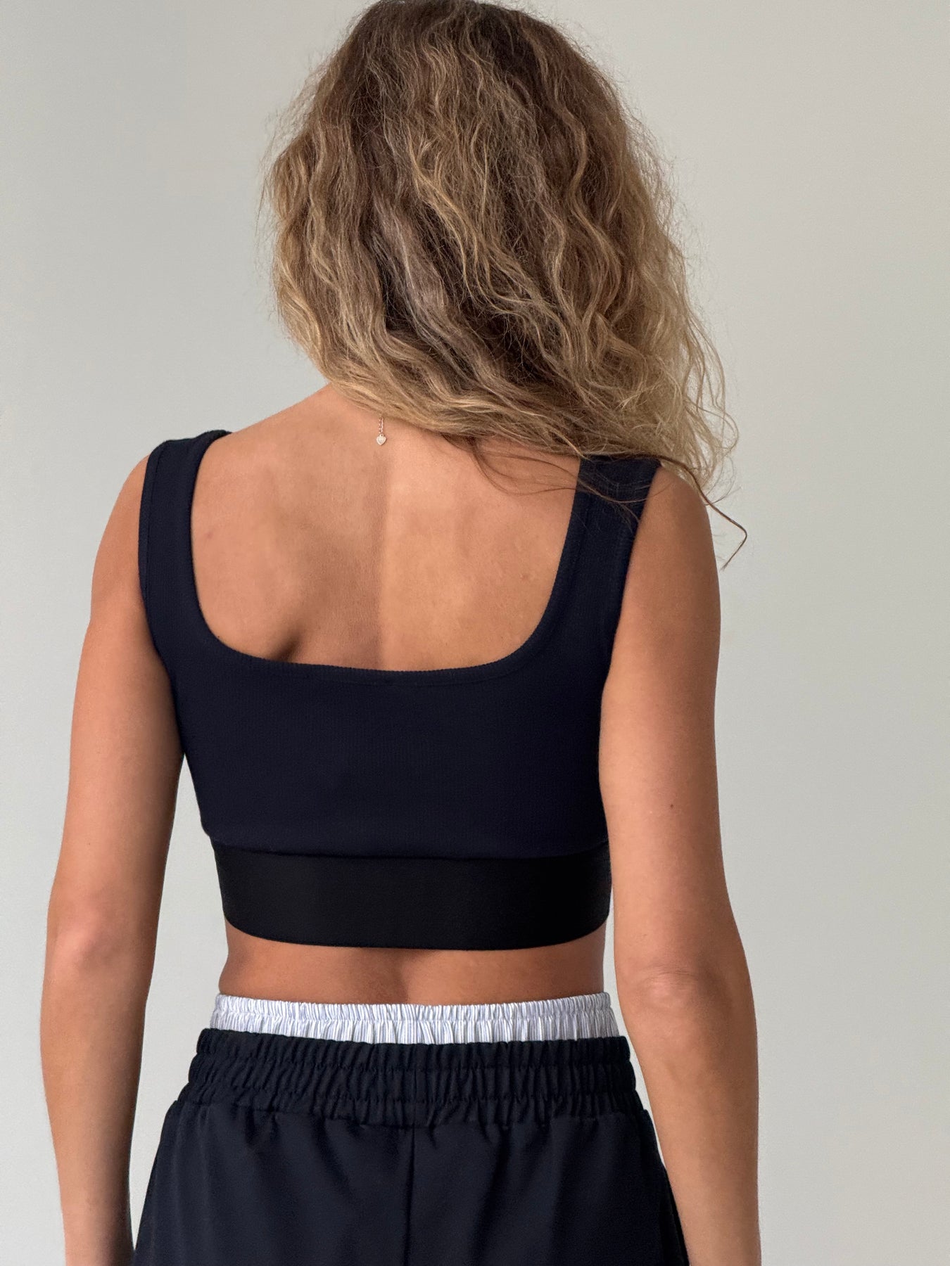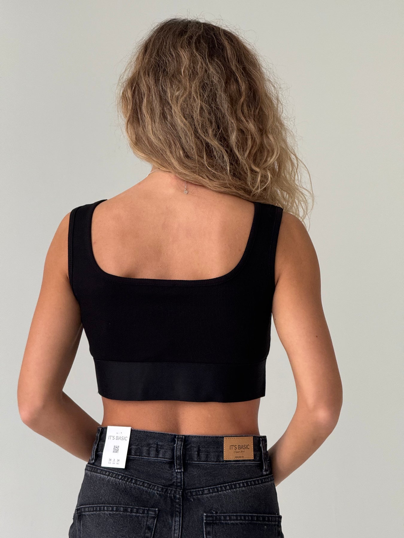 Īss kokvilnas rievots tops ar kvadrāta kakla izgriezumu un platām lencēm. Tops ir no mīksta un elastīga auduma. Tops ir pieguļoša piegriezuma.