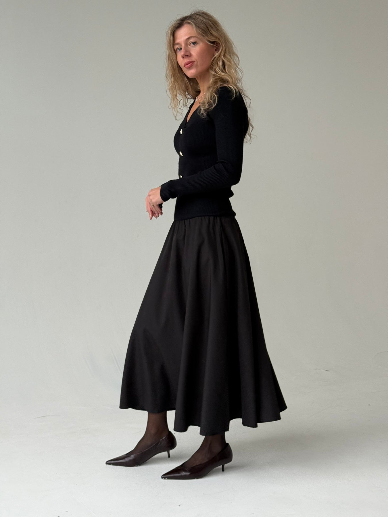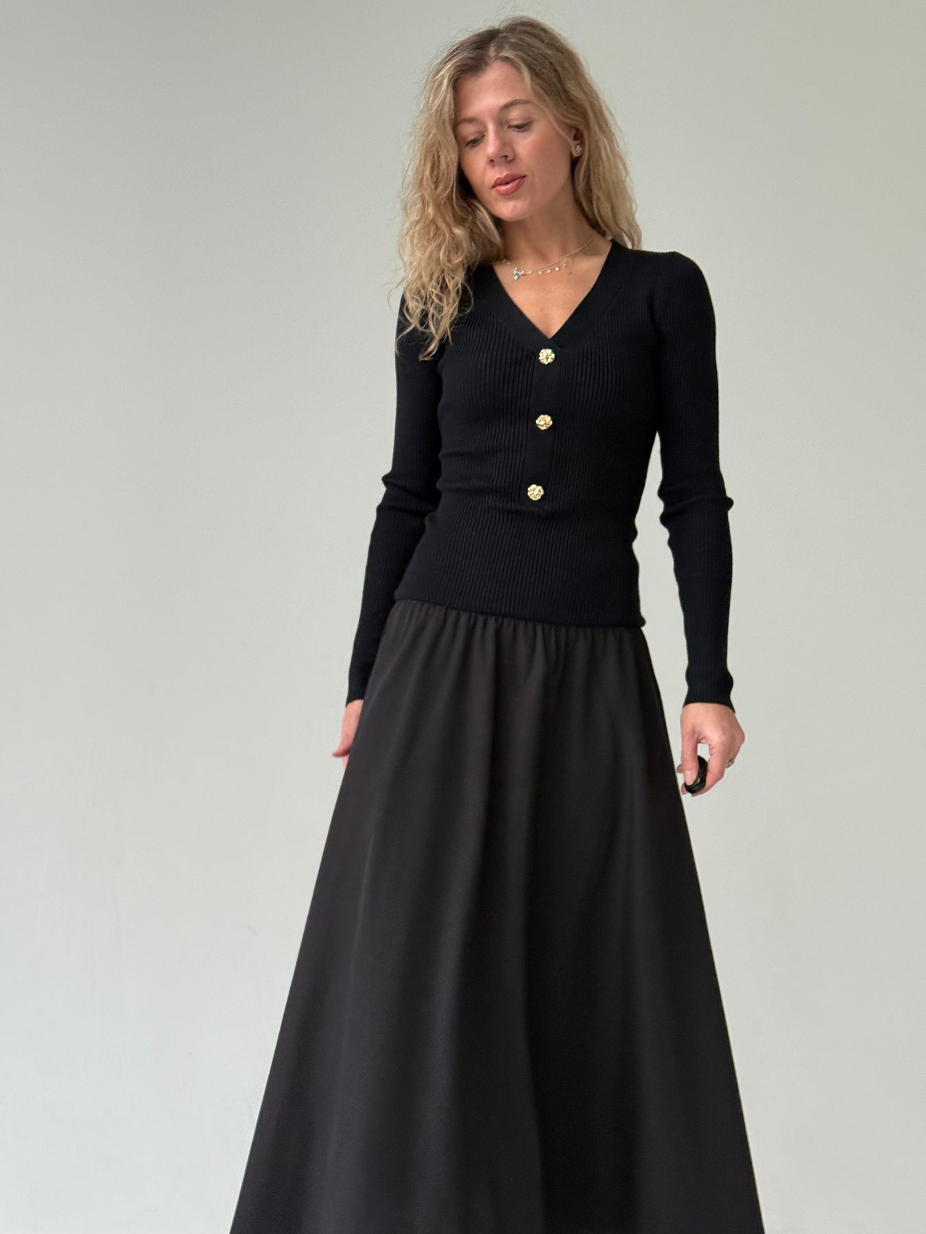 Daļēji trikotāžas kleita ar garām piedurknēm un V-veida kakla izgriezumu. Kleita ir no mīksta un elastīga auduma. Priekšpusē ir dekoratīvas pogas. Kleita ir puspieguļoša piegriezuma.