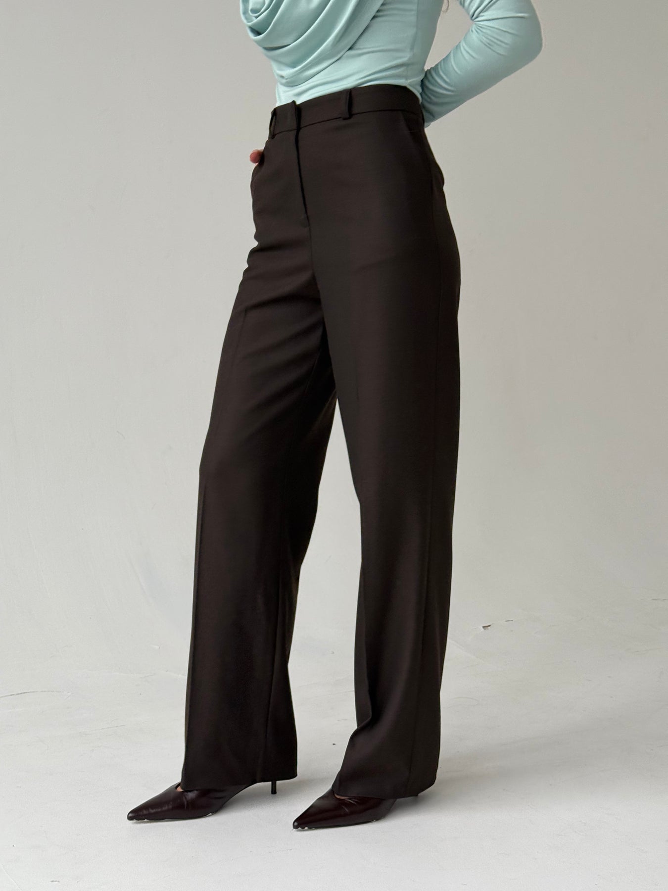 Viskozes taisnas bikses ar augstu jostasvietu. Bikses ir no mīksta auduma. Sānos ir divas kabatas. Aiztaisās ar rāvējslēdzēju un ar neredzamu pogu jostasvietā. Bikses ir taisna piegriezuma.