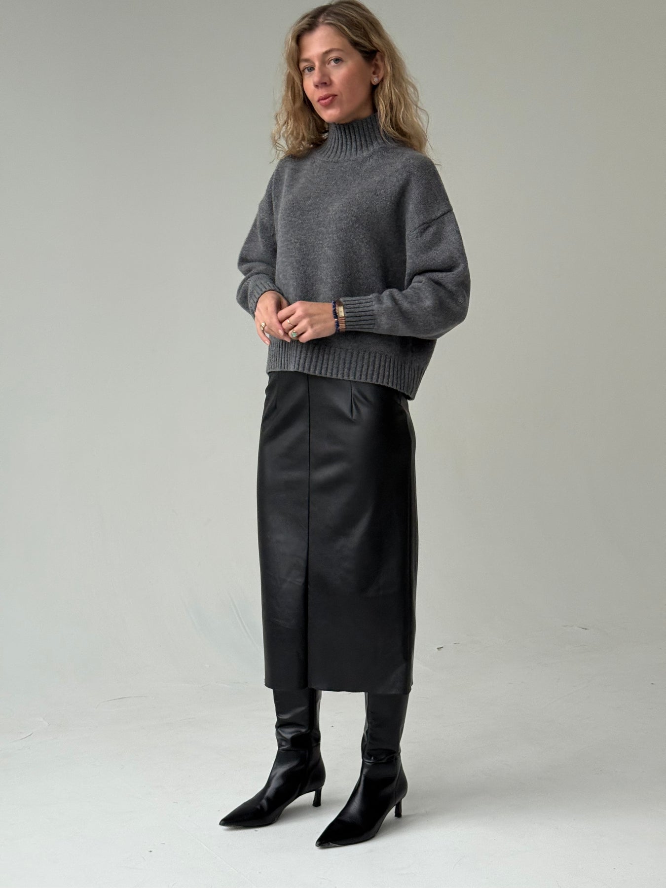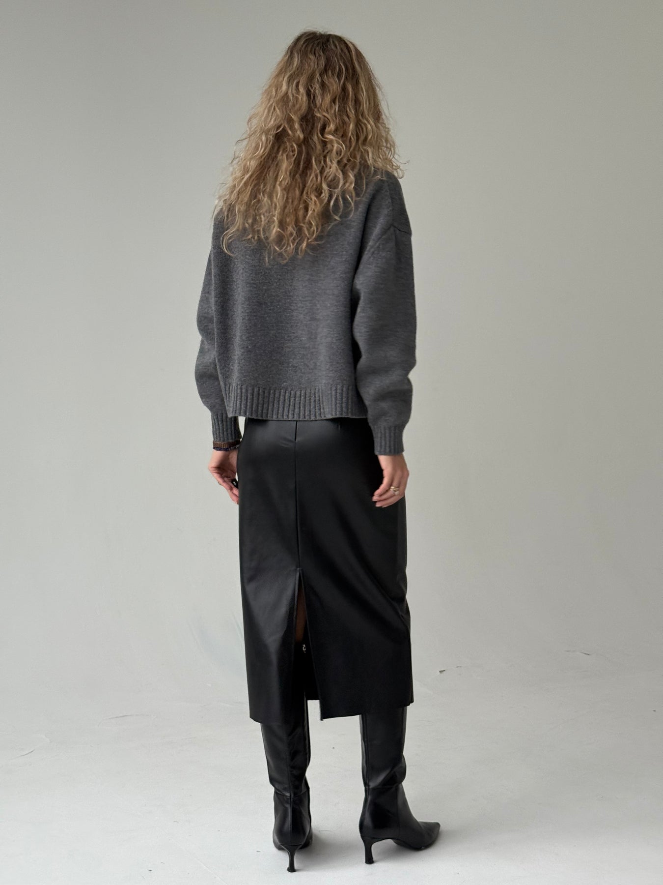 Klasiski ādas imitācijas svārki ar šķēlumu aizmugurē un paaugstinātu jostasvietu. Aiztaisās ar neredzamu rāvējslēdzēju mugurpusē. Svārki ir puspieguļoša piegriezuma.