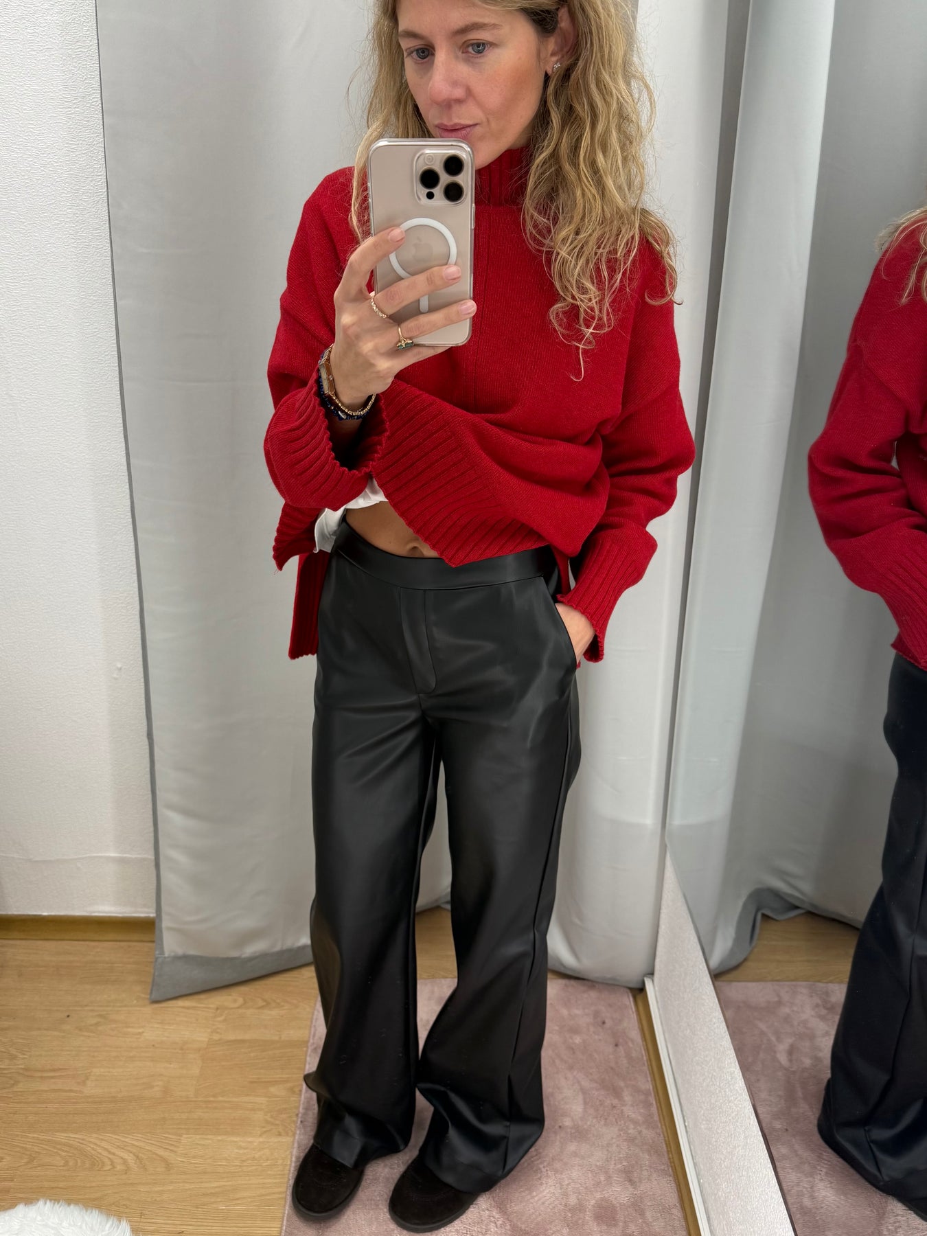 Augstas kvalitātes ādas imitācijas bikses ar vidēji augstu jostasvietu un mīkstu iekšpusi. Bikses ir no mīksts un elastīga auduma. Aiztaisās ar neredzamo rāvējslēdzēju sānā. Bikses ir taisna piegriezuma.