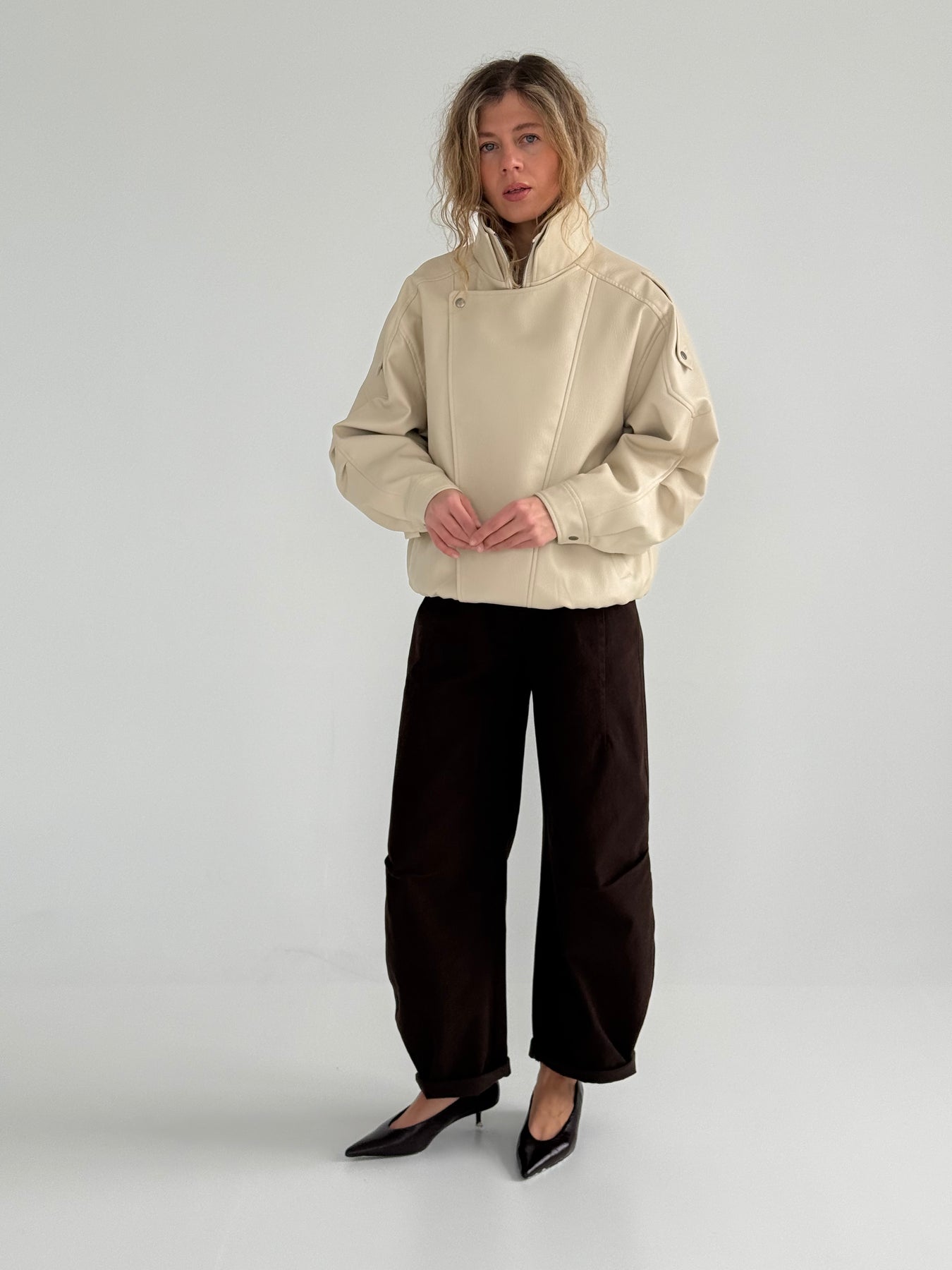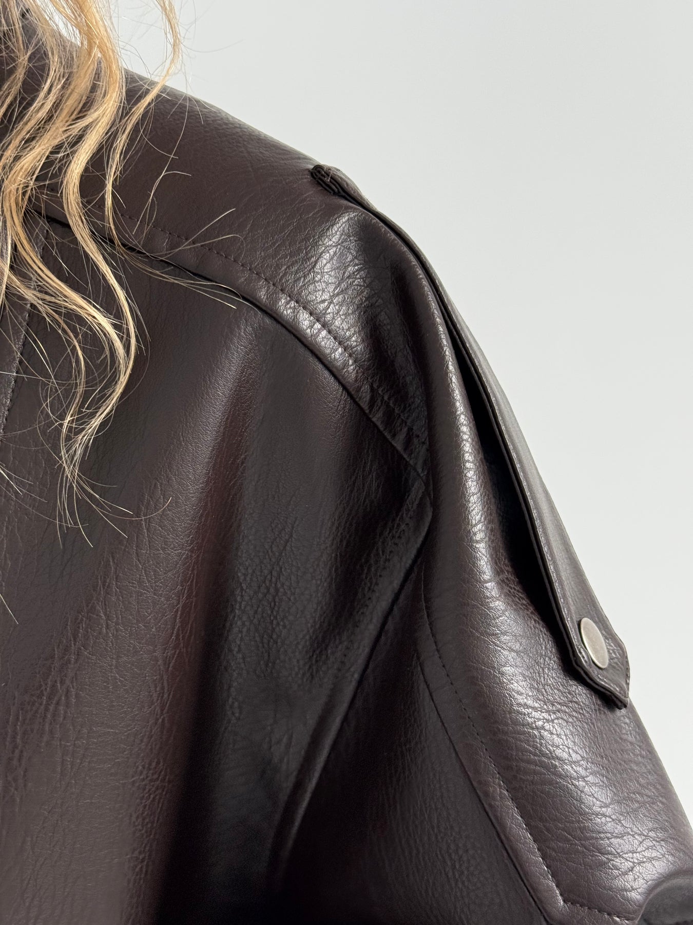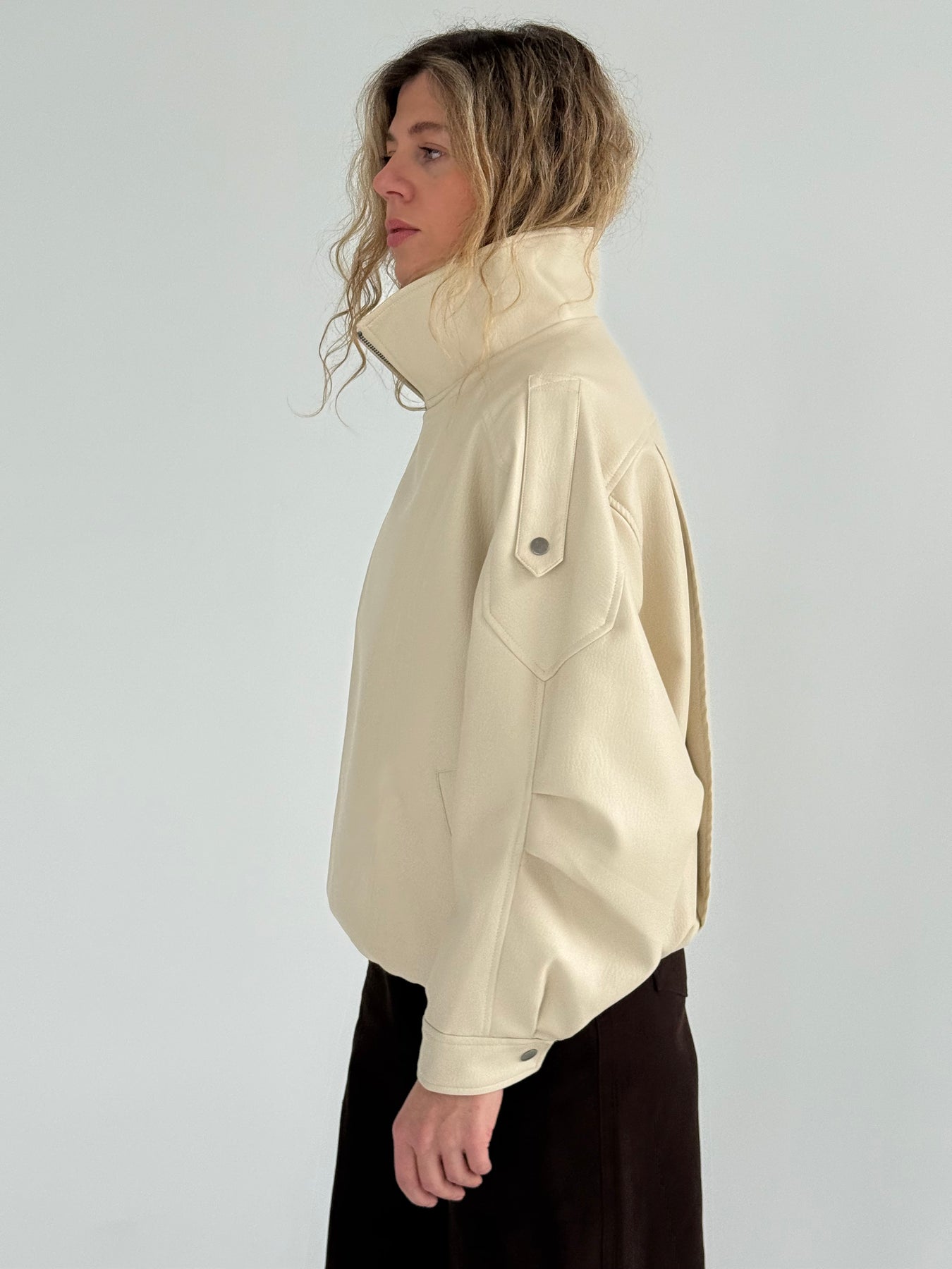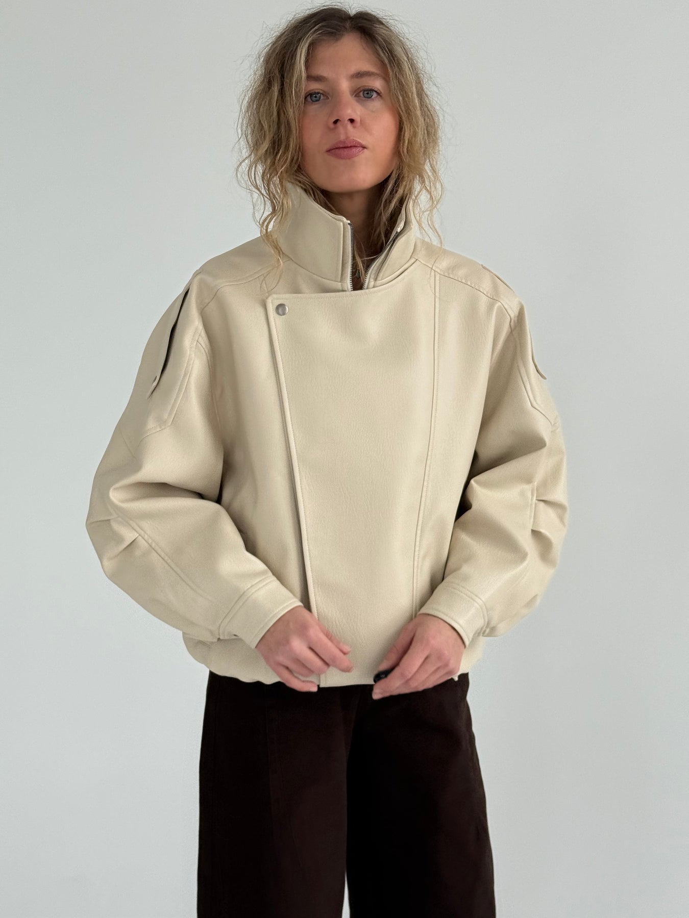 Ādas imitācijas bomber stila virsjaka ar oderi un augstu apkakli. Virsjaka ar pazeminātu plecu daļu. Sānos ir divas kabatas. Rāvējslēdzēja un spiedpogu aizdare priekšpusē. Virsjaka ir brīva piegriezuma.