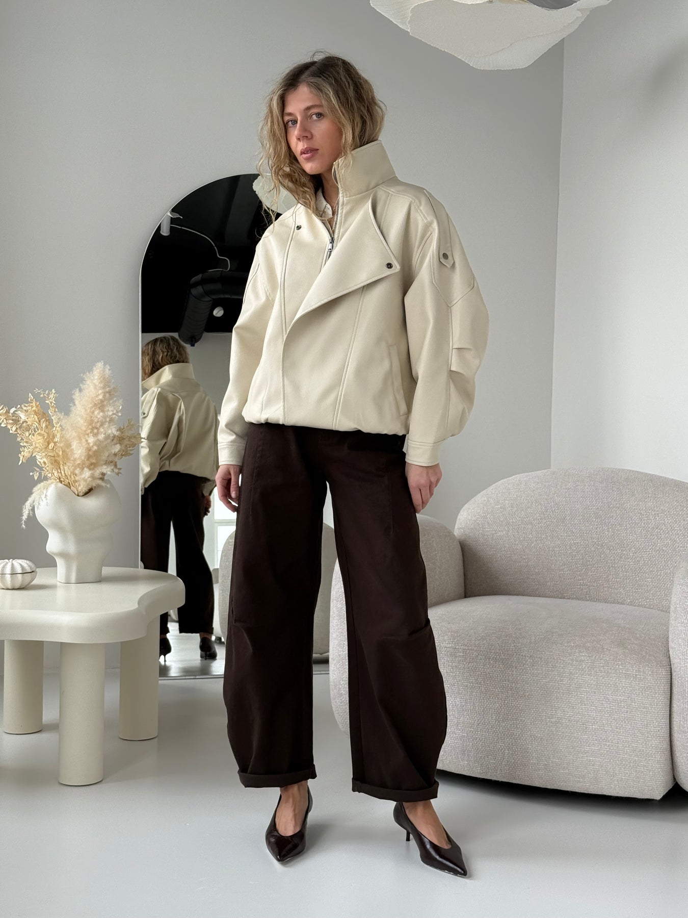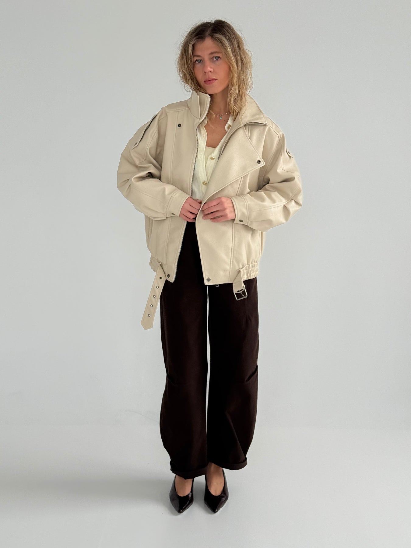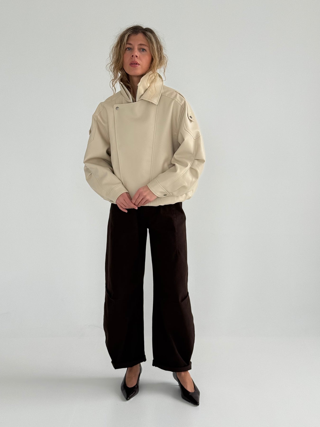 Ādas imitācijas bomber stila virsjaka ar oderi un augstu apkakli. Virsjaka ar pazeminātu plecu daļu. Sānos ir divas kabatas. Rāvējslēdzēja un spiedpogu aizdare priekšpusē. Virsjaka ir brīva piegriezuma.