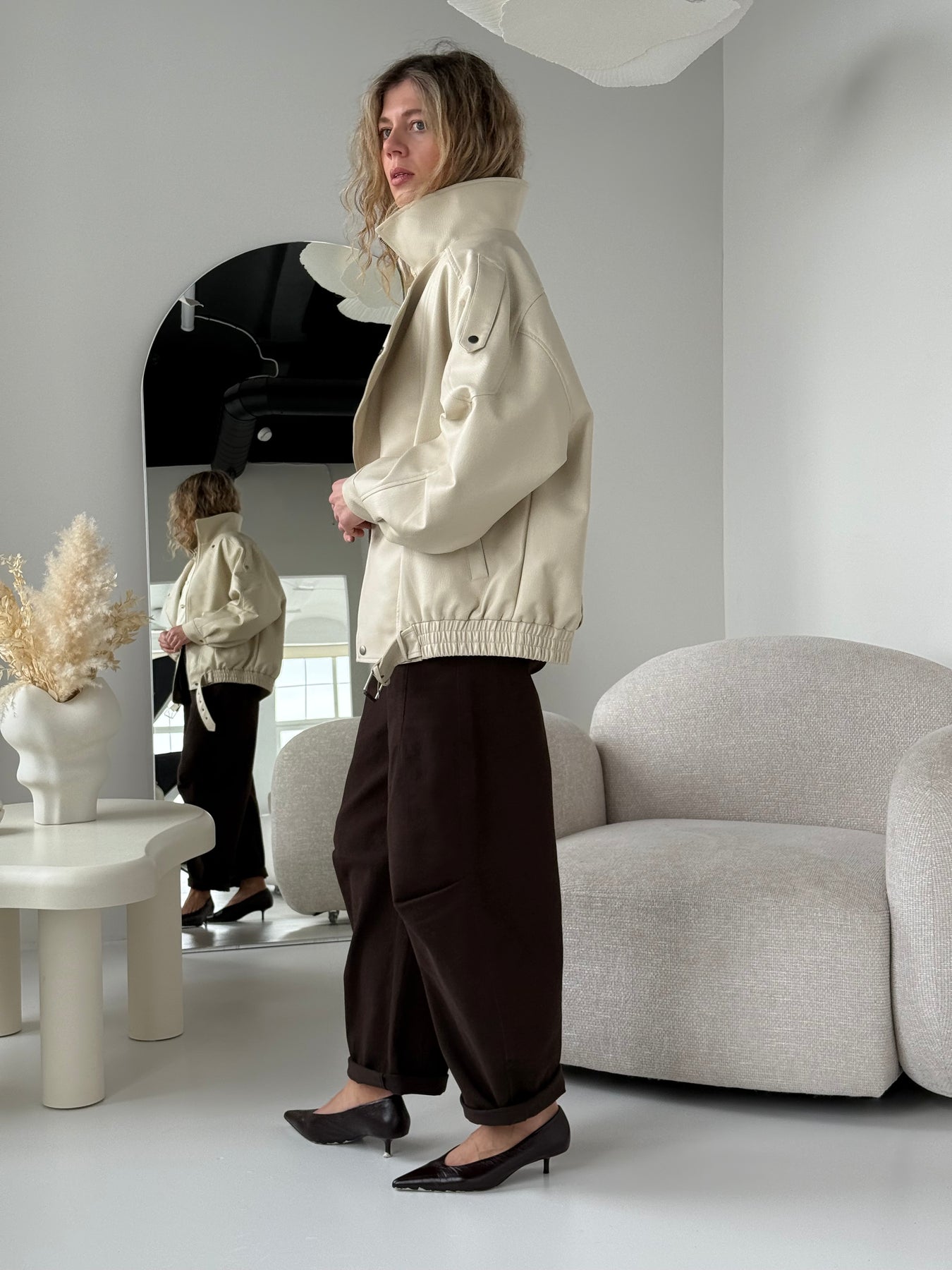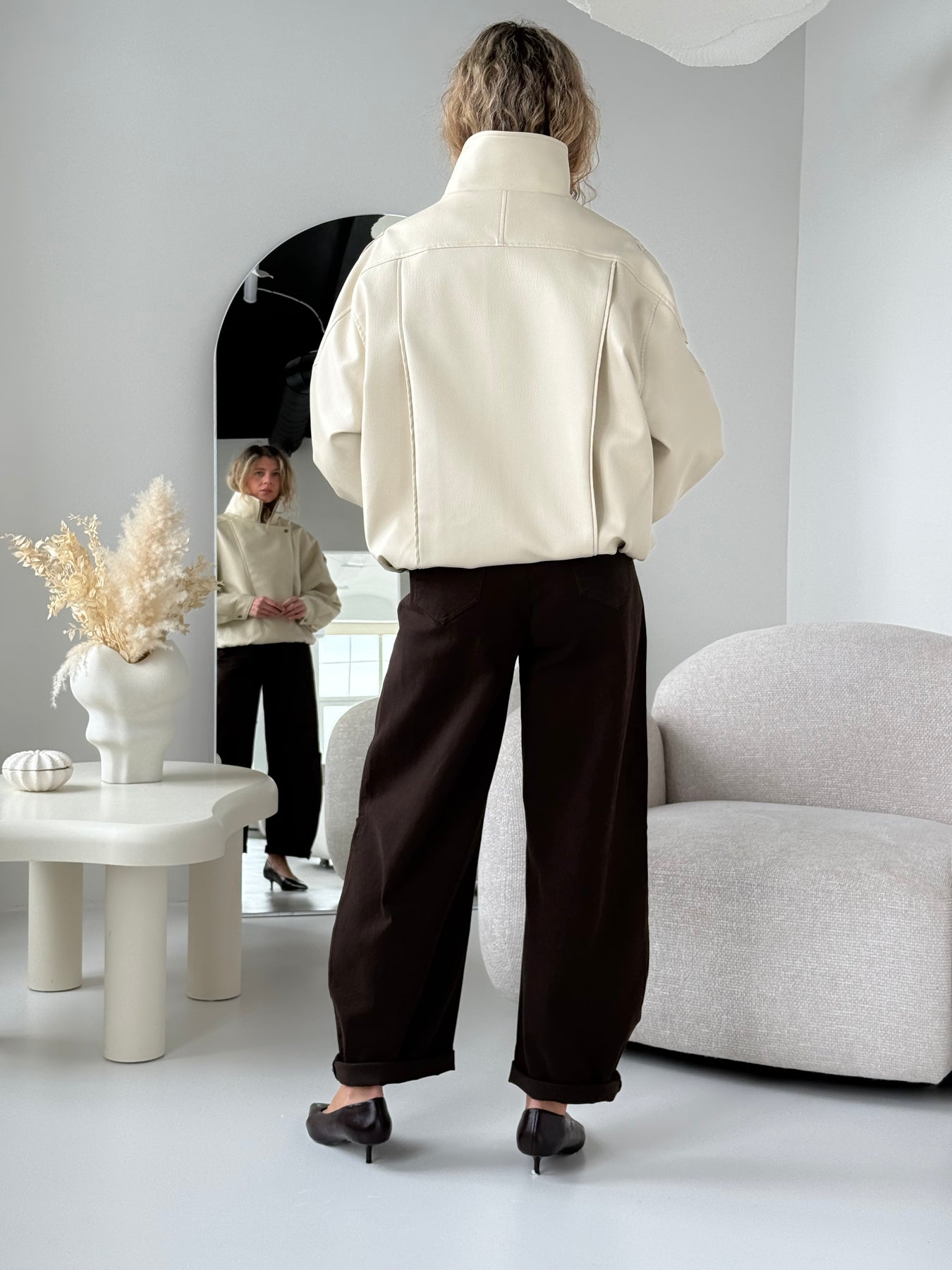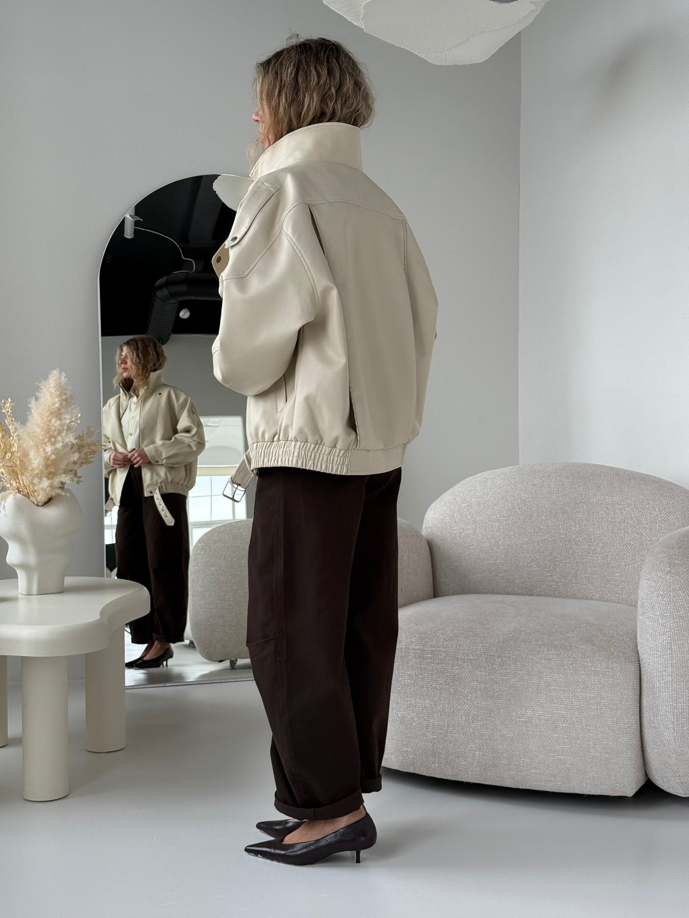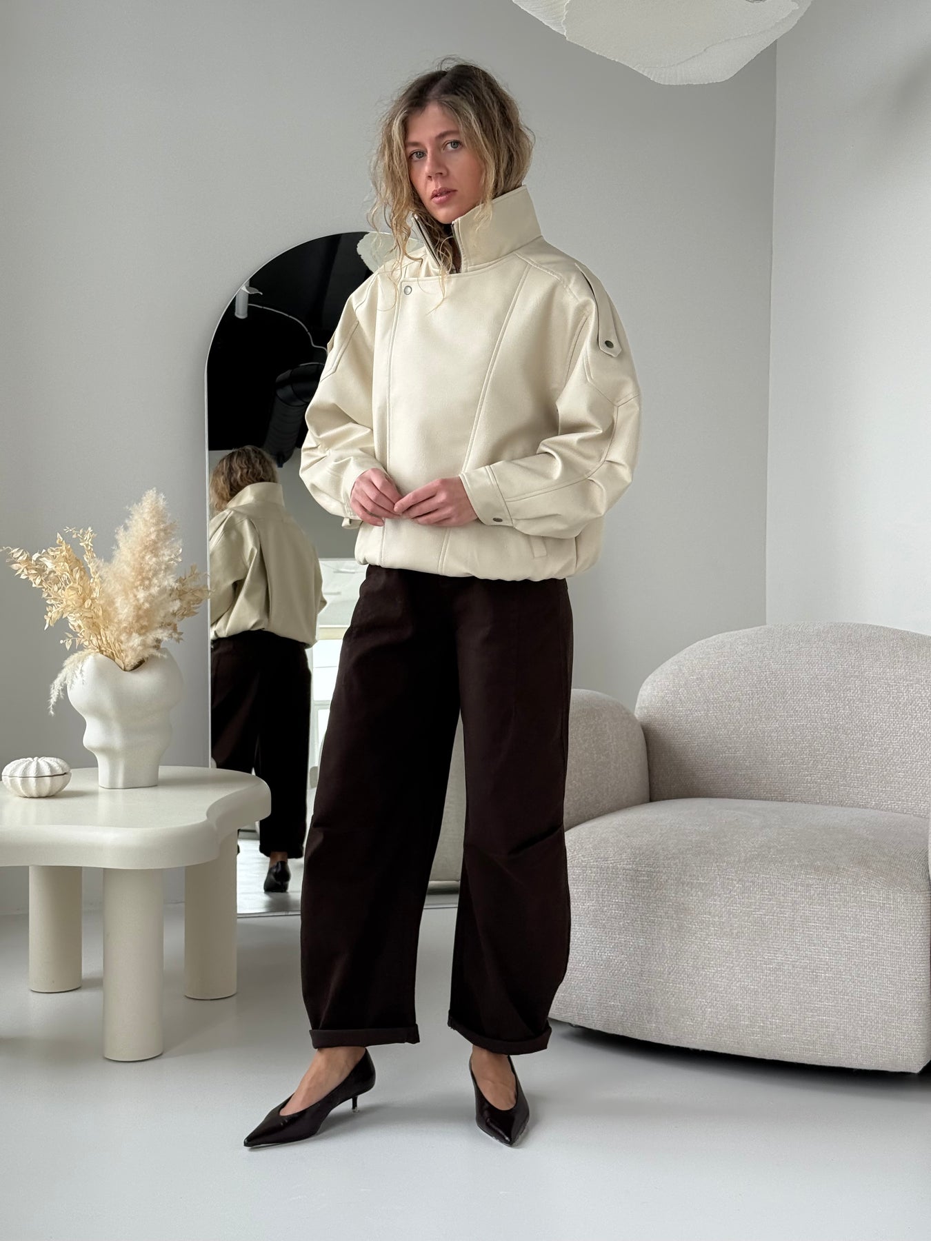 Ādas imitācijas bomber stila virsjaka ar oderi un augstu apkakli. Virsjaka ar pazeminātu plecu daļu. Sānos ir divas kabatas. Rāvējslēdzēja un spiedpogu aizdare priekšpusē. Virsjaka ir brīva piegriezuma.