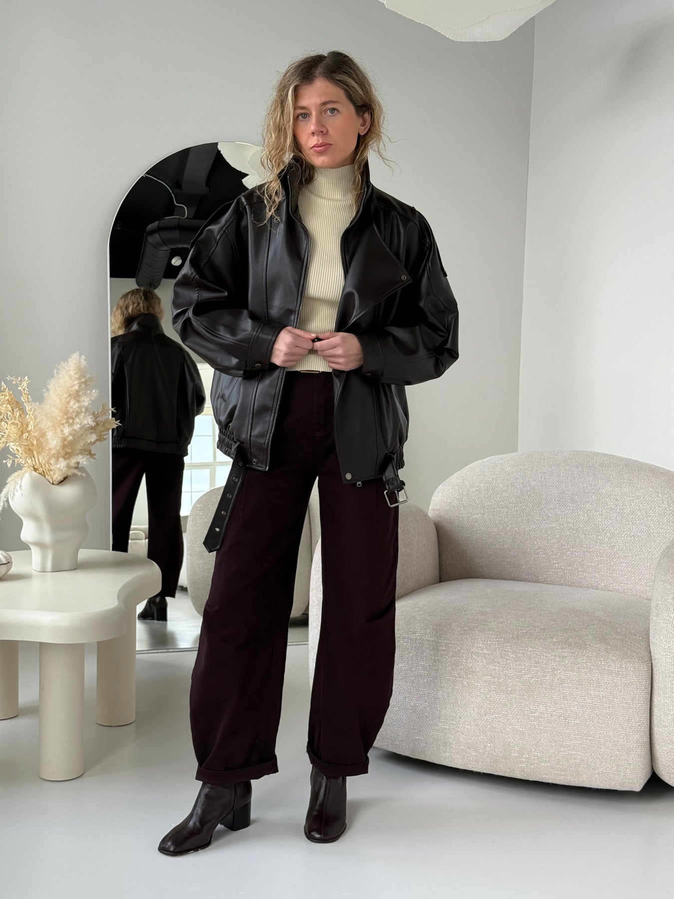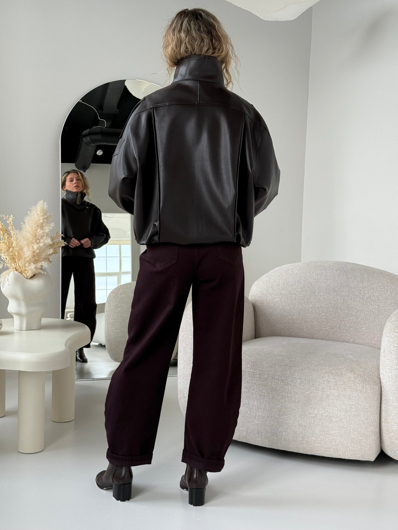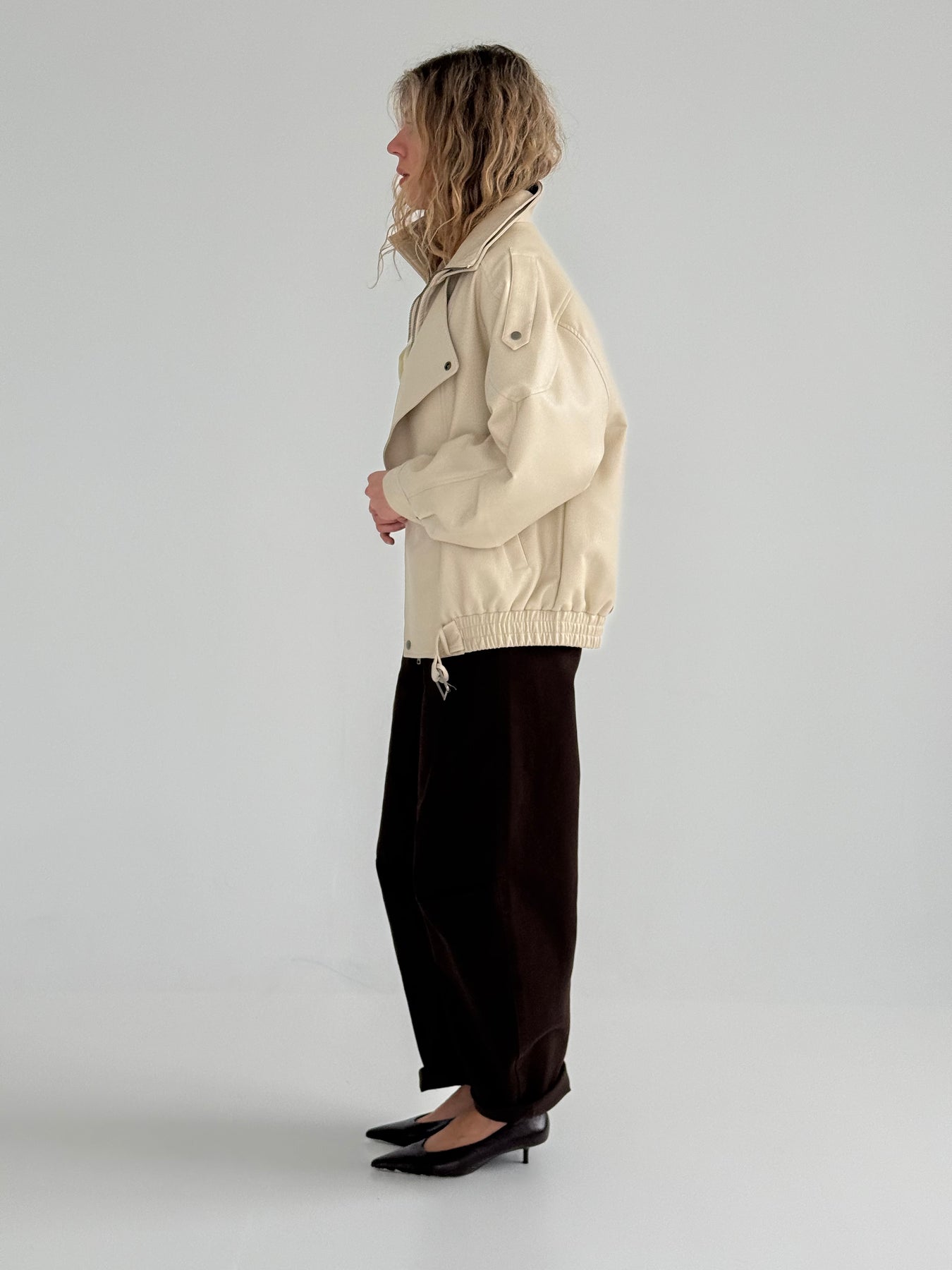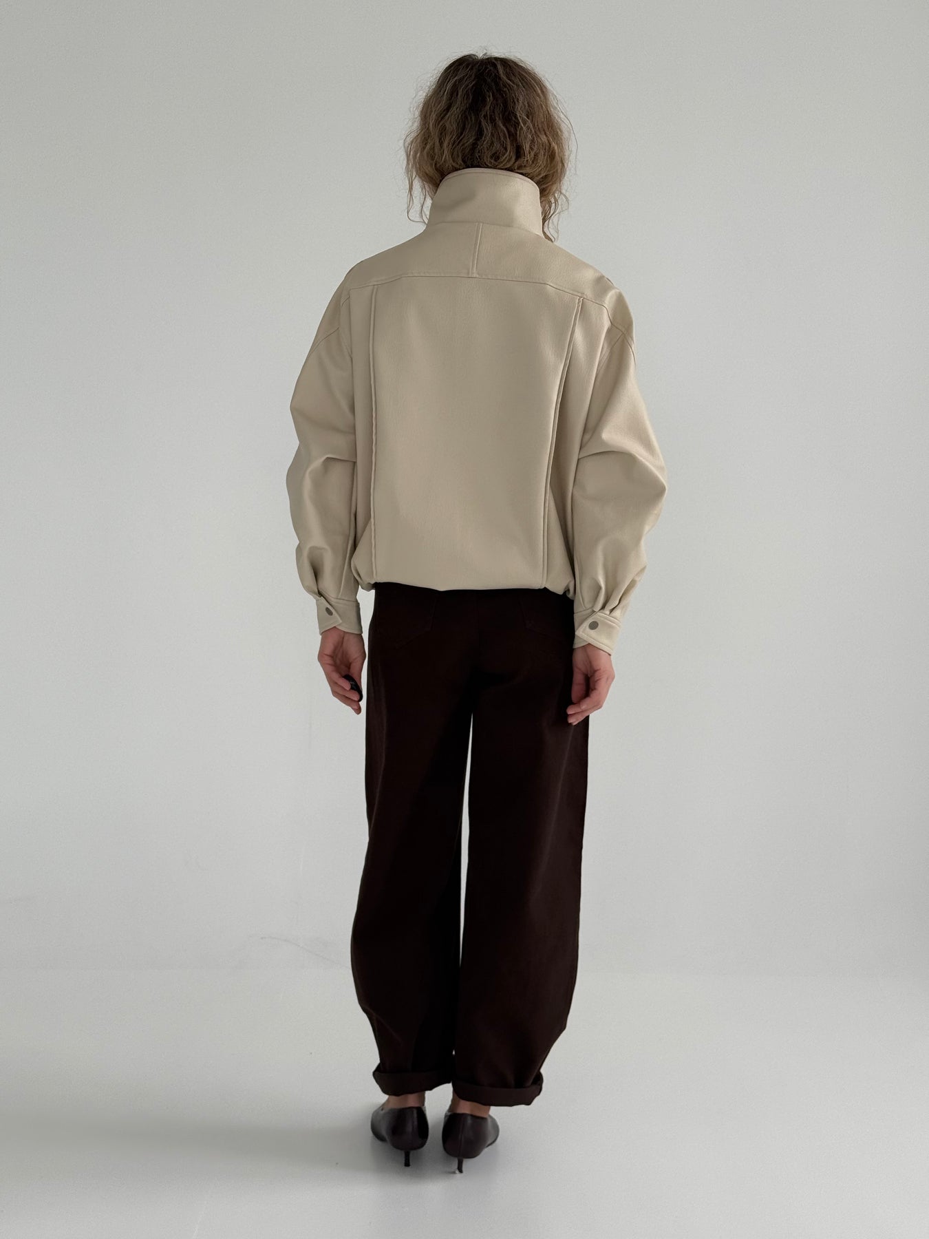 Ādas imitācijas bomber stila virsjaka ar augstu apkakli